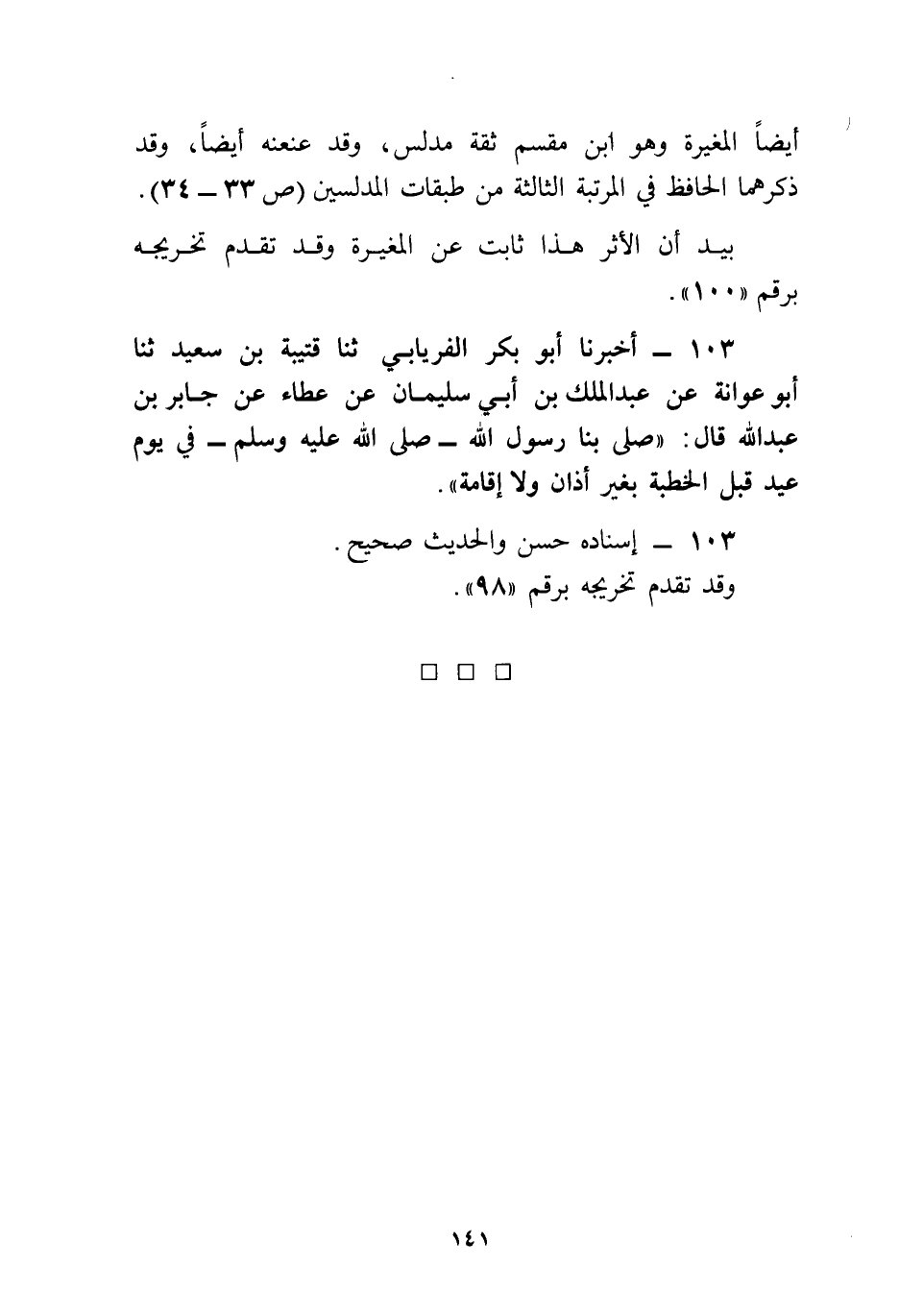 103 - أَخْبَرَنَا أَبُو بَكْرٍ الْفِرْيَابِيُّ، ثنا قُتَيْبَةُ بْنُ سَعِيدٍ، ثنا أَبُو عَوَانَةَ، عَنْ عَبْدِ الْمَلِكِ بْنِ أَبِي سُلَيْمَانَ، عَنْ عَطَاءٍ، عَنْ جَابِرِ بْنِ عَبْدِ اللَّهِ، قَالَ: «§صَلَّى بِنَا رَسُولُ اللَّهِ صَلَّى اللهُ عَلَيْهِ وَسَلَّمَ فِي يَوْمِ عِيدٍ قَبْلَ الْخُطْبَةِ بِغَيْرِ أَذَانٍ وَلَا إِقَامَةٍ»