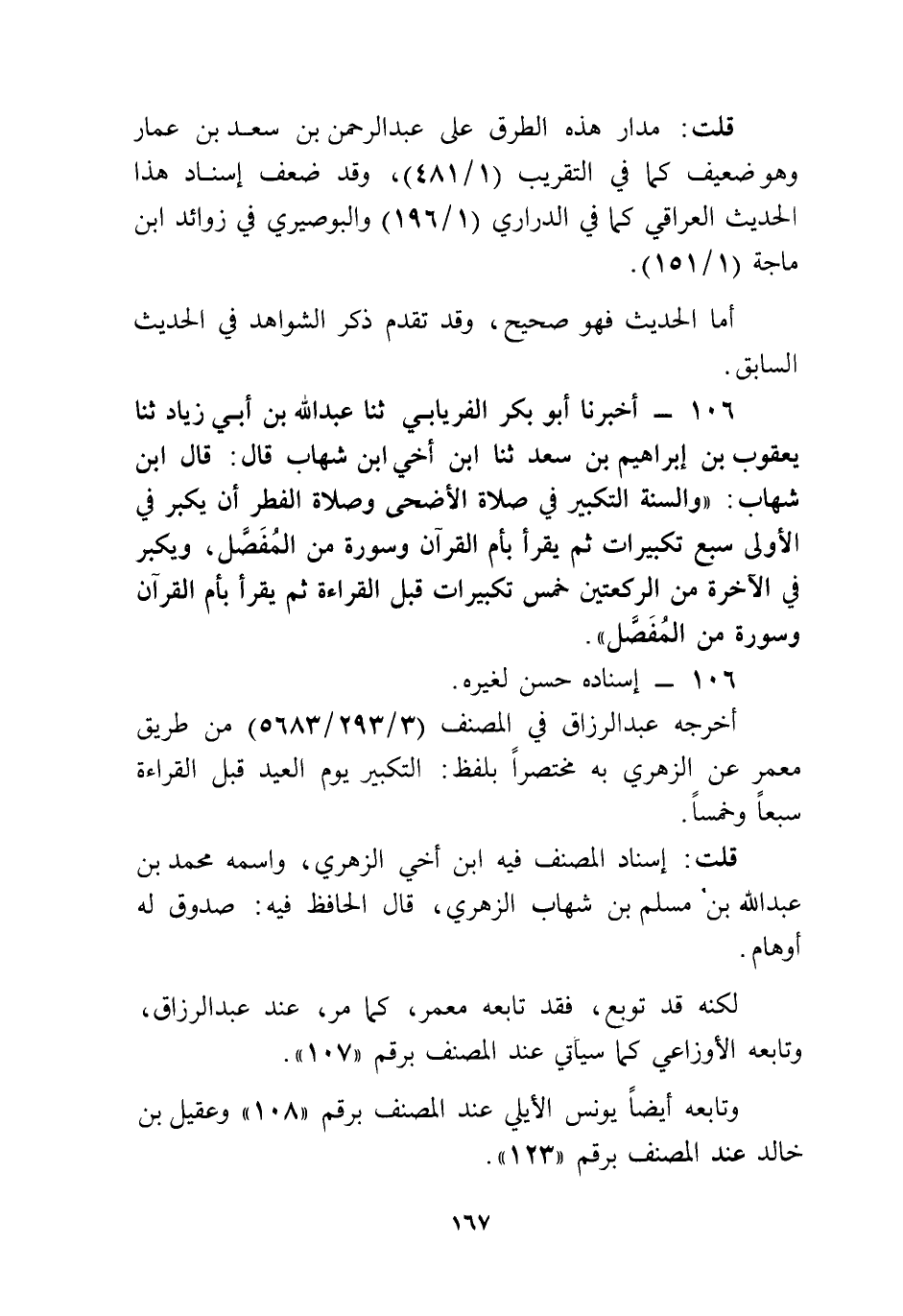 106 - أَخْبَرَنَا أَبُو بَكْرٍ الْفِرْيَابِيُّ، ثنا عَبْدُ اللَّهِ بْنُ أَبِي زِيَادٍ، ثنا يَعْقُوبُ بْنُ إِبْرَاهِيمَ بْنِ سَعْدٍ، ثنا ابْنُ أَخِي ابْنُ شِهَابٍ، قَالَ: قَالَ ابْنُ شِهَابٍ: «§وَالسُّنَّةُ التَّكْبِيرُ فِي صَّلَاةِ الْأَضْحَى وَصَلَاةِ الْفِطْرِ أَنْ يُكَبِّرَ فِي الْأُولَى سَبْعَ تَكْبِيرَاتٍ، ثُمَّ يَقْرَأُ بِأُمِّ الْقُرْآنِ وَسُورَةٍ مِنَ الْمُفَصَّلِ، وَيُكَبِّرُ فِي الْآخِرَةِ مِنَ الرَّكْعَتَيْنِ خَمْسَ تَكْبِيرَاتٍ قَبْلَ الْقِرَاءَةِ، ثُمَّ يَقْرَأُ بِأُمِّ الْقُرْآنِ وَسُورَةٍ مِنَ الْمُفَصَّلِ»
