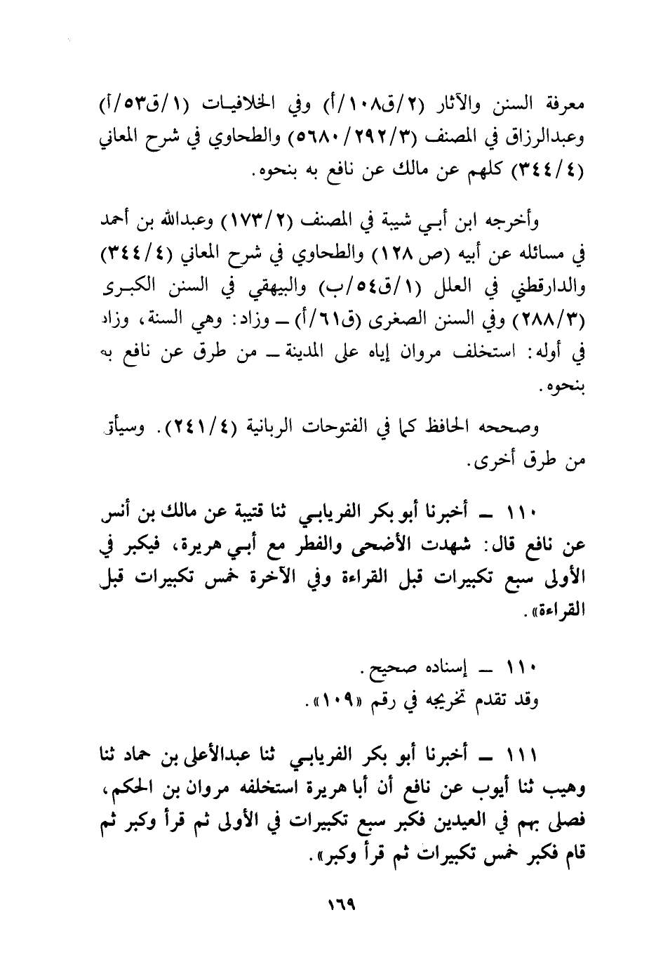 110 - أَخْبَرَنَا أَبُو بَكْرٍ الْفِرْيَابِيُّ، ثنا قُتَيْبَةُ عَنْ مَالِكِ بْنِ أَنَسٍ، عَنْ نَافِعٍ، قَالَ: شَهِدْتُ الْأَضْحَى وَالْفِطْرَ مَعَ أَبِي هُرَيْرَةَ، §فَيُكَبِّرُ فِي الْأُولَى سَبْعَ تَكْبِيرَاتٍ قَبْلَ الْقِرَاءَةِ، وَفِي الْآخِرَةِ خَمْسَ تَكْبِيرَاتٍ قَبْلَ الْقِرَاءَةِ