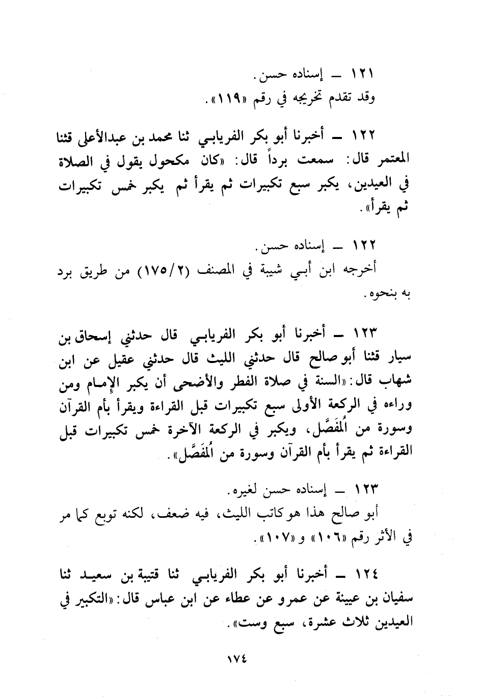 122 - أَخْبَرَنَا أَبُو بَكْرٍ الْفِرْيَابِيُّ، ثنا مُحَمَّدُ بْنُ عَبْدِ الْأَعْلَى، قثنا الْمُعْتَمِرُ، قَالَ: سَمِعْتُ بُرْدًا، قَالَ: كَانَ مَكْحُولٌ يَقُولُ فِي الصَّلَاةِ فِي الْعِيدَيْنِ، §يُكَبِّرُ سَبْعَ تَكْبِيرَاتٍ، ثُمَّ يَقْرَأُ، ثُمَّ يُكَبِّرُ خَمْسَ تَكْبِيرَاتٍ، ثُمَّ يَقْرَأُ "