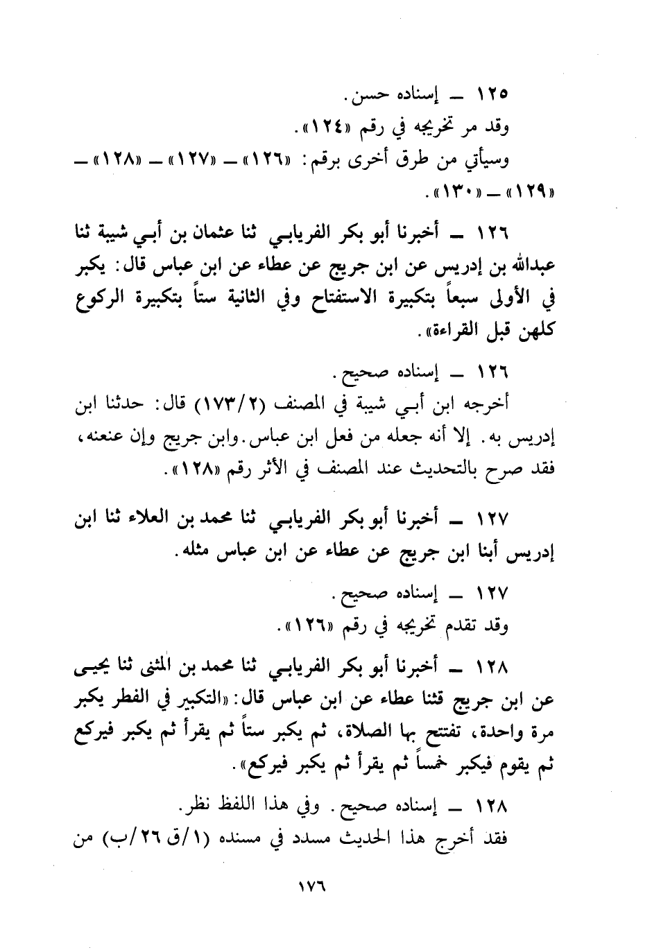 126 - أَخْبَرَنَا أَبُو بَكْرٍ الْفِرْيَابِيُّ، ثنا عُثْمَانُ بْنُ أَبِي شَيْبَةَ، ثنا عَبْدُ اللَّهِ بْنُ إِدْرِيسَ، عَنِ ابْنِ جُرَيْجٍ، عَنْ عَطَاءٍ، عَنِ ابْنِ عَبَّاسٍ، قَالَ: «§يُكَبِّرُ فِي الْأُولَى سَبْعًا بِتَكْبِيرَةِ الِاسْتِفْتَاحِ، وَفِي الثَّانِية سِتًّا بِتَكْبِيرَةِ الرُّكُوعِ كُلُّهُنَّ قَبْلَ الْقِرَاءَةِ» ، أَخْبَرَنَا أَبُو بَكْرٍ الْفِرْيَابِيُّ، ثنا مُحَمَّدُ بْنُ الْعَلَاءِ، ثنا ابْنُ إِدْرِيسَ، أَبْنَا ابْنُ جُرَيْجٍ، عَنْ عَطَاءٍ، عَنِ ابْنِ عَبَّاسٍ، مِثْلَهُ