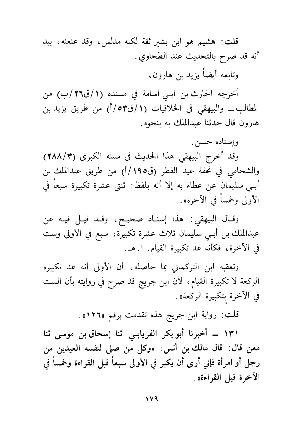 131 - أَخْبَرَنَا أَبُو بَكْرٍ الْفِرْيَابِيُّ، ثنا إِسْحَاقُ بْنُ مُوسَى، ثنا مَعْنٌ، قَالَ قَالَ مَالِكُ بْنُ أَنَسٍ: «§وَكُلُّ مَنْ صَلَّى لِنَفْسِهِ الْعِيدَيْنِ مِنْ رَجُلٍ أَوِ امْرَأَةٍ فَإِنِّي أَرَى أَنْ يُكَبِّرَ فِي الْأُولَى سَبْعًا قَبْلَ الْقِرَاءَةِ، وَخَمْسًا فِي الْآخِرَةِ قَبْلَ الْقِرَاءَةِ»