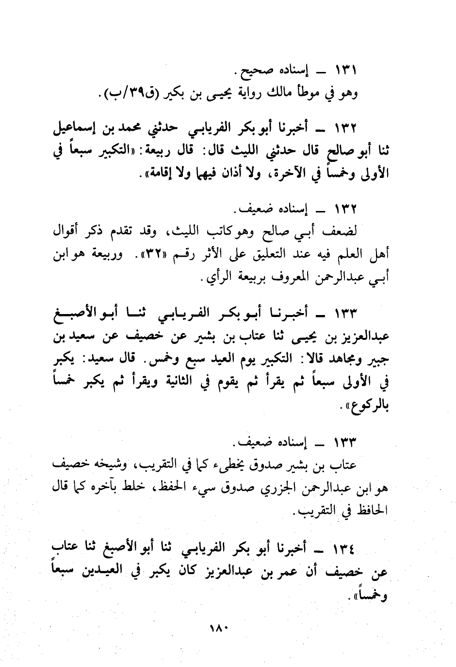 132 - أَخْبَرَنَا أَبُو بَكْرٍ الْفِرْيَابِيُّ، حَدَّثَنِي مُحَمَّدُ بْنُ إِسْمَاعِيلَ، ثنا أَبُو صَالِحٍ، قَالَ: حَدَّثَنِي اللَّيْثُ، قَالَ: قَالَ رَبِيعَةُ: «§التَّكْبِيرُ سَبْعًا فِي الْأُولَى، وَخَمْسًا فِي الْآخِرَةِ، وَلَا أَذَانَ فِيهِمَا وَلَا إِقَامَةَ»