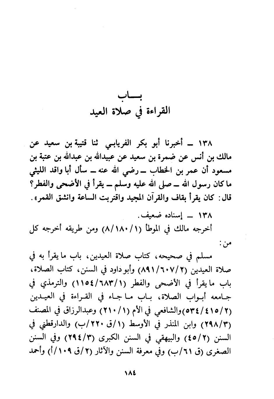 138 - أَخْبَرَنَا أَبُو بَكْرٍ الْفِرْيَابِيُّ، ثنا قُتَيْبَةُ بْنُ سَعِيدٍ، عَنْ مَالِكِ بْنِ أَنَسٍ، عَنْ ضَمْرَةَ بْنِ سَعِيدٍ، عَنْ عُبَيْدِ اللَّهِ بْنِ عَبْدِ اللَّهِ بْنِ عُتْبَةَ بْنِ مَسْعُودٍ،: أَنَّ عُمَرَ بْنَ الْخَطَّابِ، رَضِيَ اللَّهُ عَنْهُ سَأَلَ أَبَا وَاقِدٍ اللَّيْثِيَّ: " مَا كَانَ رَسُولُ اللَّهِ صَلَّى اللهُ عَلَيْهِ وَسَلَّمَ يَقْرَأُ فِي الْأَضْحَى وَالْفِطْرِ؟ قَالَ: §كَانَ يَقْرَأُ بِق وَالْقُرْآنِ الْمَجِيدِ، وَاقْتَرَبَتِ السَّاعَةُ وَانْشَقَّ الْقَمَرُ "،