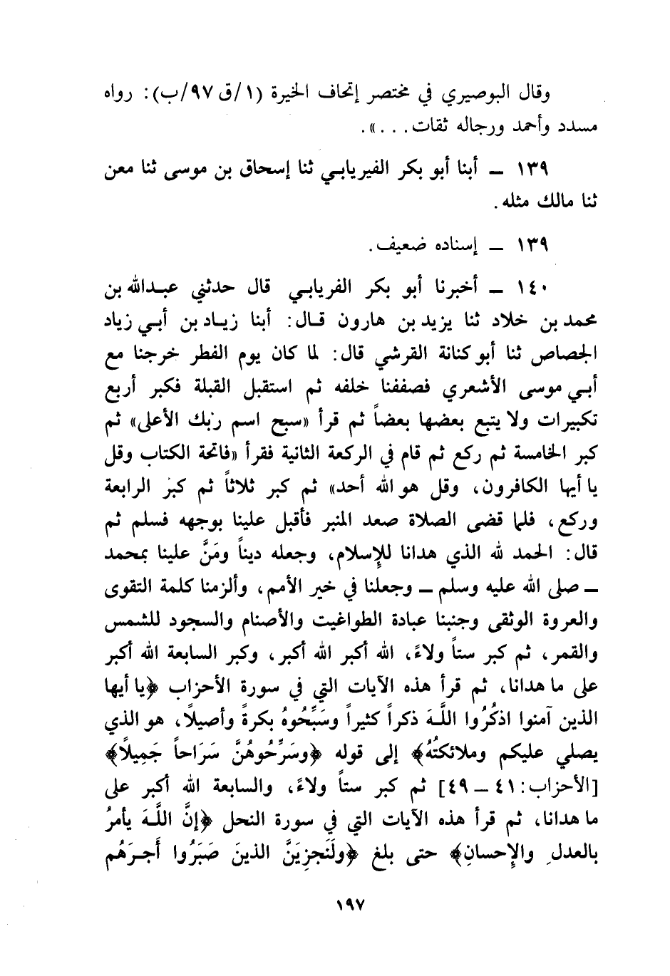أَخْبَرَنَا أَبُو بَكْرٍ الْفِرْيَابِيُّ، قَالَ: حَدَّثَنِي عَبْدُ اللَّهِ بْنُ مُحَمَّدِ بْنِ خَلَّادٍ، ثنا يَزِيدُ بْنُ هَارُونَ، قَالَ: أَبْنَا زِيَادُ بْنُ أَبِي زِيَادٍ الْجَصَّاصُ، ثنا أَبُو كِنَانَةَ الْقُرَشِيُّ، قَالَ: " لَمَّا كَانَ يَوْمُ الْفِطْرِ خَرَجْنَا مَعَ أَبِي مُوسَى الْأَشْعَرِيِّ فَصَفَفْنَا خَلْفَهُ، ثُمَّ اسْتَقْبَلَ الْقِبْلَةَ §فَكَبَّرَ أَرْبَعَ تَكْبِيرَاتٍ، وَلَا يَتْبَعُ بَعْضُهَا بَعْضًا، ثُمَّ قَرَأَ سَبِّحِ اسْمَ رَبِّكَ الْأَعْلَى ثُمَّ كَبَّرَ الْخَامِسَةَ، ثُمَّ رَكَعَ، ثُمَّ قَامَ فِي الرَّكْعَةِ الثَّانِيَةِ فَقَرَأَ: " فَاتِحَةَ الْكِتَابِ , وَقُلْ يَا أَيُّهَا الْكَافِرُونَ وَقُلْ هُوَ اللَّهُ أَحَدٌ ثُمَّ كَبَّرَ ثَلَاثًا، ثُمَّ كَبَّرَ الرَّابِعَةَ وَرَكَعَ، فَلَمَّا قَضَى الصَّلَاةَ صَعِدَ الْمِنْبَرَ فَأَقْبَلَ عَلَيْنَا بِوَجْهِهِ فَسَلَّمَ، ثُمَّ قَالَ: الْحَمْدُ لِلَّهِ الَّذِي هَدَانَا لِلْإِسْلَامٍ، وَجَعَلَهُ دِينًا وَمَنَّ عَلَيْنَا بِمُحَمَّدٍ صَلَّى اللهُ عَلَيْهِ وَسَلَّمَ وَجَعَلْنَا فِي خَيْرِ الْأُمَمِ وَأَلْزَمَنَا كَلِمَةَ التَّقْوَى، وَالْعُرْوَةَ الْوُثْقَى، وَجَنَّبَنَا عِبَادَةَ الطَّوَاغِيتِ وَالْأَصْنَامِ وَالسُّجُودِ لِلشَّمْسِ وَالْقَمَرِ، ثُمَّ كَبَّرَ سِتًّا وَلَاءً، اللَّهُ أَكْبَرُ اللَّهُ أَكْبَرُ، وَكَبَّرَ السَّابِعَةَ اللَّهُ أَكْبَرُ عَلَى مَا هَدَانَا، ثُمَّ قَرَأَ هذه الْآيَاتِ الَّتِي فِي سُورَةِ الْأَحْزَابِ {يَا أَيُّهَا الَّذِينَ آمَنُوا اذْكُرُوا اللَّهَ ذِكْرًا كَثِيرًا وَسَبِّحُوهُ بُكْرَةً وَأَصِيلًا هُوَ الَّذِي يُصَلِّي عَلَيْكُمْ وَمَلَائِكَتُهُ} [الأحزاب: 42] إِلَى قَوْلِهِ {وَسَرِّحُوهُنَّ سَرَاحًا جَمِيلًا} [الأحزاب: 49] ثُمَّ كَبَّرَ سِتًّا وَلَاءً، وَالسَّابِعَةُ اللَّهُ أَكْبَرُ عَلَى مَا هَدَانَا، ثُمَّ قَرَأَ هَذِهِ الْآيَاتِ الَّتِي فِي سُورَةِ النَّحْلِ {إِنَّ اللَّهَ يَأْمُرُ بِالْعَدْلِ وَالْإِحْسَانِ} [النحل: 90] حَتَّى بَلَغَ {وَلَنَجْزِيَنَّ الَّذِينَ صَبَرُوا أَجْرَهُمْ -[198]- بِأَحْسَنِ مَا كَانُوا يَعْمَلُونَ} [النحل: 96] ثُمَّ كَبَّرَ سِتًّا وَلَاءً، وَالسَّابِعَةُ اللَّهُ أَكْبَرُ عَلَى مَا هَدَانَا، ثُمَّ قَرَأَ {وَقَضَى رَبُّكَ أَلَّا تَعْبُدُوا إِلَّا إِيَّاهُ} [الإسراء: 23] حَتَّى بَلَغَ {مَلُومًا مَدْحُورًا} [الإسراء: 39] ثُمَّ كَبَّرَ سِتًّا وَلَاءً، وَالسَّابِعَةُ اللَّهُ أَكْبَرُ عَلَى مَا هَدَانَا ثُمَّ قَرَأَ وَاللَّيْلِ إِذَا يَغْشَى حَتَّى خَتَمَهَا، ثُمَّ قَرَأَ {كُتِبَ عَلَيْكُمُ الصِّيَامُ كَمَا كُتِبَ عَلَى الَّذِينَ مِنْ قَبْلِكُمْ} [البقرة: 183] حَتَّى بَلَغَ {عَلَى مَا هَدَاكُمْ وَلَعَلَّكُمْ تَشْكُرُونَ} [البقرة: 185] ثُمَّ قَالَ: إِنَّ هَذَا يَوْمٌ لَا يُرَدُّ فِيهِ الدُّعَاءُ فَارْفَعُوا أَرْغِبَتَكُمْ إِلَى اللَّهِ عَزَّ وَجَلَّ وَسَلُوهُ حَوَائِجَكُمْ، وَرَفَعَ يَدَيْهِ لَا يُجَاوِزُ بِهِمَا أُذُنَيْهِ، ثُمَّ دَعَا، ثُمَّ كَبَّرَ سِتًّا وَلَاءً، وَالسَّابِعَةُ اللَّهُ أَكْبَرُ عَلَى مَا هَدَانَا، ثُمَّ قَالَ: أَحْمَدُ اللَّهَ كَمَا حَمِدَ نَفْسَهُ فِي كِتَابِهِ، فَإِنَّهُ حَمِدَ نَفْسَهُ فِي ثَمَانِيَةِ أَمْكِنَةٍ فِي سَبْعِ سُوَرٍ، فَقَرَأَ أَوَّلَ آيَةٍ مِنَ الْأَنْعَامِ وَآخِرَ آيَةً مِنْ بَنِي إِسْرَائِيلَ، فَلَمَّا قَرَأَ {وَكَبِّرْهُ تَكْبِيرًا} [الإسراء: 111] رَفَعَ صَوْتَهُ اللَّهُ أَكْبَرُ عَلَى مَا هَدَانَا، ثُمَّ قَرَأَ أَوَّلَ الْكَهْفِ حَتَّى بَلَغَ {مَاكِثِينَ فِيهِ أَبَدًا} [الكهف: 3] ثُمَّ قَالَ: اللَّهُمَّ اجْعَلْنَا مِنْهُمْ، ثُمَّ قَرَأَ الْآيَةَ الَّتِي فِي سُورَةِ النَّمْلِ {قُلِ الْحَمْدُ لِلَّهِ وَسَلَامٌ عَلَى عِبَادِهِ الَ