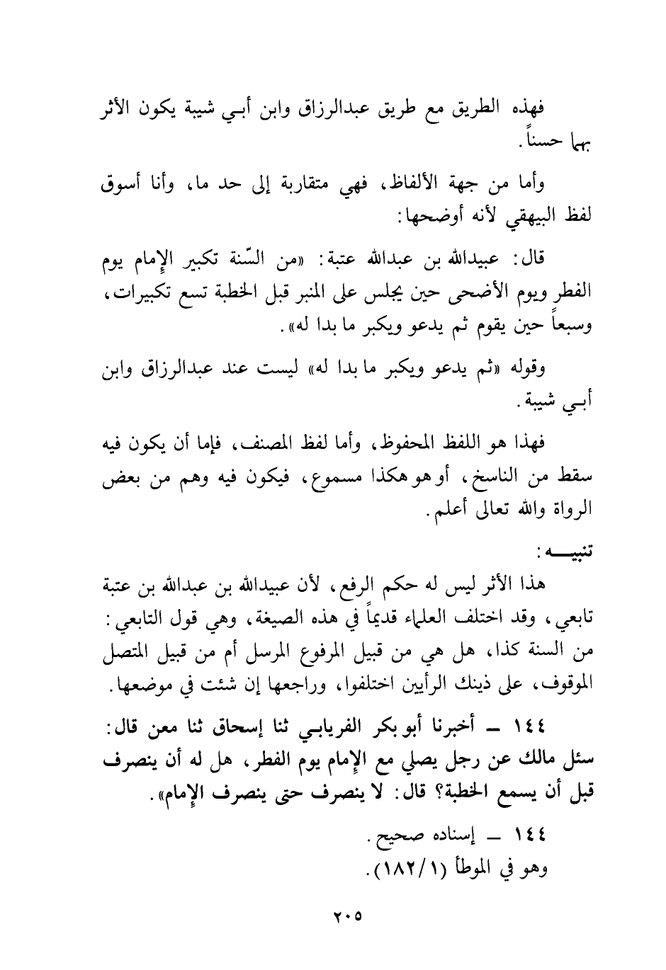 144 - أَخْبَرَنَا أَبُو بَكْرٍ الْفِرْيَابِيُّ، ثنا إِسْحَاقُ، ثنا مَعْنٌ، قَالَ: سُئِلَ مَالِكٌ عَنْ رَجُلٍ يُصَلِّي مَعَ الْإِمَامِ يَوْمَ الْفِطْرِ، هَلْ لَهُ أَنْ يَنْصَرِفَ قَبْلَ أَنْ يَسْمَعَ الْخُطْبَةَ؟ قَالَ: §لَا يَنْصَرِفُ حَتَّى يَنْصَرِفَ الْإِمَامُ "