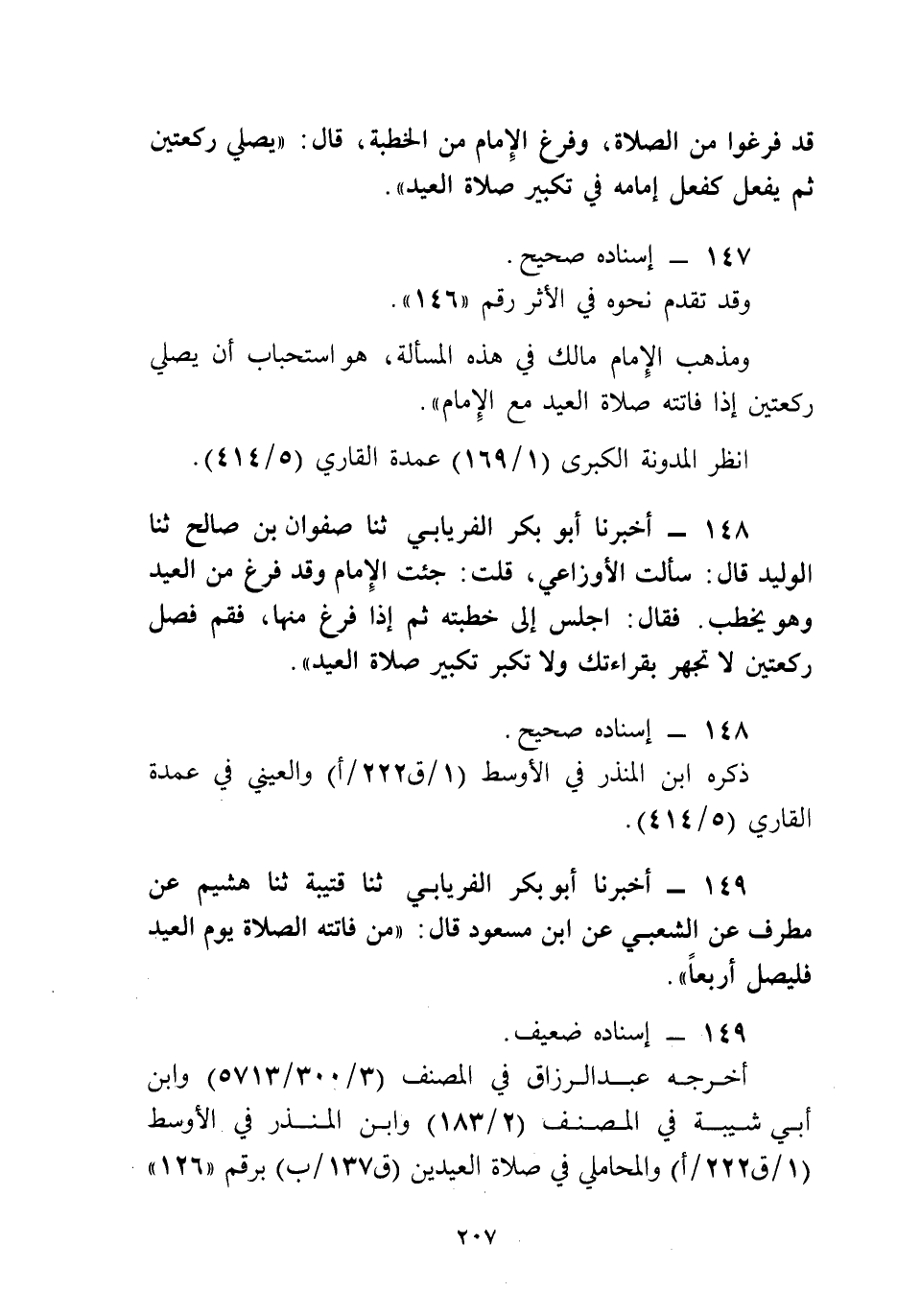 أَخْبَرَنَا أَبُو بَكْرٍ الْفِرْيَابِيُّ، ثنا قُتَيْبَةُ، ثنا هُشَيْمٌ، عَنْ مُطَرِّفٍ، عَنِ الشَّعْبِيِّ، عَنِ ابْنِ مَسْعُودٍ، قَالَ: «§مَنْ فَاتَتْهُ الصَّلَاةُ يَوْمَ الْعِيدِ فَلْيُصَلِّ أَرْبَعًا»