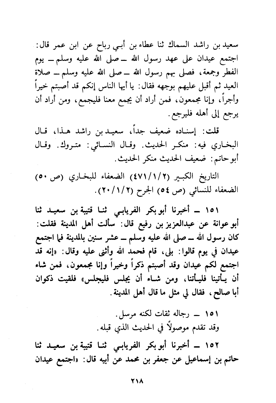 151 - أَخْبَرَنَا أَبُو بَكْرٍ الْفِرْيَابِيُّ، ثنا قُتَيْبَةُ بْنُ سَعِيدٍ، ثنا أَبُو عَوَانَةَ، عَنْ عَبْدِ الْعَزِيزِ بْنِ رُفَيْعٍ، قَالَ: سَأَلْتُ أَهْلَ الْمَدِينَةِ فَقُلْتُ: كَانَ رَسُولُ اللَّهِ صَلَّى اللهُ عَلَيْهِ وَسَلَّمَ عَشْرَ سِنِينَ بِالْمَدِينَةِ فَمَا اجْتَمَعَ عِيدَانِ فِي يَوْمٍ قَالُوا: بَلَى، قَامَ فَحَمِدَ اللَّهَ وَأَثْنَى عَلَيْهِ وَقَالَ: «§إِنَّهُ قَدِ اجْتَمَعَ لَكُمْ عِيدَانِ وَقَدْ أَصَبْتُمْ ذِكْرًا وَخَيْرًا وَإِنَّا مُجَمِّعُونَ، فَمَنْ شَاءَ أَنْ يَأْتِيَنَا فَلْيَأْتِنَا، وَمَنْ شَاءَ أَنْ يَجْلِسَ فَلْيَجْلِسْ» فَلَقِيتُ ذَكْوَانَ أَبَا صَالِحٍ، فَقَالَ لِي مِثْلَ مَا قَالَ أَهْلُ الْمَدِينَةِ "