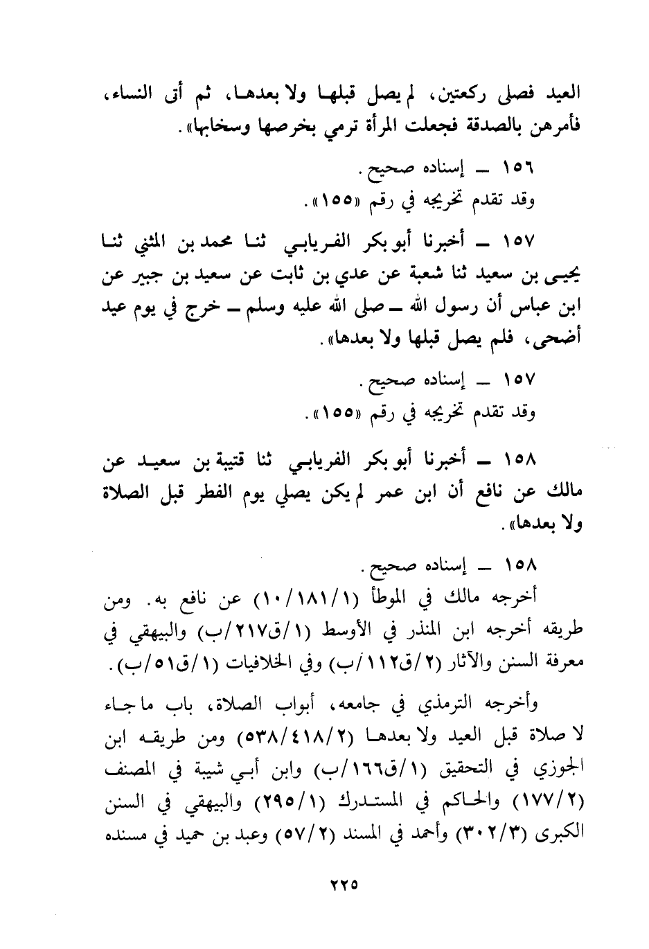 أَخْبَرَنَا أَبُو بَكْرٍ الْفِرْيَابِيُّ، ثنا قُتَيْبَةُ بْنُ سَعِيدٍ، عَنْ مَالِكٍ، عَنْ نَافِعٍ، أَنَّ ابْنَ عُمَرَ، §لَمْ يَكُنْ يُصَلِّي يَوْمَ الْفِطْرِ قَبْلَ الصَّلَاةِ وَلَا بَعْدَهَا "،
