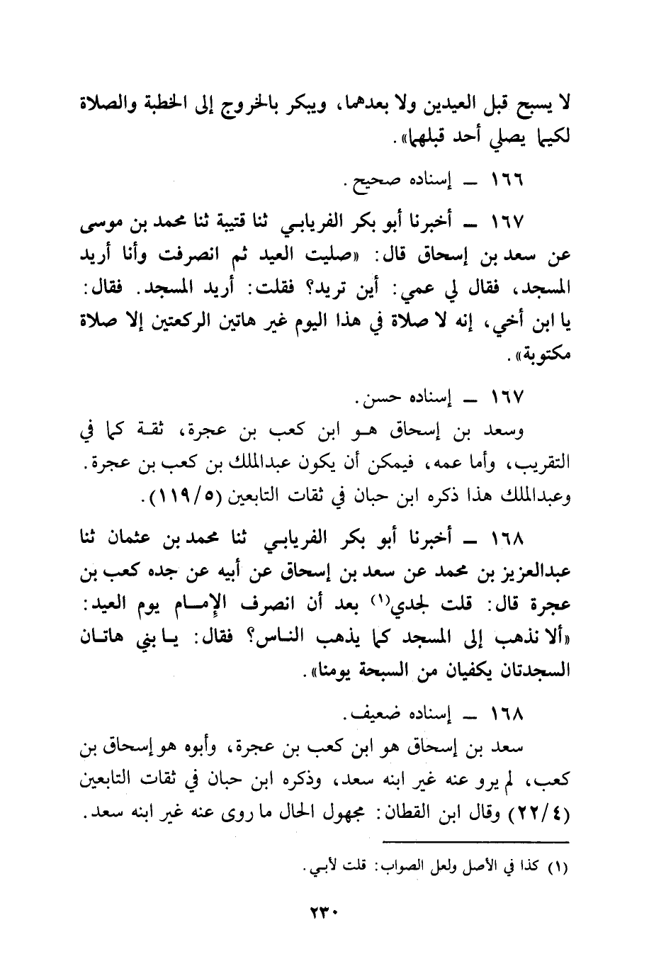 أَخْبَرَنَا أَبُو بَكْرٍ الْفِرْيَابِيُّ، ثنا قُتَيْبَةُ، ثنا مُحَمَّدُ بْنُ مُوسَى، عَنْ سَعْدِ بْنِ إِسْحَاقَ، قَالَ: صَلَّيْتُ الْعِيدَ، ثُمَّ انْصَرَفْتُ وَأَنَا أُرِيدُ الْمَسْجِدَ، فَقَالَ لِي عَمِّي: أَيْنَ تُرِيدُ؟ فَقُلْتُ: أُرِيدُ الْمَسْجِدَ. فَقَالَ: يَا ابْنَ أَخِي، §إِنَّهُ لَا صَلَاةَ فِي هَذَا الْيَوْمِ غَيْرُ هَاتَيْنِ الرَّكْعَتَيْنِ إِلَّا صَلَاةً مَكْتُوبَةً "