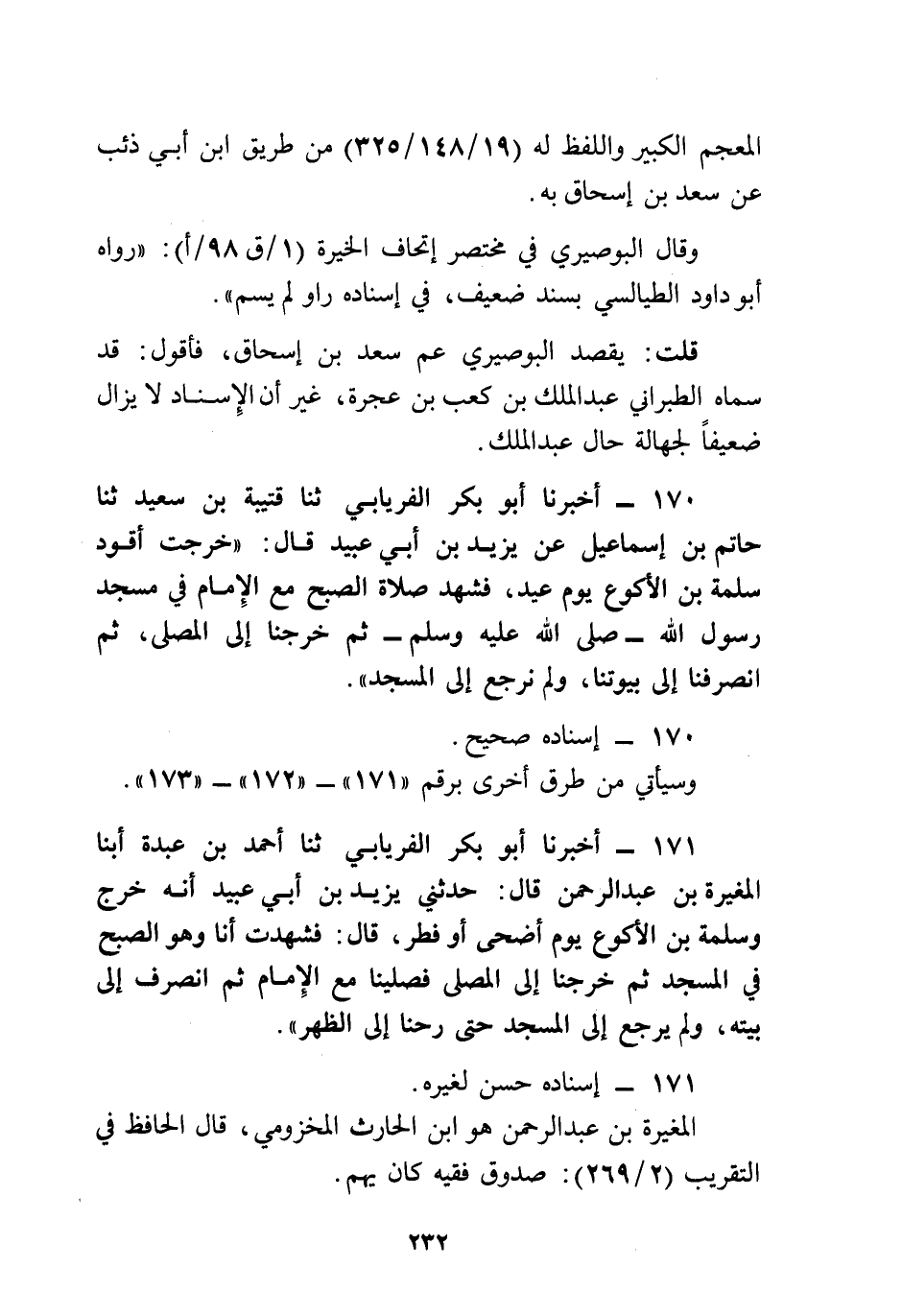 170 - أَخْبَرَنَا أَبُو بَكْرٍ الْفِرْيَابِيُّ، ثنا قُتَيْبَةُ بْنُ سَعِيدٍ، ثنا حَاتِمُ بْنُ إِسْمَاعِيلَ، عَنْ يَزِيدَ بْنِ أَبِي عُبَيْدٍ، قَالَ: خَرَجْتُ أَقُودُ سَلَمَةَ بْنَ الْأَكْوَعِ يَوْمَ عِيدٍ، §فَشَهِدَ صَلَاةَ الصُّبْحِ مَعَ الْإِمَامِ فِي مَسْجِدِ رَسُولِ اللَّهِ صَلَّى اللهُ عَلَيْهِ وَسَلَّمَ، ثُمَّ خَرَجْنَا إِلَى الْمُصَلَّى، ثُمَّ انْصَرَفْنَا إِلَى بُيُوتِنَا، وَلَمْ نَرْجِعْ إِلَى الْمَسْجِدِ "