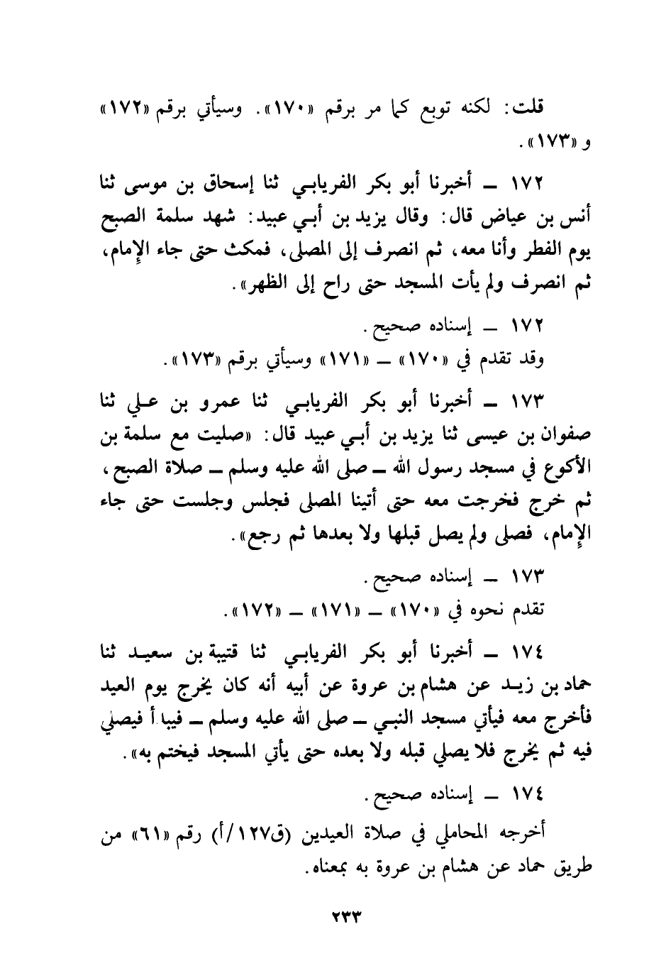 172 - أَخْبَرَنَا أَبُو بَكْرٍ الْفِرْيَابِيُّ، ثنا إِسْحَاقُ بْنُ مُوسَى، ثنا أَنَسُ بْنُ عِيَاضٍ، قَالَ: وَقَالَ يَزِيدُ بْنُ أَبِي عُبَيْدٍ: «§شَهِدَ سَلَمَةُ الصُّبْحَ يَوْمَ الْفِطْرِ وَأَنَا مَعَهُ، ثُمَّ انْصَرَفَ إِلَى الْمُصَلَّى، فَمَكَثَ حَتَّى جَاءَ الْإِمَامُ، ثُمَّ انْصَرَفَ وَلَمْ يَأْتِ الْمَسْجِدَ حَتَّى رَاحَ إِلَى الظُّهْرِ»