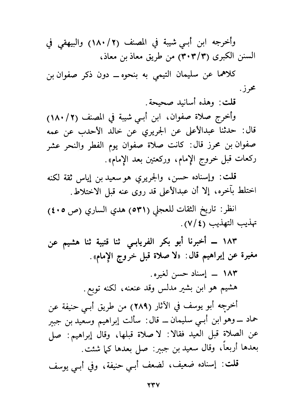183 - أَخْبَرَنَا أَبُو بَكْرٍ الْفِرْيَابِيُّ، ثنا قُتَيْبَةُ، ثنا هُشَيْمٌ، عَنْ مُغِيرَةَ، عَنْ إِبْرَاهِيمَ، قَالَ: «§لَا صَلَاةَ قَبْلَ خُرُوجِ الْإِمَامِ» ،