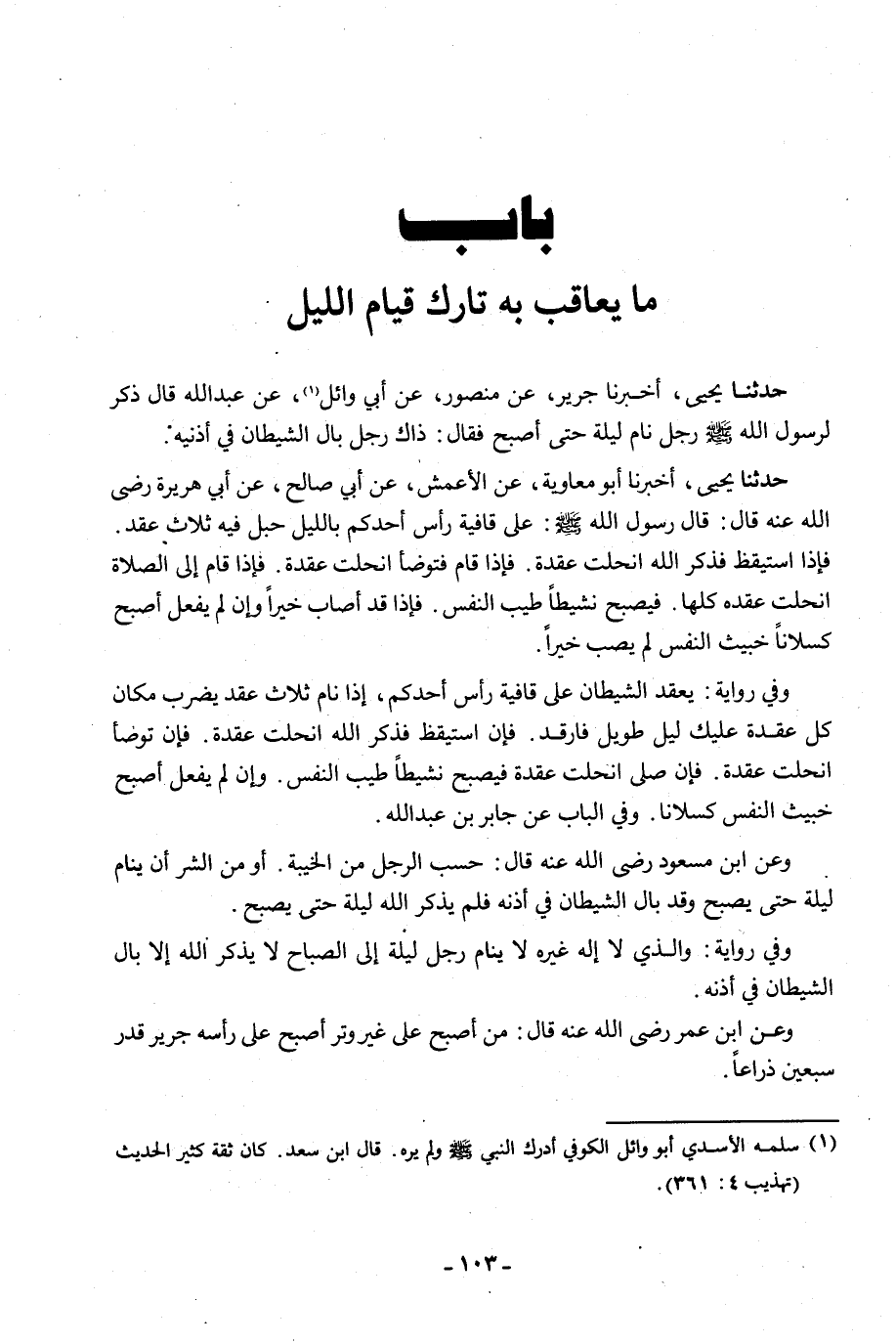 حَدَّثَنَا يَحْيَى، أَخْبَرَنَا أَبُو مُعَاوِيَةَ، عَنِ الْأَعْمَشِ، عَنْ أَبِي صَالِحٍ، عَنْ أَبِي هُرَيْرَةَ، رَضِيَ اللَّهُ عَنْهُ قَالَ: قَالَ رَسُولُ اللَّهِ صَلَّى اللَّهُ عَلَيْهِ وَسَلَّمَ: «§عَلَى قَافِيَةِ رَأْسِ أَحَدِكُمْ بِاللَّيْلِ حَبْلٌ فِيهِ ثَلَاثُ عُقَدٍ، فَإِذَا اسْتَيْقَظَ فَذَكَرَ اللَّهَ انْحَلَّتْ عُقْدَةٌ، فَإِذَا قَامَ فَتَوَضَّأَ انْحَلَّتْ عُقْدَةٌ، فَإِذَا قَامَ إِلَى الصَّلَاةِ انْحَلَّتْ عُقَدُهُ كُلُّهَا، فَيُصْبِحُ نَشِيطًا طَيِّبَ النَّفْسِ، فَإِذًا قَدْ أَصَابَ خَيْرًا، وَإِنْ لَمْ يَفْعَلْ أَصْبَحَ كَسْلَانَ خَبِيثَ النَّفْسِ لَمْ يُصِبْ خَيْرًا»، وَفِي رِوَايَةٍ: يَعْقِدُ الشَّيْطَانُ عَلَى قَافِيَةِ رَأْسِ أَحَدِكُمْ إِذَا نَامَ ثَلَاثَ عُقَدٍ يَضْرِبُ مَكَانَ كُلِّ عُقْدَةٍ، عَلَيْكَ لَيْلٌ طَوِيلٌ فَارْقُدْ، فَإِنِ اسْتَيْقَظَ فَذَكَرَ اللَّهَ انْحَلَّتْ عُقْدَةٌ، فَإِنْ تَوَضَّأَ انْحَلَّتْ عُقْدَةٌ، فَإِنْ صَلَّى انْحَلَّتْ عُقْدَةٌ فَيُصْبِحُ نَشِيطًا طَيِّبَ النَّفْسِ وَإِنْ لَمْ يَفْعَلْ أَصْبَحَ خَبِيثَ النَّفْسِ كَسْلَانَ " وَفِي الْبَابِ عَنْ جَابِرِ بْنِ عَبْدِ اللَّهِ وَعَنِ ابْنِ مَسْعُودٍ رَضِيَ اللَّهُ عَنْهُ قَالَ: " حَسْبُ الرَّجُلِ مِنَ الْخَيْبَةِ، أَوْ مِنَ الشَّرِّ أَنْ يَنَامَ لَيْلَةً حَتَّى يُصْبِحَ وَقَدْ بَالَ الشَّيْطَانُ فِي أُذُنِهِ فَلَمْ يَذْكُرِ اللَّهَ لَيْلَةً حَتَّى يُصْبِحَ. وَفِي رِوَايَةٍ: وَالَّذِي لَا إِلَهَ غَيْرُهُ لَا يَنَامُ الرَّجُلُ لَيْلَةً إِلَى الصَّبَاحِ لَا يَذْكُرُ اللَّهَ إِلَّا بَالَ الشَّيْطَانُ فِي أُذُنِهِ " وَعَنِ ابْنِ عُمَرَ رَضِيَ اللَّهُ عَنْهُ قَالَ: «مَنْ أَصْبَحَ عَلَى غَيْرِ وِتْرٍ أَصْبَحَ عَلَى رَأْسِهِ جَرِيرٌ قَدْرَ سَبْعِينَ ذِرَاعًا»