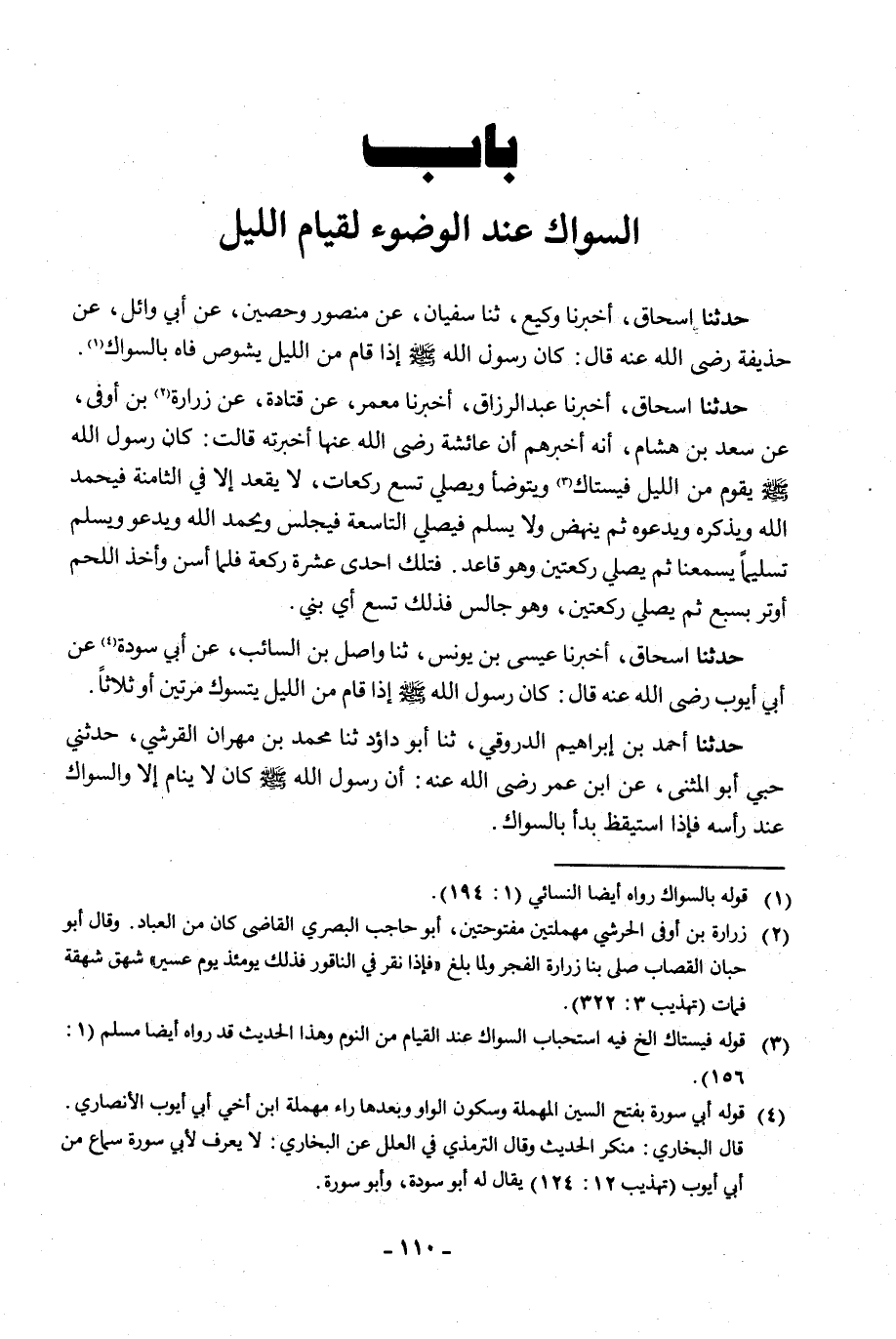 حَدَّثَنَا أَحْمَدُ بْنُ إِبْرَاهِيمَ الدَّوْرَقِيُّ، ثنا أَبُو دَاوُدَ، ثنا مُحَمَّدُ بْنُ مِهْرَانَ الْقُرَشِيُّ، حَدَّثَنِي حِبِّي أَبُو الْمُثَنَّى، عَنِ ابْنِ عُمَرَ، رَضِيَ اللَّهُ عَنْهُ، أَنَّ رَسُولَ اللَّهِ صَلَّى اللَّهُ عَلَيْهِ وَسَلَّمَ كَانَ §لَا يَنَامُ إِلَّا وَالسِّوَاكُ عِنْدَ رَأْسِهِ فَإِذَا اسْتَيْقَظَ بَدَأَ بِالسِّوَاكِ " -[111]- وَفِي الْبَابِ عَنِ ابْنِ عَبَّاسٍ رَضِيَ اللَّهُ عَنْهُ، وَجَابِرِ بْنِ عَبْدِ اللَّهِ رَضِيَ اللَّهُ عَنْهُ، وَالْحَجَّاجِ بْنِ عَمْرٍو الْمَازِنِيِّ رَضِيَ اللَّهُ عَنْهُ، وَعَوْفِ بْنِ مَالِكٍ رَضِيَ اللَّهُ عَنْهُ. وَعَنِ ابْنِ شِهَابٍ رَحِمَهُ اللَّهُ قَالَ: قَالَ رَسُولُ اللَّهِ صَلَّى اللَّهُ عَلَيْهِ وَسَلَّمَ: «إِذَا قَامَ الرَّجُلُ يَتَوَضَّأُ لَيْلًا أَوْ نَهَارًا فَأَحْسَنَ الْوُضُوءَ وَاسْتَنَّ، ثُمَّ قَامَ فَصَلَّى أَطَافَ بِهِ الْمَلَكُ وَدَنَا مِنْهُ حَتَّى يَضَعَ فَاهُ عَلَى فِيهِ فَمَا يَقْرَأُ إِلَّا فِي فِيهِ وَإِذَا لَمْ يَسْتَنَّ أَطَافَ بِهِ وَلَا يَضَعُ فَاهُ عَلَى فِيهِ» وَكَانَ رَسُولُ اللَّهِ صَلَّى اللَّهُ عَلَيْهِ وَسَلَّمَ لَا يَقُومُ إِلَى صَلَاةٍ إِلَّا اسْتَنَّ وَعَنْ أَبِي عَبْدِ الرَّحْمَنِ السُّلَمِيِّ رَحِمَهُ اللَّهُ قَالَ: حَثَّ عَلِيٌّ رَضِيَ اللَّهُ عَنْهُ عَلَى السِّوَاكِ وَقَالَ: إِنَّ الرَّجُلَ إِذَا قَامَ يُصَلِّي جَاءَ الْمَلَكُ يَسْتَمِعُ الْقُرْآنَ فَمَا يَزَالُ يَدْنُو حَتَّى أَنَّهُ يَضَعُ فَاهُ عَلَى فِيهِ فَمَا يَلْفِظُ مِنْ آيَةٍ إِلَّا وَقَعَتْ فِي جَوْفِ الْمَلَكُ " وَعَنْ حَسَّانَ بْنِ عَطِيَّةَ رَحِمَهُ اللَّهُ: «رَكْعَتَانِ يَرْكَعُهُمَا الْعَبْدُ قَدِ اسْتَنَّ فِيهِمَا أَفْضَلُ مِنْ سَبْعِينَ رَكْعَةً لَمْ يَسْتَنَّ فِيهَا» وَقَالَ عَبْدُ الْعَزِيزِ بْنُ أَبِي دَاوُدَ رَحِمَهُ اللَّهُ: " خُلُقَانِ كَرِيمَانِ مِنْ أَحْسَنِ أَخْلَاقِ الْمَرْءِ الْمُسْلِمِ: التَّهَجُّدُ بِاللَّيْلِ، وَالْمُدَاوَمَةُ عَلَى السِّوَاكِ " وَعَنْ مُحَمَّدِ بْنِ النَّضْرِ الْحَارِثِيِّ رَحِمَهُ اللَّهُ: وَذَكَرَ قِيَامَ اللَّيْلِ وَالسِّوَاكَ قَبْلَهُ، فَقَالَ: «ذَاكَ عَادَةُ الْمُتَهَجِّدِينَ»