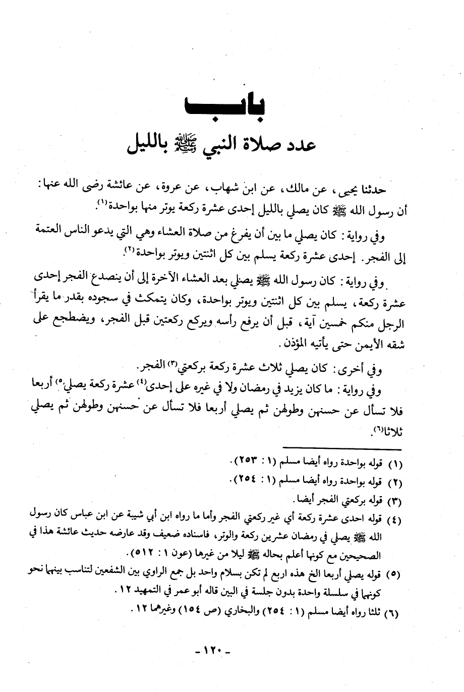 حَدَّثَنَا يَحْيَى، عَنْ مَالِكٍ، عَنِ ابْنِ شِهَابٍ، عَنْ عُرْوَةَ، عَنْ عَائِشَةَ رَضِيَ اللَّهُ عَنْهَا أَنَّ رَسُولَ اللَّهِ صَلَّى اللَّهُ عَلَيْهِ وَسَلَّمَ كَانَ §يُصَلِّي بِاللَّيْلِ إِحْدَى عَشْرَةَ رَكْعَةً يُوتِرُ مِنْهَا بِوَاحِدَةٍ " وَفِي رِوَايَةٍ: كَانَ يُصَلِّي مَا بَيْنَ أَنْ يَفْرُغَ مِنْ صَلَاةِ الْعِشَاءِ وَهِيَ الَّتِي يَدْعُو النَّاسُ الْعَتَمَةَ إِلَى الْفَجْرِ إِحْدَى عَشْرَةَ رَكْعَةً، يُسَلِّمُ بَيْنَ كُلِّ اثْنَتَيْنِ وَيُوتِرُ بِوَاحِدَةٍ " وَفِي رِوَايَةٍ: كَانَ رَسُولُ اللَّهِ صَلَّى اللَّهُ عَلَيْهِ وَسَلَّمَ يُصَلِّي بَعْدَ الْعِشَاءِ الْآخِرَةِ إِلَى أَنْ يَنْصَدِعَ الْفَجْرُ إِحْدَى عَشْرَةَ رَكْعَةً، يُسَلِّمُ بَيْنَ كُلِّ اثْنَتَيْنِ وَيُوتِرُ بِوَاحِدَةٍ، وَكَانَ يَتَمَكَّثُ فِي سُجُودِهِ بِقَدْرِ مَا يَقْرَأُ الرَّجُلُ مِنْكُمْ خَمْسِينَ آيَةً، قَبْلَ أَنْ يَرْفَعَ رَأْسَهُ، وَيَرْكَعُ رَكْعَتَيْنِ قَبْلَ الْفَجْرِ، وَيَضْطَجِعُ عَلَى شِقِّهِ الْأَيْمَنِ حَتَّى يَأْتِيَهُ الْمُؤَذِّنُ " وَفِي الْأُخْرَى: كَانَ يُصَلِّي ثَلَاثَ عَشْرَةَ رَكْعَةً بِرَكْعَتَيِ الْفَجْرِ. وَفِي رِوَايَةٍ: مَا كَانَ يَزِيدُ فِي رَمَضَانَ وَلَا فِي غَيْرِهِ عَلَى إِحْدَى عَشْرَةَ رَكْعَةً، يُصَلِّي أَرْبَعًا فَلَا تَسْأَلْ عَنْ حُسْنِهِنَّ وَطُولِهِنَّ، ثُمَّ يُصَلِّي أَرْبَعًا فَلَا تَسْأَلْ عَنْ حُسْنِهِنَّ وَطُولِهِنَّ، ثُمَّ يُصَلِّي ثَلَاثًا. -[121]- وَفِي أُخْرَى: كَانَتْ صَلَاتُهُ مِنَ اللَّيْلِ فِي شَهْرِ رَمَضَانَ وَغَيْرِهِ ثَلَاثَ عَشْرَةَ رَكْعَةً مِنْهَا رَكْعَتَا الْفَجْرِ