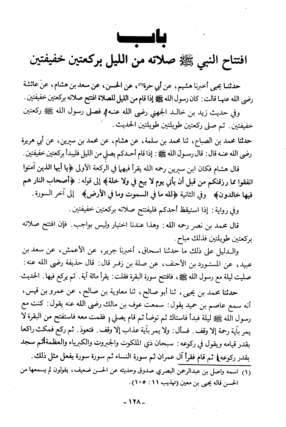 حَدَّثَنَا مُحَمَّدُ بْنُ الصَّبَّاحِ، ثنا مُحَمَّدُ بْنُ سَلَمَةَ، عَنْ هِشَامٍ، عَنْ مُحَمَّدِ بْنِ سِيرِينَ، عَنْ أَبِي هُرَيْرَةَ رَضِيَ اللَّهُ عَنْهُ قَالَ: قَالَ رَسُولُ اللَّهِ صَلَّى اللَّهُ عَلَيْهِ وَسَلَّمَ: «§إِذَا قَامَ أَحَدُكُمْ يُصَلِّي مِنَ اللَّيْلِ فَلْيَبْدَأْ بِرَكْعَتَيْنِ خَفِيفَتَيْنِ» قَالَ هِشَامٌ: فَكَانَ ابْنُ سِيرِينَ رَحِمَهُ اللَّهُ يَقْرَأُ فِيهِمَا، فِي الرَّكْعَةِ الْأُولَى: {يَا أَيُّهَا الَّذِينَ آمَنُوا أَنْفِقُوا مِمَّا رَزَقْنَاكُمْ مِنْ قَبْلِ أَنْ يَأْتِيَ يَوْمٌ لَا بَيْعٌ فِيهِ وَلَا خُلَّةٌ} [البقرة: 254] إِلَى قَوْلِهِ {أَصْحَابُ النَّارِ هُمْ فِيهَا خَالِدُونَ} [البقرة: 257] وَفِي الثَّانِيَةِ: {لِلَّهِ مَا فِي السَّمَوَاتِ وَمَا فِي الْأَرْضِ} إِلَى آخِرِ السُّورَةِ، وَفِي رِوَايَةٍ: «إِذَا اسْتَيْقَظَ أَحَدُكُمْ فَلْيَفْتَتِحْ صَلَاتَهُ بِرَكْعَتَيْنِ خَفِيفَتَيْنِ» قَالَ مُحَمَّدُ بْنُ نَصْرٍ رَحِمَهُ اللَّهُ: وَهَذَا عِنْدَنَا اخْتِيَارٌ وَلَيْسَ بِوَاجِبٍ، فَإِنِ افْتَتَحَ صَلَاتَهُ بِرَكْعَتَيْنِ طَوِيلَتَيْنِ فَذَلِكَ مُبَاحٌ