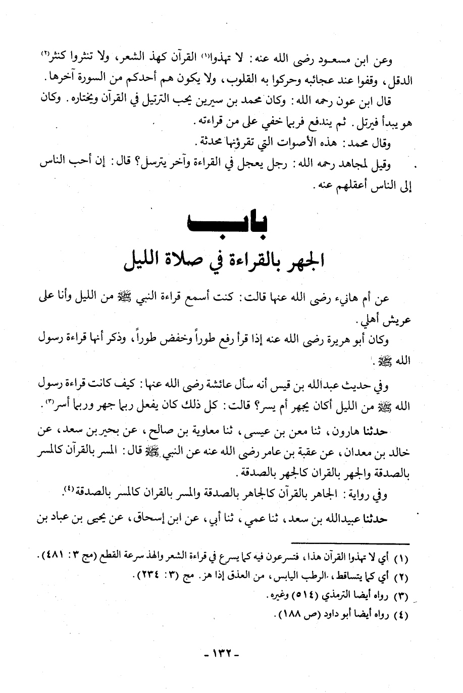 وَعَنِ ابْنِ مَسْعُودٍ رَضِيَ اللَّهُ عَنْهُ: «لَا تَهُذُّوا الْقُرْآنَ كَهَذِّ الشِّعْرِ، وَلَا تَنْثُرُوا كَنَثْرِ الدَّقَلِ، وَقِفُوا عِنْدَ عَجَائِبِهِ وَحَرِّكُوا بِهِ الْقُلُوبَ، وَلَا يَكُونُ هَمُّ أَحَدِكُمْ مِنَ السُّورَةِ آخِرَهَا» قَالَ ابْنُ عَوْنٍ رَحِمَهُ اللَّهُ: كَانَ مُحَمَّدُ بْنُ سِيرِينَ «يُحِبُّ التَّرْتِيلَ فِي الْقُرْآنِ وَيَخْتَارُهُ، وَكَانَ هُوَ يَبْدَأُ فَيُرَتِّلُ، ثُمَّ يَنْدَفِعُ فَرُبَّمَا خَفِيَ عَلَيَّ مِنْ قِرَاءَتِهِ» وَقَالَ مُحَمَّدٌ: «هَذِهِ الْأَصْوَاتُ الَّتِي تَقْرَءُونَهَا مُحْدَثَةٌ» وَقِيلَ لِمُجَاهِدٍ رَحِمَهُ اللَّهُ: رَجُلٌ يَعْجَلُ فِي الْقِرَاءَةِ وَآخَرُ يَتَرَسَّلُ؟ قَالَ: «إِنَّ أَحَبَّ النَّاسِ إِلَى النَّاسِ أَعْقَلُهُمْ عَنْهُ»