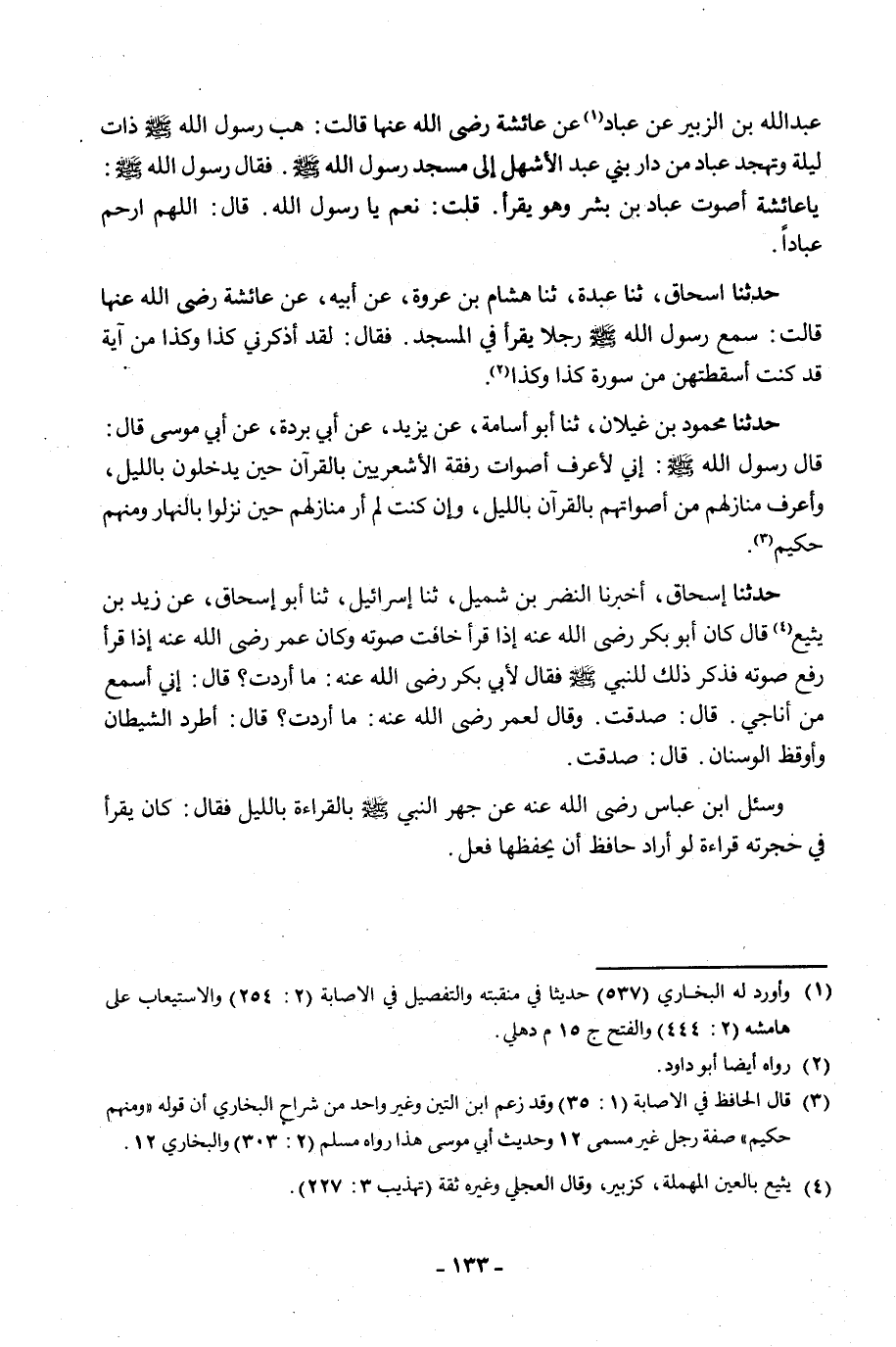 حَدَّثَنَا إِسْحَاقُ، أَخْبَرَنَا النَّضْرُ بْنُ شُمَيْلٍ، ثنا إِسْرَائِيلُ، ثنا أَبُو إِسْحَاقَ، عَنْ زَيْدِ بْنِ يُثَيْعٍ، قَالَ: §كَانَ أَبُو بَكْرٍ رَضِيَ اللَّهُ عَنْهُ إِذَا قَرَأَ خَافَتَ صَوْتَهُ، وَكَانَ عُمَرُ رَضِيَ اللَّهُ عَنْهُ إِذَا قَرَأَ رَفَعَ صَوْتَهُ فَذُكِرَ ذَلِكَ لِلنَّبِيِّ صَلَّى اللَّهُ عَلَيْهِ وَسَلَّمَ، فَقَالَ لِأَبِي بَكْرٍ رَضِيَ اللَّهُ عَنْهُ: «مَا أَرَدْتَ؟»، قَالَ: إِنِّي أُسْمِعُ مَنْ أُنَاجِي، قَالَ: «صَدَقْتَ» وَقَالَ لِعُمَرَ رَضِيَ اللَّهُ عَنْهُ: «مَا أَرَدْتَ؟»، قَالَ: أَطْرُدُ شَيْطَانًا، وَأُوقِظُ الْوَسْنَانَ، قَالَ: «صَدَقْتَ» وَسُئِلَ ابْنُ عَبَّاسٍ رَضِيَ اللَّهُ عَنْهُ عَنْ جَهْرِ النَّبِيِّ صَلَّى اللَّهُ عَلَيْهِ وَسَلَّمَ بِالْقِرَاءَةِ بِاللَّيْلِ فَقَالَ: «كَانَ يَقْرَأُ فِي حُجْرَتِهِ قِرَاءَةً لَوْ أَرَادَ حَافَظٌ أَنْ يَحْفَظُهَا فَعَلَ»