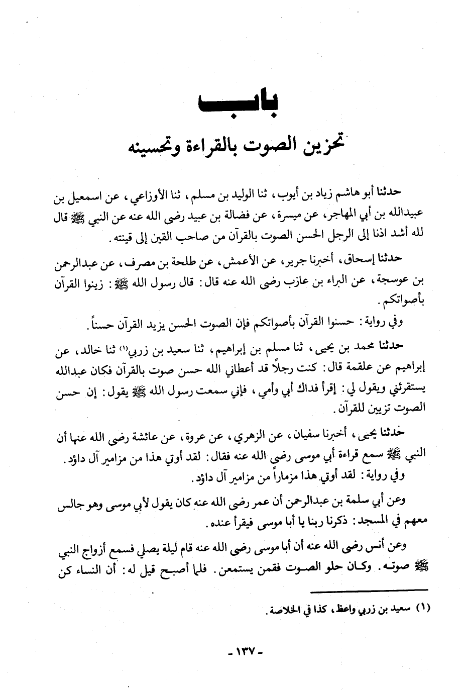 حَدَّثَنَا إِسْحَاقُ، أَخْبَرَنَا جَرِيرٌ، عَنِ الْأَعْمَشِ، عَنْ طَلْحَةَ بْنِ مُصَرِّفٍ، عَنْ عَبْدِ الرَّحْمَنِ بْنِ عَوْسَجَةَ، عَنِ الْبَرَاءِ بْنِ عَازِبٍ رَضِيَ اللَّهُ عَنْهُ قَالَ: قَالَ رَسُولُ اللَّهِ صَلَّى اللَّهُ عَلَيْهِ وَسَلَّمَ: «§زَيِّنُوا الْقُرْآنَ بِأَصْوَاتِكُمْ» وَفِي رِوَايَةٍ: «حَسِّنُوا الْقُرْآنُ بِأَصْوَاتِكُمْ، فَإِنَّ الصَّوْتَ الْحَسَنَ يَزِيدُ الْقُرْآنَ حُسْنًا»