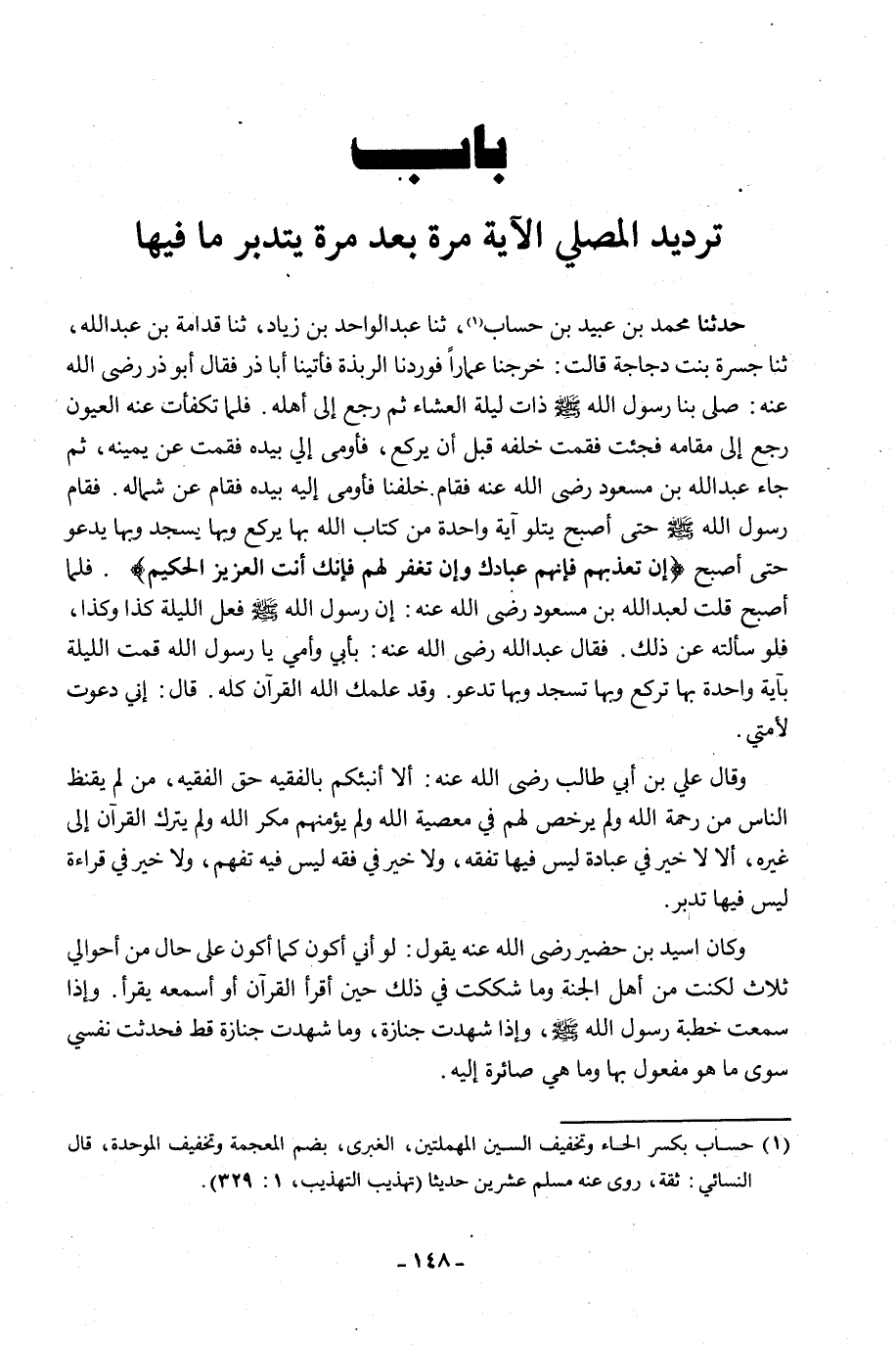 حَدَّثَنَا مُحَمَّدُ بْنُ عُبَيْدِ بْنِ حِسَابٍ، ثنا عَبْدُ الْوَاحِدِ بْنُ زِيَادٍ، ثنا قُدَامَةُ بْنُ عَبْدِ اللَّهِ، ثنا جَسْرَةُ بِنْتُ دَجَاجَةَ، قَالَتْ: خَرَجْنَا عُمَّارًا فَوَرَدْنَا الرِّبْذَةَ فَأَتَيْنَا أَبَا ذَرٍّ، فَقَالَ أَبُو ذَرٍّ رَضِيَ اللَّهُ عَنْهُ: صَلَّى بِنَا رَسُولُ اللَّهِ صَلَّى اللَّهُ عَلَيْهِ وَسَلَّمَ ذَاتَ لَيْلَةٍ الْعِشَاءَ، ثُمَّ رَجَعَ إِلَى أَهْلِهِ، فَلَمَّا تَكَفَّأَتْ عَنْهُ الْعُيُونُ رَجَعَ إِلَى مَقَامِهِ فَجِئْتُ فَقُمْتُ خَلْفَهُ قَبْلَ أَنْ يَرْكَعَ، فَأَوْمَأَ إِلَيَّ بِيَدِهِ فَقُمْتُ عَنْ يَمِينِهِ، ثُمَّ جَاءَ عَبْدُ اللَّهِ بْنُ مَسْعُودٍ رَضِيَ اللَّهُ عَنْهُ فَقَامَ خَلْفَنَا فَأَوْمَأَ إِلَيْهِ بِيَدِهِ فَقَامَ عَنْ شِمَالِهِ، فَقَامَ رَسُولُ اللَّهِ صَلَّى اللَّهُ عَلَيْهِ وَسَلَّمَ حَتَّى أَصْبَحَ يَتْلُو آيَةً وَاحِدَةً مِنْ كِتَابِ اللَّهِ بِهَا وَيَرْكَعُ بِهَا وَيَسْجُدُ بِهَا يَدْعُو حَتَّى أَصْبَحَ {إِنْ تُعَذِّبْهُمْ فَإِنَّهُمْ عِبَادُكَ وَإِنْ تَغْفِرْ لَهُمْ فَإِنَّكَ أَنْتَ الْعَزِيزُ الْحَكِيمُ} [المائدة: 118]، فَلَمَّا أَصْبَحَ قُلْتُ لِعَبْدِ اللَّهِ بْنِ مَسْعُودٍ رَضِيَ اللَّهُ عَنْهُ: إِنَّ رَسُولَ اللَّهِ صَلَّى اللَّهُ عَلَيْهِ وَسَلَّمَ فَعَلَ اللَّيْلَةَ كَذَا وَكَذَا، فَلَوْ سَأَلْتَهُ عَنْ ذَلِكَ، فَقَالَ عَبْدُ اللَّهِ رَضِيَ اللَّهُ عَنْهُ: بِأَبِي وَأُمِّي يَا رَسُولَ اللَّهِ صَلَّى اللَّهُ عَلَيْهِ وَسَلَّمَ، قُمْتَ اللَّيْلَةَ بِآيَةٍ وَاحِدَةٍ بِهَا تَرْكَعُ وَبِهَا تَسْجُدُ وَبِهَا تَدْعُو، وَقَدْ عَلَّمَكَ اللَّهُ الْقُرْآنَ كُلَّهُ، قَالَ: «§إِنِّي دَعَوْتُ لِأُمَّتِي» وَقَالَ عَلِيُّ بْنُ أَبِي طَالِبٍ رَضِيَ اللَّهُ عَنْهُ: " أَلَا أُنَبِّئُكُمْ بِالْفَقِيهِ حَقِّ الْفَقِيهِ: مَنْ لَمْ يُقَنِّطِ النَّاسَ مِنْ رَحْمَةِ اللَّهِ، وَلَمْ يُرَخِّصْ لَهُمْ فِي مَعْصِيَةِ اللَّهِ، وَلَمْ يُؤَمِّنْهُمْ مَكَرَ اللَّهِ، وَلَمْ يَتْرُكِ الْقُرْآنَ إِلَى غَيْرِهِ، أَلَا لَا خَيْرَ فِي عِبَادَةٍ لَيْسَ فِيهَا تَفَقُّهٌ، وَلَا خَيْرَ فِي فِقْهٍ لَيْسَ فِيهِ تَفَهُّمٌ، وَلَا خَيْرَ فِي قِرَاءَةٍ لَيْسَ فِيهَا تَدَبُّرٌ " وَكَانَ أُسَيْدُ بْنُ حُضَيْرٍ رَضِيَ اللَّهُ عَنْهُ يَقُولُ: «لَوْ أَنِّي أَكُونُ كَمَا أَكُونُ عَلَى حَالٍ مِنْ أَحْوَالِي ثَلَاثًا لَكُنْتُ مِنْ أَهْلِ الْجَنَّةِ وَمَا شَكَكْتُ فِي ذَلِكَ؛ حِينَ أَقْرَأُ الْقُرْآنَ، أَوْ أَسْمَعُهُ يُقْرَأُ، وَإِذَا سَمِعْتُ خُطْبَةَ رَسُولِ اللَّهِ صَلَّى اللَّهُ عَلَيْهِ وَسَلَّمَ، وَإِذَا شَهِدْتُ جِنَازَةً، وَمَا شَهِدْتُ جِنَازَةً قَطُّ فَحَدَّثْتُ نَفْسِي سِوَى مَا هُوَ مَفْعُولٌ بِهَا وَمَا هِيَ صَائِرَةٌ إِلَيْهِ» -[149]- وَعَنْ عَبْدِ الْوَهَّابِ بْنِ عَبَّادِ بْنِ حَمْزَةَ، عَنْ أَبِيهِ، عَنْ جَدِّهِ، قَالَ: بَعَثْتَنِي أَسْمَاءُ رَضِيَ اللَّهُ عَنْهَا إِلَى السُّوقِ " وَافْتَتَحَتْ سُورَةَ الطُّورِ فَانْتَهَتْ إِلَى قَوْلِهِ: {وَوَقَانَا عَذَابَ السَّمُومِ} [الطور: 27] فَذَهَبُتُ إِلَى السُّوقِ وَرَجَعْتُ وَهِيَ تُكَرِّرُ {وَوَقَانَا عَذَابَ السَّمُومِ} [الطور: 27] " وَقَالَ أَبُو حَمْزَةَ رَحِمَهُ اللَّهُ: قُلْتُ لِابْنِ عَبَّاسٍ رَضِيَ اللَّهُ عَنْهُ: إِنِّي سَرِيعُ الْقِرَاءَةِ أَقْرَأُ الْقُرْآنَ فِي مَقَامٍ فَقَالَ ابْنُ عَبَّاسٍ رَضِيَ اللَّهُ عَنْهُ: «لَأَنْ أَقْرَأَ الْبَقَرَةَ فَأُرَتِّلُهَا وَأَتَدَبَّرُهَا أَحَبُّ إِلَيَّ مِنْ أَنْ أَقْرَأَ الْقُرْآنَ كَمَا تَقُولُ» وَفِي رِوَايَةٍ: «لَأَنْ أَقْرَأَ الْبَقَرَةَ فِي لَيْلَةٍ أَتَدَبَّرُهَا وَأُفَكِّرُ فِيهَا أَحَبُّ إِلَيَّ مِنْ أَنْ أَقْرَأَ الْقُرْآنَ كُلَّهُ فِ