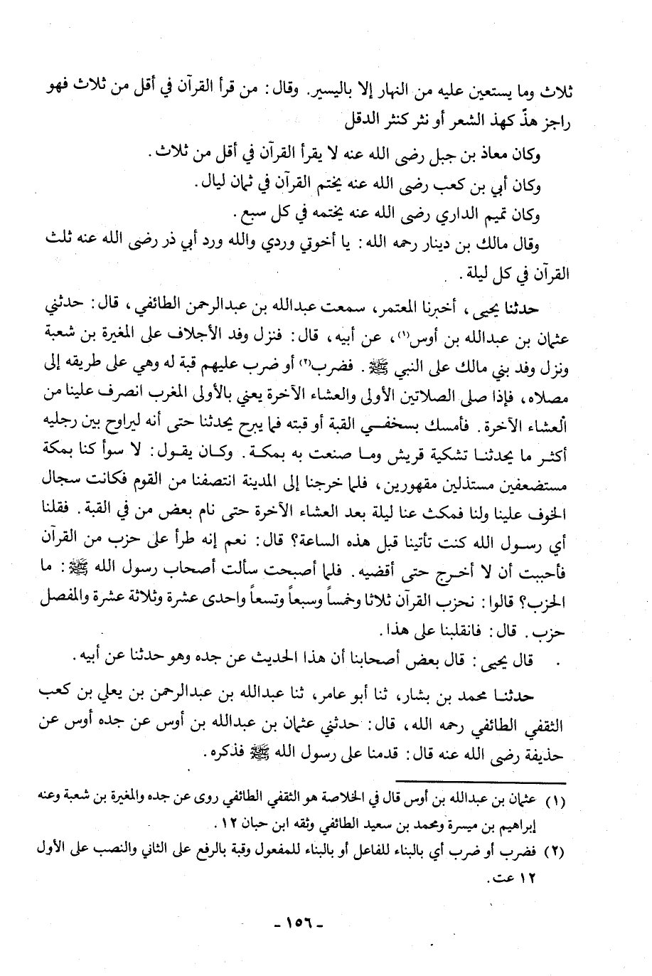 حَدَّثَنَا يَحْيَى، أَخْبَرَنَا الْمُعْتَمِرُ، سَمِعْتُ عَبْدَ اللَّهِ بْنَ عَبْدِ الرَّحْمَنِ الطَّائِفِيُّ، قَالَ: حَدَّثَنِي عُثْمَانُ بْنُ عَبْدِ اللَّهِ بْنِ أَوْسٍ، عَنْ أَبِيهِ، قَالَ: فَنَزَلَ وَفْدُ الْأَحْلَافِ عَلَى الْمُغِيرَةِ بْنِ شُعْبَةَ، وَنَزَلَ وَفْدُ بَنِي مَالِكٍ عَلَى النَّبِيِّ صَلَّى اللَّهُ عَلَيْهِ وَسَلَّمَ فَضَرَبَ أَوْ ضَرَبَ عَلَيْهِمْ قُبَّةً لَهُ وَهِيَ عَلَى طَرِيقِهِ إِلَى مُصَلَّاهُ، فَإِذَا صَلَّى الصَّلَاتَيْنِ الْأُولَى وَالْعِشَاءَ الْآخِرَةَ يَعْنِي بِالْأُولَى الْمَغْرِبَ انْصَرَفَ عَلَيْنَا مِنَ الْعِشَاءِ الْآخِرَةِ، فَأَمْسَكَ بِسُخْفَيِ الْقُبَّةِ أَوْ قُبَّتِهِ فَمَا يَبْرَحُ يُحَدِّثُنَا حَتَّى إِنَّهُ لَيُرَاوِحُ بَيْنَ رِجْلَيْهِ، أَكْثَرُ مَا يُحَدِّثُنَا تَشْكِيَةَ قُرَيْشٍ وَمَا صَنَعَتْ بِهِ بِمَكَّةَ، وَكَانَ يَقُولُ: " §لَا سَوَاءً، كُنَّا بِمَكَّةَ مُسْتَضْعَفِينَ مُسْتَذَلِّينَ مَقْهُورِينَ، فَلَمَّا خَرَجْنَا إِلَى الْمَدِينَةِ انْتَصَفْنَا مِنَ الْقَوْمِ فَكَانَتْ سِجَالًا الْخَوْفُ عَلَيْنَا وَلَنَا، فَمَكَثَ عَنَّا لَيْلَةً بَعْدَ الْعِشَاءِ الْآخِرَةِ حَتَّى نَامَ بَعْضُ مَنْ فِي الْقُبَّةِ، فَقُلْنَا: أَيْ رَسُولَ اللَّهِ صَلَّى اللَّهُ عَلَيْهِ وَسَلَّمَ، كُنْتَ تَأْتِينَا قَبْلَ هَذِهِ السَّاعَةِ؟ قَالَ: " نَعَمْ، إِنَّهُ طَرَأَ عَلَيَّ حِزْبٌ مِنَ الْقُرْآنِ فَأَحْبَبْتُ أَنْ لَا أَخْرُجَ حَتَّى أَقْضِيَهُ، فَلَمَّا أَصْبَحْتُ سَأَلْتُ أَصْحَابَ رَسُولِ اللَّهِ صَلَّى اللَّهُ عَلَيْهِ وَسَلَّمَ: مَا الْحِزْبُ؟ قَالُوا: نَحْزُبُ الْقُرْآنَ ثَلَاثًا وَخَمْسًا وَسَبْعًا وَتِسْعًا وَإِحْدَى عَشْرَةَ وَثَلَاثَةَ عَشَرَ وَالْمُفَصَّلُ حِزْبٌ، قَالَ: فَانْقَلَبْنَا عَلَى هَذَا " قَالَ يُحْيِي: قَالَ بَعْضُ أَصْحَابِنَا إِنَّ هَذَا الْحَدِيثَ عَنْ جَدِّهِ وَهُوَ حَدَّثَنَا عَنْ أَبِيهِ، حَدَّثَنَا مُحَمَّدُ بْنُ بَشَّارٍ، ثنا أَبُو عَامِرٍ، ثنا عَبْدُ اللَّهِ بْنُ عَبْدِ الرَّحْمَنِ بْنِ يَعْلَى بْنِ كَعْبٍ الثَّقَفِيُّ الطَّائِفِيُّ، رَحِمَهُ اللَّهُ، قَالَ: حَدَّثَنِي عُثْمَانُ بْنُ عَبْدِ اللَّهِ بْنِ أَوْسٍ، عَنْ جَدِّهِ أَوْسٍ، عَنْ حُذَيْفَةَ، رَضِيَ اللَّهُ عَنْهُ قَالَ: قَدِمْنَا عَلَى رَسُولِ اللَّهِ صَلَّى اللَّهُ عَلَيْهِ وَسَلَّمَ فَذَكَرَهُ -[157]- وَقَالَ ابْنُ الْهَادِ: سَأَلَنِي نَافِعُ بْنُ جُبَيْرِ بْنِ مُطْعِمٍ: فِي كَمْ تَقْرَأُ الْقُرْآنَ؟ فَقُلْتُ: مَا أُحَزِّبُهُ فَقَالَ: لَا تَقُلْ مَا أُحَزِّبُهُ، فَإِنَّ رَسُولَ اللَّهِ صَلَّى اللَّهُ عَلَيْهِ وَسَلَّمَ قَالَ: «قَرَأْتُ جُزْءًا مِنَ الْقُرْآنِ»