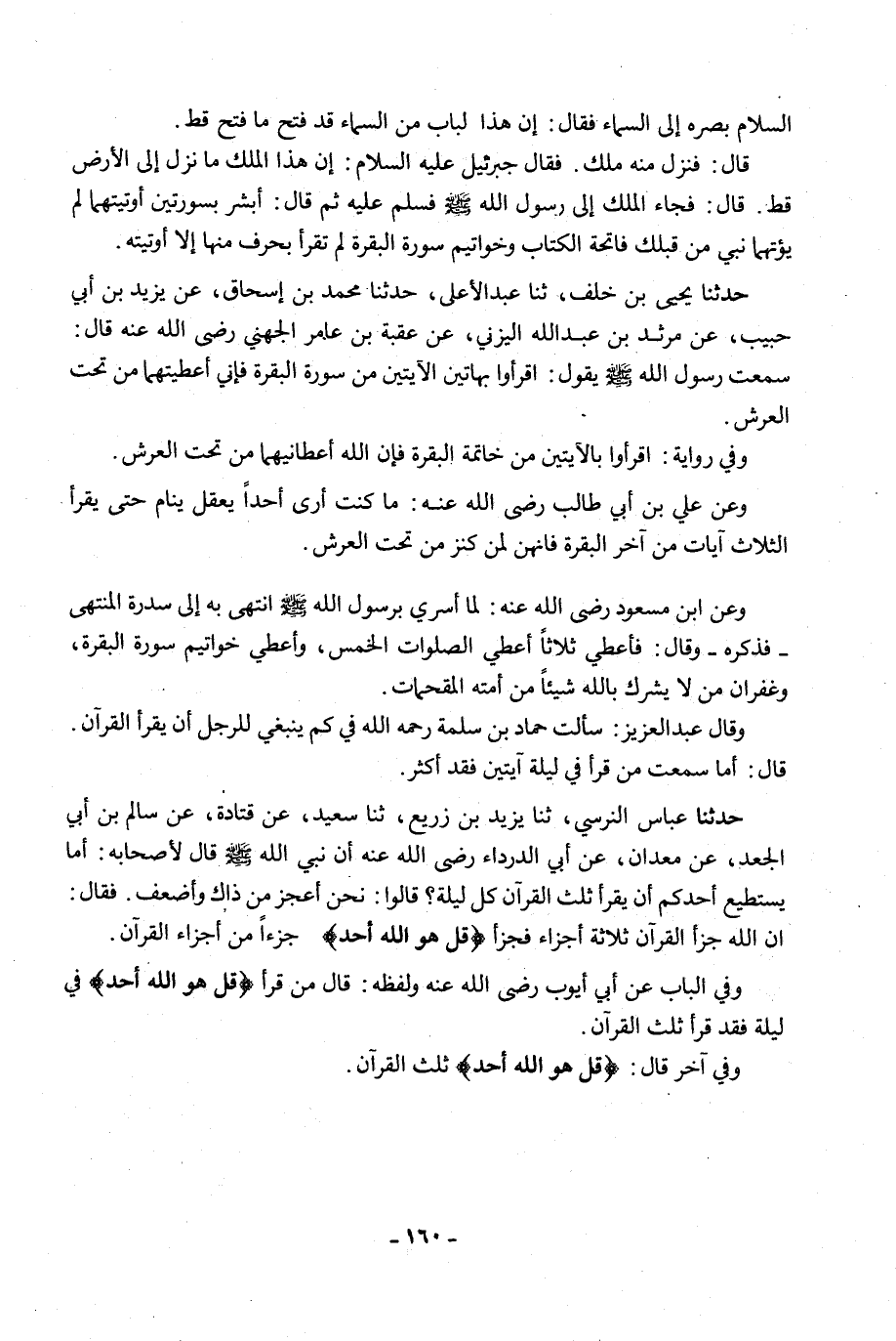 حَدَّثَنَا يَحْيَى بْنُ خَلَفٍ، ثنا عَبْدُ الْأَعْلَى، حَدَّثَنَا مُحَمَّدُ بْنُ إِسْحَاقَ، عَنْ يَزِيدَ بْنِ أَبِي حَبِيبٍ، عَنْ مَرْثَدِ بْنِ عَبْدِ اللَّهِ الْيَزَنِيِّ، عَنْ عُقْبَةَ بْنِ عَامِرٍ الْجُهَنِيِّ، رَضِيَ اللَّهُ عَنْهُ قَالَ: سَمِعْتُ رَسُولَ اللَّهِ صَلَّى اللَّهُ عَلَيْهِ وَسَلَّمَ يَقُولُ: «§اقْرَءُوا بِهَاتَيْنِ الْآيَتَيْنِ مِنْ سُورَةِ الْبَقَرَةِ فَإِنِّي أُعْطِيتُهُمَا مِنْ تَحْتِ الْعَرْشِ» وَفِي رِوَايَةٍ: «اقْرَءُوا بِالْآيَتَيْنِ مِنْ خَاتِمَةِ الْبَقَرَةِ فَإِنَّ اللَّهَ أَعْطَانِيهِمَا مِنْ تَحْتِ الْعَرْشِ» وَعَنْ عَلِيِّ بْنِ أَبِي طَالِبٍ رَضِيَ اللَّهُ عَنْهُ: «مَا كُنْتُ أَرَى أَحَدًا يَعْقِلُ يَنَامُ حَتَّى يَقْرَأَ الثَّلَاثَ آيَاتٍ مِنْ آخِرِ الْبَقَرَةِ فَإِنَّهُنَّ لَمِنْ كَنْزٍ مِنْ تَحْتِ الْعَرْشِ» وَعَنِ ابْنِ مَسْعُودِ رَضِيَ اللَّهُ عَنْهُ: لَمَّا أُسْرِيَ بِرَسُولِ اللَّهِ صَلَّى اللَّهُ عَلَيْهِ وَسَلَّمَ انْتَهَى بِهِ إِلَى سِدْرَةِ الْمُنْتَهَى، فَذَكَرَهُ، وَقَالَ: «فَأُعْطِيَ ثَلَاثًا أُعْطِيَ الصَّلَوَاتِ الْخَمْسِ، وَأُعْطِيَ خَوَاتِيمَ سُورَةِ الْبَقَرَةِ، وَغُفْرَانَ مَنْ لَا يُشْرِكُ بِاللَّهِ شَيْئًا مِنْ أُمَّتِهِ الْمُقْحِمَاتُ» وَقَالَ عَبْدُ الْعَزِيزِ: سَأَلْتُ حَمَّادَ بْنَ سَلَمَةَ رَحِمَهُ اللَّهُ: فِي كَمْ يَنْبَغِي لِلرَّجُلِ أَنْ يَقْرَأَ الْقُرْآنَ؟، قَالَ: أَمَا سَمِعْتَ «مَنْ قَرَأَ فِي لَيْلَةٍ آيَتَيْنِ فَقَدْ أَكْثَرَ»