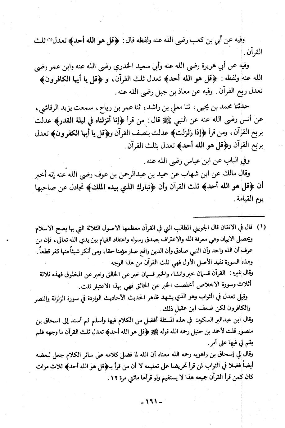 حَدَّثَنَا مُحَمَّدُ بْنُ يَحْيَى، ثنا مُعَلَّى بْنُ رَاشِدٍ، ثنا عُمَرُ بْنُ رَبَاحٍ، سَمِعْتُ يَزِيدَ الرَّقَاشِيَّ، عَنْ أَنَسٍ رَضِيَ اللَّهُ عَنْهُ، عَنِ النَّبِيِّ صَلَّى اللَّهُ عَلَيْهِ وَسَلَّمَ قَالَ: «§مَنْ قَرَأَ إِنَّا أَنْزَلْنَاهُ فِي لَيْلَةِ الْقَدْرِ عُدِلَتْ بِرُبُعِ الْقُرْآنِ، وَمَنْ قَرَأَ إِذَا زُلْزِلَتِ عُدِلَتْ بِنِصْفِ الْقُرْآنِ وَقُلْ يَا أَيُّهَا الْكَافِرُونَ تُعْدَلُ بِرُبُعِ الْقُرْآنِ وَقُلْ هُوَ اللَّهُ أَحَدٌ تُعْدَلُ بِثُلُثِ الْقُرْآنِ» وَفِي الْبَابِ عَنِ ابْنِ عَبَّاسٍ رَضِيَ اللَّهُ عَنْهُ. وَقَالَ مَالِكٌ، عَنِ ابْنِ شِهَابٍ، عَنْ حُمَيْدِ بْنِ عَبْدِ الرَّحْمَنِ بْنِ عَوْفٍ رَضِيَ اللَّهُ عَنْهُ أَنَّهُ أَخْبَرَ أَنَّ «قُلْ هُوَ اللَّهُ أَحَدٌ ثُلُثُ الْقُرْآنِ وَأَنَّ تَبَارَكَ الَّذِي بِيَدِهِ الْمُلْكُ تُجَادِلُ عَنْ صَاحِبِهَا يَوْمَ الْقِيَامَةِ»