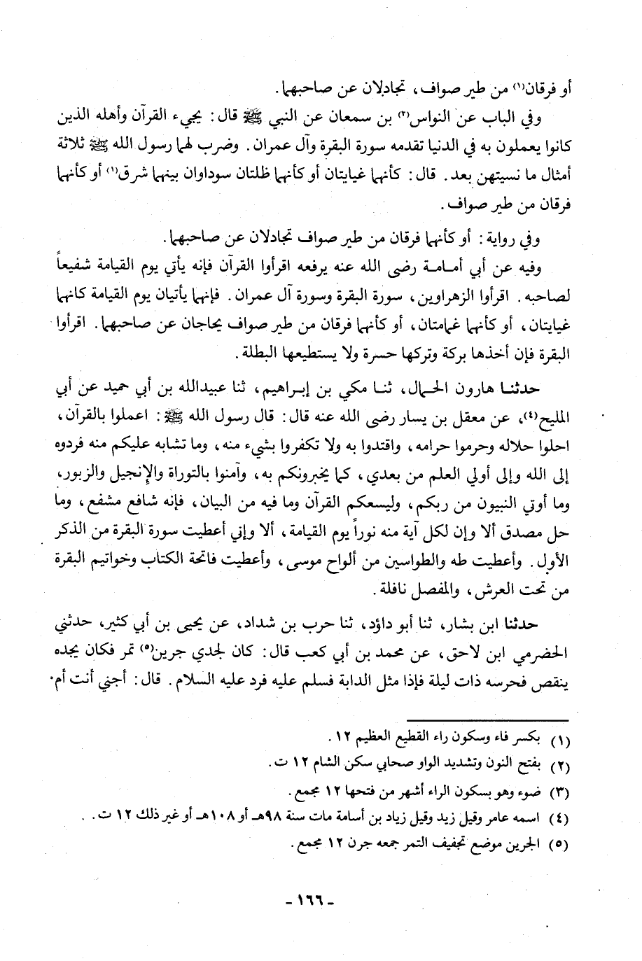 حَدَّثَنَا هَارُونُ الْحَمَّالُ، ثنا مَكِّيُّ بْنُ إِبْرَاهِيمَ، ثنا عُبَيْدُ اللَّهِ بْنُ أَبِي حُمَيْدٍ، عَنْ أَبِي الْمَلِيحِ، عَنْ مَعْقِلِ بْنِ يَسَارٍ، رَضِيَ اللَّهُ عَنْهُ قَالَ: قَالَ رَسُولُ اللَّهِ صَلَّى اللَّهُ عَلَيْهِ وَسَلَّمَ: «§اعْمَلُوا بِالْقُرْآنِ، أَحِلُّوا حَلَالَهُ وَحَرِّمُوا حَرَامَهُ، وَاقْتَدُوا بِهِ وَلَا تَكْفُرُوا بِشَيْءٍ مِنْهُ، وَمَا تَشَابَهَ عَلَيْكُمْ مِنْهُ فَرُدُّوهُ إِلَى اللَّهِ وَإِلَى أُولِي الْعِلْمِ مِنْ بَعْدِي، كَمَا يُخْبِرُونَكُمْ بِهِ، وَآمِنُوا بِالتَّوْرَاةِ وَالْإِنْجِيلِ وَالزَّبُورِ، وَمَا أُوتِي النَّبِيُّونَ مِنْ رَبِّكُمْ، وَلْيَسَعْكُمُ الْقُرْآنُ وَمَا فِيهِ مِنَ الْبَيَانِ، فَإِنَّهُ شَافِعٌ مُشَفَّعٌ، وَمَا حِلٌ مُصَدَّقٌ أَلَا وَإِنَّ لِكُلِّ آيَةٍ مِنْهُ نُورًا يَوْمَ الْقِيَامَةِ، أَلَا وَإِنِّي أُعْطِيتُ سُورَةَ الْبَقَرَةِ مِنَ الذِّكْرِ الْأَوَّلِ، وَأُعْطِيتُ طَهْ وَالطَّوَاسِينَ مِنْ أَلْوَاحِ مُوسَى، وَأُعْطِيتُ فَاتِحَةَ الْكِتَابِ وَخَوَاتِيمَ الْبَقَرَةِ مِنْ تَحْتِ الْعَرْشِ، وَالْمُفَصَّلَ نَافِلَةً»