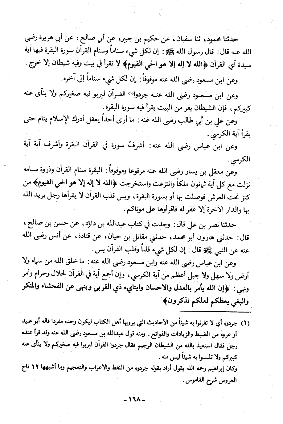 حَدَّثَنَا مَحْمُودٌ، ثنا سُفْيَانُ، عَنْ حَكِيمِ بْنِ جُبَيْرٍ، عَنْ أَبِي صَالِحٍ، عَنْ أَبِي هُرَيْرَةَ، رَضِيَ اللَّهُ عَنْهُ قَالَ: قَالَ رَسُولُ اللَّهِ صَلَّى اللَّهُ عَلَيْهِ وَسَلَّمَ: " §إِنَّ لِكُلِّ شَيْءٍ سَنَامًا، وَسَنَامُ الْقُرْآنِ سُورَةُ الْبَقَرَةِ، فِيهَا آيَةٌ سَيِّدَةُ آيِ الْقُرْآنِ {اللَّهُ لَا إِلَهَ إِلَّا هُوَ الْحَيُّ الْقَيُّومُ} [البقرة: 255] لَا تُقْرَأُ فِي بَيْتٍ وَفِيهِ شَيْطَانٌ إِلَّا خَرَجَ " وَعَنِ ابْنِ مَسْعُودٍ رَضِيَ اللَّهُ عَنْهُ مَوْقُوفًا: «إِنَّ لِكُلِّ شَيْءٍ سَنَامًا» إِلَى آخِرِهِ. وَعَنِ ابْنِ مَسْعُودٍ رَضِيَ اللَّهُ عَنْهُ: «جَرِّدُوا الْقُرْآنَ لِيَرْبُوَ فِيهِ صَغِيرُكُمْ وَلَا يَنَأَى عَنْهُ كَبِيرُكُمْ، فَإِنَّ الشَّيْطَانَ يَفِرُّ مِنَ الْبَيْتِ يُقْرَأُ فِيهِ سُورَةُ الْبَقَرَةِ»، وَعَنْ عَلِيِّ بْنِ أَبِي طَالِبٍ رَضِيَ اللَّهُ عَنْهُ: «مَا أَرَى أَحَدًا يَعْقِلُ أَدْرَكَ الْإِسْلَامَ يَنَامُ حَتَّى يَقْرَأَ آيَةَ الْكُرْسِيِّ» وَعَنِ ابْنِ عَبَّاسٍ رَضِيَ اللَّهُ عَنْهُ: «أَشْرَفُ سُورَةٍ فِي الْقُرْآنِ الْبَقَرَةُ وَأَشْرَفُ آيَةٍ آيَةُ الْكُرْسِيِّ»، وَعَنْ مَعْقِلِ بْنِ يَسَارٍ رَضِيَ اللَّهُ عَنْهُ مَرْفُوعًا وَمَوْقُوفًا: " الْبَقَرَةُ سِنَامُ الْقُرْآنِ وَذِرْوَةُ سِنَامِهِ، نَزَلَتْ مَعَ كُلِّ آيَةٍ ثَمَانُونَ مَلَكًا، وَانْتُزِعَتْ وَاسْتُخْرِجَتْ {اللَّهُ لَا إِلَهَ إِلَّا هُوَ الْحَيُّ الْقَيُّومُ} [البقرة: 255] مِنْ كَنْزٍ تَحْتَ الْعَرْشِ فَوُصِلَتْ بِهَا أَوْ بِسُورَةِ الْبَقَرَةِ، وَيس قَلْبُ الْقُرْآنِ، لَا يَقْرَأُهَا رَجُلٌ يُرِيدُ اللَّهَ بِهَا وَالدَّارَ الْآخِرَةَ إِلَّا غُفِرَ لَهُ فَاقْرَءُوهَا عَلَى مَوْتَاكُمْ "