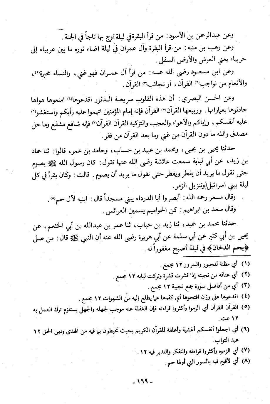 حَدَّثَنَا يَحْيَى بْنُ يَحْيَى، وَمُحَمَّدُ بْنُ عُبَيْدِ بْنِ حِسَابٍ، وَحَامِدُ بْنُ عُمَرَ، قَالُوا: ثنا حَمَّادُ بْنُ زَيْدٍ، عَنْ أَبِي لُبَابَةَ، سَمِعْتُ عَائِشَةَ، رَضِيَ اللَّهُ عَنْهُ تَقُولُ: كَانَ رَسُولُ اللَّهِ صَلَّى اللَّهُ عَلَيْهِ وَسَلَّمَ " §يَصُومُ حَتَّى نَقُولَ مَا يُرِيدُ أَنْ يُفْطِرَ، وَيُفْطِرُ حَتَّى نَقُولَ مَا يُرِيدُ أَنْ يَصُومَ، قَالَتْ: وَكَانَ يَقْرَأُ فِي كُلِّ لَيْلَةٍ بِبَنِي إِسْرَائِيلَ وَتَنْزِيلُ الزُّمَرِ " وَقَالَ مِسْعَرٌ رَحِمَهُ اللَّهُ: أَبْصَرُوا أَبَا الدَّرْدَاءِ يَبْنِي مَسْجِدًا، قَالَ: «أَبْنِيهِ لِآلِ حم» وَقَالَ سَعْدُ بْنُ إِبْرَاهِيمَ: «كُنَّ الْحَوَامِيمَ يُسَمَّيْنَ الْعَرَائِسَ»
