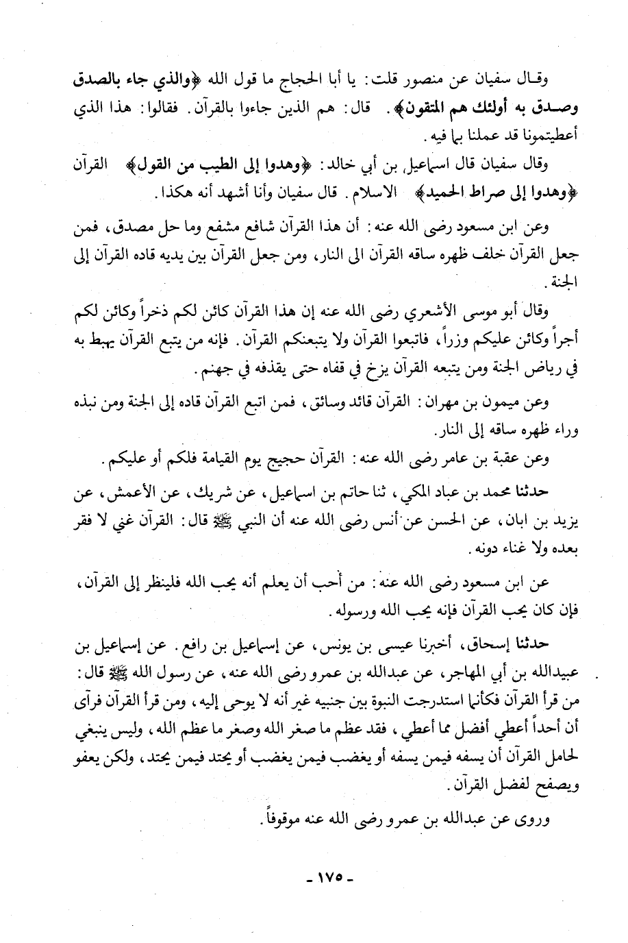 حَدَّثَنَا إِسْحَاقُ، أَخْبَرَنَا عِيسَى بْنُ يُونُسَ، عَنْ إِسْمَاعِيلَ بْنِ رَافِعٍ، عَنْ إِسْمَاعِيلَ بْنِ عُبَيْدِ اللَّهِ بْنِ أَبِي الْمُهَاجِرِ، عَنْ عَبْدِ اللَّهِ بْنِ عَمْرٍو، رَضِيَ اللَّهُ عَنْهُ، عَنْ رَسُولِ اللَّهِ صَلَّى اللَّهُ عَلَيْهِ وَسَلَّمَ قَالَ: «§مَنْ قَرَأَ الْقُرْآنَ فَكَأَنَّمَا اسْتُدْرِجَتِ النُّبُوَّةُ بَيْنَ جَنْبَيْهِ غَيْرَ أَنَّهُ لَا يُوحِي إِلَيْهِ، وَمَنْ قَرَأَ الْقُرْآنَ فَرَأَى أَنَّ أَحَدًا أُعْطِيَ أَفْضَلَ مِمَّا أُعْطِيَ، فَقَدْ عَظَّمَ مَا صَغَّرَ اللَّهُ، وَصَغَّرَ مَا عَظَّمَ اللَّهُ، وَلَيْسَ يَنْبَغِي لِحَامِلِ الْقُرْآنِ أَنْ يُسَفِّهَ فِيمَنْ يُسَفِّهُ، أَوْ يَغْضَبَ فِيمَنْ يَغْضَبُ، أَوْ يَحْتَدُّ فِيمَنْ يَحْتَدُّ، وَلَكِنْ يَعْفُو وَيَصْفَحُ لِفَضْلِ الْقُرْآنِ» وَرُوِيَ عَنْ عَبْدِ اللَّهِ بْنِ عَمْرٍو رَضِيَ اللَّهُ عَنْهُ مَوْقُوفًا -[176]- وَقَالَ الْحَسَنُ: " إِنَّ هَذَا الْقُرْآنَ قَرَأَهُ عَبِيدٌ وَصِبْيَانٌ لَا عِلْمَ لَهُمْ بِتَأْوِيلِهِ، وَلَمْ يَأْتُوا الْأَمْرَ مِنْ قِبَلِ أَوَّلِهِ، قَالَ اللَّهُ تَعَالَى: {كِتَابٌ أَنْزَلْنَاهُ إِلَيْكَ مُبَارَكٌ لِيَدَّبَّرُوا آيَاتِهِ} [ص: 29]، وَمَا تَدَبَّرَ آيَاتِهِ إِلَّا أَتْبَاعُهُ مَا هُوَ بِحِفْظِ حُرُوفِهِ وَإِضَاعَةِ حُدُودِهِ، حَتَّى إِنَّ أَحَدَهُمْ لَيَقُولُ: قَدْ قَرَأْتُ الْقُرْآنَ كُلَّهُ، فَمَا أَسْقَطَ مِنْهُ حَرْفًا وَقَدْ وَاللَّهِ أَسْقَطَهُ كُلَّهُ، مَا تَرَى الْقُرْآنَ لَهُ فِي خُلُقٍ وَلَا عَمِلٍ وَحَتَّى عَنْ أَحَدِهِمْ لَيَقُولُ: إِنِّي لَأَقْرَأُ السُّورَةَ فِي نَفَسٍ، وَاللَّهِ مَا هَؤُلَاءِ بِالْقُرَّاءِ وَلَا الْعُلَمَاءِ وَلَا الْحُكَمَاءِ وَلَا الْوَرِعَةِ، وَمَتَى كَانَتِ الْقُرَّاءُ تَقُولُ مِثْلَ هَذَا، لَا أَكْثَرَ اللَّهُ فِي النَّاسِ مِثْلَ هَؤُلَاءِ " وَقَالَ: «مَا بَقِيَ فِي أَيْدِينَا بَقِيَّةٌ غَيْرُ هَذَا الْقُرْآنِ، فَاتَّخِذُوهُ إِمَامًا وَائْتَمِنُوهُ عَلَى أَنْفُسِكُمْ، وَاسْتَغْشُوا عَلَيْهِ أَهْوَاءَكُمْ وَاعْلَمُوا أَنَّهُ شَافِعٌ مُشَفَّعٌ وَمَاحِلٌ مُصَدَّقٌ، مَنْ يَشْفَعْ لَهُ الْقُرْآنُ يَوْمَ الْقِيَامَةِ يَشْفَعْ فِيهِ وَمَنْ مَحَلَ بِهِ صُدِّقَ عَلَيْهِ، وَايْمُ اللَّهِ إِنَّ مِنْ شِرَارِ هَذِهِ الْأُمَّةِ أَقْوَامًا قَرَءُوا هَذَا الْقُرْآنَ جَهِلُوا سُنَّتَهُ، وَحَرَّفُوهُ عَنْ مَوَاضِعِهِ، وَإِنَّ أَحَقَّ النَّاسِ بِهَذَا الْقُرْآنِ مَنْ عَمِلَ بِهِ وَإِنْ كَانَ لَا يَقْرَؤُهُ» وَعَنْ قَتَادَةَ: " لَمْ يُجَالِسْ هَذَا الْقُرْآنَ أَحَدٌ إِلَّا قَامَ مِنْهُ بِزِيَادَةٍ أَوْ نُقْصَانٍ، قَضَاءُ اللَّهِ الَّذِي قَضَى: {شِفَاءٌ وَرَحْمَةٌ لِلْمُؤْمِنِينَ وَلَا يَزِيدُ الظَّالِمِينَ إِلَّا خَسَارًا} [الإسراء: 82] " وَعَنْ مُطَرِّفٍ رَحِمَهُ اللَّهُ {إِنَّ الَّذِينَ يَتْلُونَ كِتَابَ اللَّهِ وَأَقَامُوا الصَّلَاةَ وَأَنْفَقُوا مِمَّا رَزَقْنَاهُمْ سِرًّا وَعَلَانِيَةً يَرْجُونَ تِجَارَةً لَنْ تَبُورَ} [فاطر: 29] قَالَ: هَذِهِ آيَةُ الْقُرَّاءِ "، وَعَنْ عَبْدِ اللَّهِ بْنِ عُمَيْرٍ رَحِمَهُ اللَّهُ: كَانَ يُقَالُ: «إِنَّ أَنْقَى النَّاسِ عُقُولًا قُرَّاءُ الْقُرْآنِ» وَكَانَ فَضَالَةُ بْنُ عُبَيْدٍ يَمُرُّ بِالْمَجَالِسِ فِي الْمَسْجِدِ وَهُمْ يَدْرُسُونَ فَيَقُولُ: «كِتَابُ اللَّهِ عَزَّرْتُمْ وَبَيْتَ اللَّهِ عَمَرْتُمْ وَبِرَوحِ اللَّهِ ائْتَلَفْتُمْ فَأَحَبَّكُمُ اللَّهُ وَأَحَبَّ مَنْ أَحَبَّكُمْ» وَقَالَ مَالِكُ بْنُ دِينَارٍ رَحِمَهُ اللَّهُ: إِنَّ الصِّدِّيقِينَ إِذَا قُرِئَ عَلَيْهِمُ الْقُرْآنُ طَرَبَتْ قُلُوبُهُمْ إِلَى الْآخِرَةِ، ثُمَّ يَقُولُ: خُذُوا فَيَقْرَأُ، وَيَقُولُ: اسْمَعُوا مَ