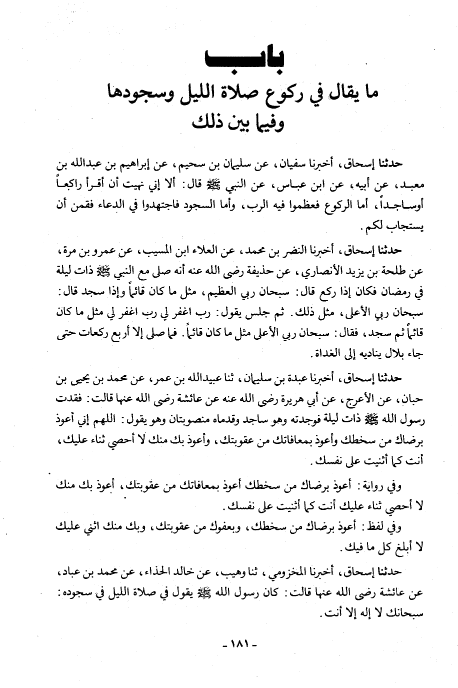 حَدَّثَنَا إِسْحَاقُ، أَخْبَرَنَا عَبْدَةُ بْنُ سُلَيْمَانَ، ثنا عُبَيْدُ اللَّهِ بْنُ عُمَرَ، عَنْ مُحَمَّدِ بْنِ يَحْيَى بْنِ حَبَّانَ، عَنِ الْأَعْرَجِ، عَنْ أَبِي هُرَيْرَةَ رَضِيَ اللَّهُ عَنْهُ، عَنْ عَائِشَةَ، رَضِيَ اللَّهُ عَنْهَا قَالَتْ: فَقَدْتُ رَسُولَ اللَّهِ صَلَّى اللَّهُ عَلَيْهِ وَسَلَّمَ ذَاتَ لَيْلَةٍ فَوَجَدْتُهُ وَهُوَ سَاجِدٌ وَقَدَمَاهُ مَنْصُوبَتَانِ وَهُوَ يَقُولُ: «§اللَّهُمَّ إِنِّي أَعُوذُ بِرِضَاكَ مِنْ سَخَطِكَ، وَأَعُوذُ بِمُعَافَاتِكَ مِنْ عُقُوبَتِكَ، وَأَعُوذُ بِكَ مِنْكَ لَا أُحْصِي ثَنَاءً عَلَيْكَ، أَنْتَ كَمَا أَثْنَيْتَ عَلَى نَفْسِكَ» وَفِي رِوَايَةٍ: «أَعُوذُ بِرِضَاكَ مِنْ سَخَطِكَ، أَعُوذُ بِمُعَافَاتِكَ مِنْ عُقُوبَتِكَ، أَعُوذُ بِكَ مِنْكَ، لَا أُحْصِي ثَنَاءً عَلَيْكَ، أَنْتَ كَمَا أَثْنَيْتَ عَلَى نَفْسِكَ» وَفِي لَفْظٍ: «أَعُوذُ بِرِضَاكَ مِنْ سَخَطِكَ، وَبِعَفْوِكَ مِنْ عُقُوبَتِكَ، وَبِكَ مِنْكَ أَثْنَيْ عَلَيْكَ لَا أَبْلُغُ كُلَّ مَا فِيكَ»