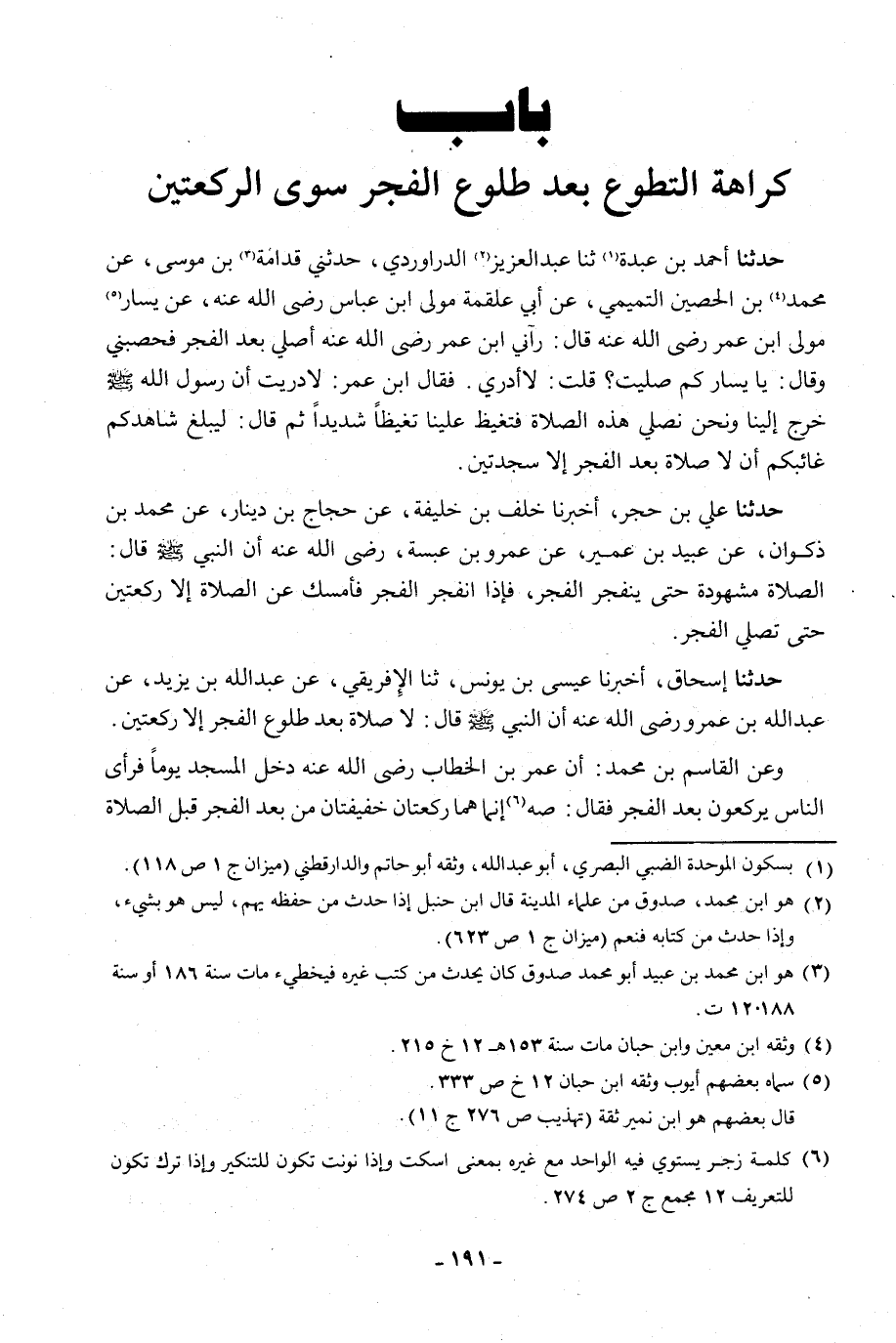 حَدَّثَنَا إِسْحَاقُ، أَخْبَرَنَا عِيسَى بْنُ يُونُسَ، ثنا الْإِفْرِيقِيُّ، عَنْ عَبْدِ اللَّهِ بْنِ يَزِيدَ، عَنْ عَبْدِ اللَّهِ بْنِ عَمْرٍو رَضِيَ اللَّهُ عَنْهُ أَنَّ النَّبِيَّ صَلَّى اللَّهُ عَلَيْهِ وَسَلَّمَ قَالَ: «§لَا صَلَاةَ بَعْدَ طُلُوعِ الْفَجْرِ إِلَّا رَكْعَتَيْنِ» وَعَنِ الْقَاسِمِ بْنِ مُحَمَّدٍ: أَنَّ عُمَرَ بْنَ الْخَطَّابِ رَضِيَ اللَّهُ عَنْهُ دَخَلَ الْمَسْجِدَ يَوْمًا فَرَأَى النَّاسَ يَرْكَعُونَ بَعْدَ الْفَجْرِ فَقَالَ: «صَهٍ إِنَّمَا هُمَا رَكْعَتَانِ خَفِيفَتَانِ مِنْ بَعْدِ الْفَجْرِ قَبْلَ الصَّلَاةِ -[192]- وَلَوْ كُنْتُ تَقَدَّمْتُ فِي ذَلِكَ لَكَانَ مِنِّي غِيَرٌ»، ابْنُ جُرَيْجٍ: قُلْتُ لِعَطَاءٍ: أَتَكْرَهُ الصَّلَاةَ إِذَا انْتَشَرَ الْفَجْرُ عَلَى رُءُوسِ الْجِبَالِ إِلَّا رَكْعَتَيِ الْفَجْرِ؟، فَقَالَ: نَعَمْ. أَخْبَرَنِي إِمَّا مِينَا أَبُو عَبْدِ الرَّحْمَنِ بْنُ مِينَا، وَإِمَّا سُلَيْمٌ مَوْلَى سَعْدٍ قَالَ: جِئْتُ الْمَسْجِدَ بَعْدَ الْفَجْرِ فَجَعَلْتُ أُصَلِّي، فَقَالَ ابْنُ عُمَرَ: مَا هَذَا؟ قُلْتُ: إِنِّي لَمْ أُصَلِّ الْبَارِحَةَ، فَقَالَ ابْنُ عُمَرَ رَضِيَ اللَّهُ عَنْهُ: «إِنَّمَا هُمَا رَكْعَتَانِ»، أَبُو سَعِيدٍ رَضِيَ اللَّهُ عَنْهُ: شَهِدْتُ عُرْوَةَ بْنَ الزُّبَيْرِ وَابْنَ عُمَرَ رَضِيَ اللَّهُ عَنْهُ يَتَحَدَّثَانِ عِنْدَ الْمَقَامِ فَجَاءَ أَعْرَابِيٌّ فَصَلَّى فَجَعَلَ يَرْكَعُ وَيَسْجُدُ وَيُصَلِّي أَكْثَرَ مِنَ الرَّكْعَتَيْنِ، فَنَادَاهُ ابْنُ عُمَرَ رَضِيَ اللَّهُ عَنْهُ «أَنْ لَا صَلَاةَ بَعْدَ طُلُوعِ الْفَجْرِ إِلَّا رَكْعَتَيِ الْفَجْرِ ثُمَّ صَلِّ بَعْدَ ذَلِكَ مَا بَدَالَكَ»، مُجَاهِدٌ رَحِمَهُ اللَّهُ: قَدِمْتُ عَلَى ابْنِ عُمَرَ رَضِيَ اللَّهُ عَنْهُ الْمَدِينَةَ فَبَصُرَ بِرَجُلٍ يُكْثِرُ الرُّكُوعَ فِي الْفَجْرِ قَبْلَ الصَّلَاةِ، فَجَبَذَهُ بِثَوْبِهِ حَتَّى أَجْلَسَهُ فَقَالَ: إِنَّمَا هُمَا رَكْعَتَانِ «، وَعَنِ ابْنِ عُمَرَ رَضِيَ اللَّهُ عَنْهُ» إِذَا طَلَعَ الْفَجْرُ فَلَا صَلَاةَ إِلَّا رَكْعَتَيْنِ "، طَاوُسُ رَحِمَهُ اللَّهُ عَنِ ابْنِ عُمَرَ رَضِيَ اللَّهُ عَنْهُ وَابْنِ عَبَّاسٍ رَضِيَ اللَّهُ عَنْهُ قَالَا: «لَا صَلَاةَ بَعْدَ طُلُوعِ الْفَجْرِ إِلَّا الرَّكْعَتَيْنِ اللَّتَيْنِ قَبْلَ صَلَاةِ الْفَجْرِ»، عَمْرُو بْنُ مُرَّةَ رَحِمَهُ اللَّهُ: كُنْتُ بِالْمَدِينَةِ فَوُعِكْتُ فَلَمْ أُصَلِّ مِنَ اللَّيْلِ، فَجِئْتُ بَعْدَ طُلُوعِ الْفَجْرِ فَصَلَّيْتُ سِتَّ رَكَعَاتٍ، فَرَآنِي سَعِيدُ بْنُ الْمُسَيِّبِ فَقَالَ: قَدْ رَأَيْتَ صَلَاتَكَ، فَقُلْتُ: إِنِّي كُنْتُ وُعِكْتُ فَلَمْ أُصَلِّ مِنَ اللَّيْلِ، فَقَالَ: إِنَّمَا هُمَا رَكْعَتَانِ "، أَبُو رَبَاحٍ رَحِمَهُ اللَّهُ: رَأَى سَعِيدُ بْنُ الْمُسَيِّبِ رَحِمَهُ اللَّهُ رَجُلًا يُصَلِّي بَعْدَ طُلُوعِ الْفَجْرِ فَنَهَاهُ فَقَالَ: تَخَافُ أَنْ يُعَذِّبَنِي اللَّهُ عَلَى الصَّلَاةِ، فَقَالَ: «أَخَافُ أَنْ يُعَذِّبَكَ اللَّهُ عَلَى خِلَافِكَ السُّنَّةَ»، قَتَادَةُ رَحِمَهُ اللَّهُ عَنْ حُمَيْدِ بْنِ عَبْدِ الرَّحْمَنِ، وَالْعَلَاءِ بْنِ زِيَادٍ " أَنَّهُمَا كَرِهَا أَنْ يُصَلِّيَا بَعْدَ طُلُوعِ الْفَجْرِ أَكْثَرَ مِنْ رَكْعَتَيْنِ، فَسَأَلْتُ الْحَسَنَ رَحِمَهُ اللَّهُ فَقَالَ: إِنِّي لَأَكْرَهُهُ وَمَا سَمِعْتُ فِيهِ بِشَيْءٍ "