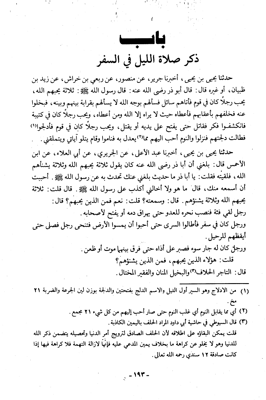 حَدَّثَنَا يَحْيَى بْنُ يَحْيَى، أَخْبَرَنَا جَرِيرٌ، عَنْ مَنْصُورٍ، عَنْ رِبْعِيِّ بْنِ حِرَاشٍ، عَنْ زَيْدِ بْنِ ظَبْيَانَ، أَوْ غَيْرِهِ، قَالَ: قَالَ أَبُو ذَرٍّ رَضِيَ اللَّهُ عَنْهُ: قَالَ رَسُولُ اللَّهِ صَلَّى اللَّهُ عَلَيْهِ وَسَلَّمَ: «§ثَلَاثَةٌ يُحِبُّهُمُ اللَّهُ؛ يُحِبُّ رَجُلًا كَانَ مِنْ قَوْمٍ فَأَتَاهُمْ سَائِلٌ فَسَأَلَهُمْ بِوَجْهِ اللَّهِ لَا يَسْأَلُهُمُ بِقَرَابَةٍ بَيْنَهُمْ وَبَيْنَهُ، فَبَخِلُوا عَنْهُ فَخَلَفَهُمْ بِأَعْقَابِهِمْ فَأَعْطَاهُ حَيْثُ لَا يَرَاهُ إِلَّا اللَّهُ وَمَنْ أَعْطَاهُ، وَيُحِبُّ رَجُلًا كَانَ فِي كَتِيبَةٍ فَانْكَشَفُوا فَكَرَّ فَقَاتَلَ حَتَّى يُفْتَحَ عَلَى يَدَيْهِ أَوْ يُقْتَلَ، وَيُحِبُّ رَجُلًا كَانَ فِي قَوْمٍ فَأَدْلَجُوا فَطَالَتْ دُلْجَتُهُمْ فَنَزَلُوا وَالنَّوْمُ أَحَبُّ إِلَيْهِمْ مِمَّا يُعْدَلُ بِهِ فَنَامُوا وَقَامَ يَتْلُو آيَاتِي وَيَتَمَلَّقُنِي»