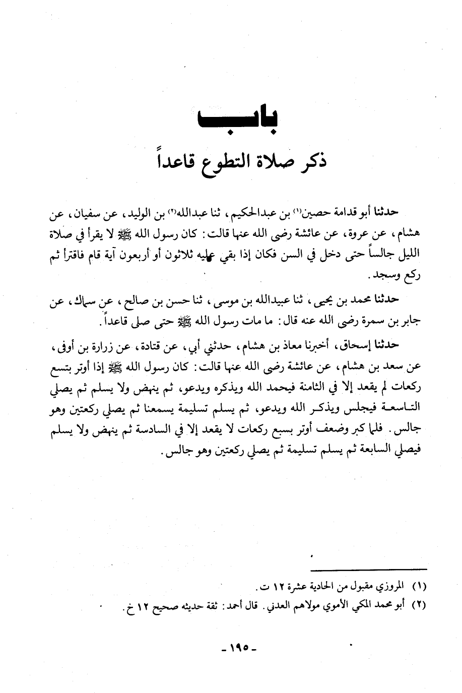 حَدَّثَنَا أَبُو قُدَامَةَ حُصَيْنُ بْنُ عَبْدِ الْحَكِيمِ، ثنا عَبْدُ اللَّهِ بْنُ الْوَلِيدِ، عَنْ سُفْيَانَ، عَنْ هِشَامٍ، عَنْ عُرْوَةَ، عَنْ عَائِشَةَ، رَضِيَ اللَّهُ عَنْهَا قَالَتْ: كَانَ رَسُولُ اللَّهِ صَلَّى اللَّهُ عَلَيْهِ وَسَلَّمَ §لَا يَقْرَأُ فِي صَلَاةِ اللَّيْلِ جَالِسًا حَتَّى دَخَلَ فِي السِّنِّ فَكَانَ إِذَا بَقِيَ عَلَيْهِ ثَلَاثُونَ أَوْ أَرْبَعُونَ آيَةً قَامَ فَاقْتَرَأَ ثُمَّ رَكَعَ وَسَجَدَ "