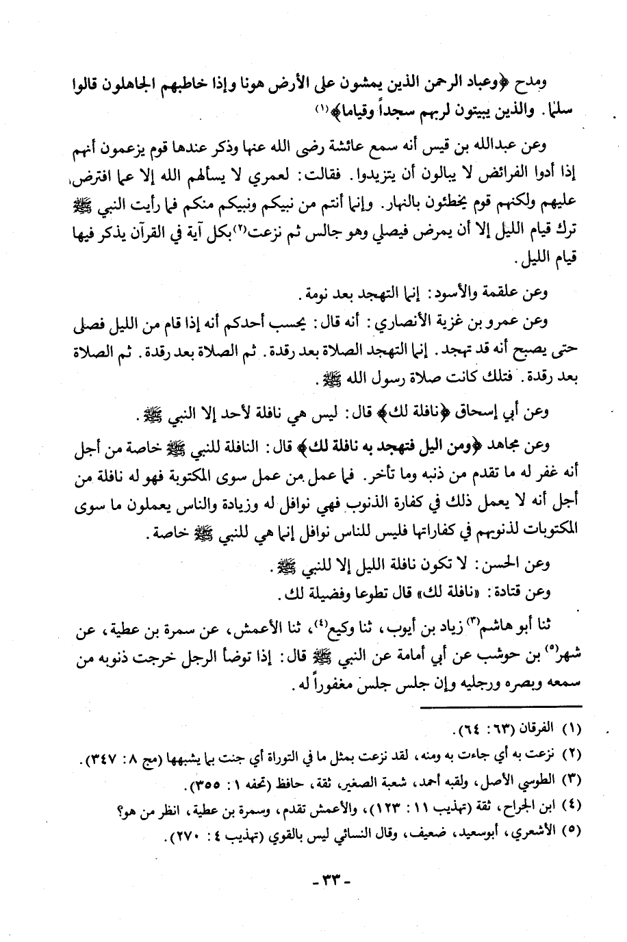 وَمَدَحَ {وَعِبَادُ الرَّحْمَنِ الَّذِينَ يَمْشُونَ عَلَى الْأَرْضِ هَوْنًا وَإِذَا خَاطَبَهُمُ الْجَاهِلُونَ قَالُوا سَلَامًا، الَّذِينَ يَبِيتُونَ لِرَبِّهِمْ سُجَّدًا وَقِيَامًا} وَعَنْ عَبْدِ اللَّهِ بْنِ قَيْسٍ أَنَّهَ سَمِعَ عَائِشَةَ رَضِيَ اللَّهُ عَنْهَا وَذُكِرَ عِنْدَهَا قَوْمٌ يَزْعُمُونَ أَنَّهُمْ إِذَا أَدُّوا الْفَرَائِضَ لَا يُبَالُونَ أَنْ يَتَزَيَّدُوا. فَقَالَتْ: لَعَمْرِي لَا يَسْأَلُهُمُ اللَّهُ إِلَّا عَمَّا افْتَرَضَ عَلَيْهِمْ، وَلَكِنَّهُمْ قَوْمٌ يُخْطِئُونَ بِالنَّهَارِ. وَإِنَّمَا أَنْتُمْ مِنْ نَبِيِّكُمْ وَنَبِيُّكُمْ مِنْكُمْ، فَمَا رَأَيْتُ النَّبِيَّ صَلَّى اللَّهُ عَلَيْهِ وَسَلَّمَ تَرَكَ قِيَامَ اللَّيْلِ إِلَّا أَنْ يَمْرَضَ فَيُصَلِّي وَهَوَ جَالِسٌ، ثُمَّ نَزَعَتْ بِكُلِّ آيَةٍ فِي الْقُرْآنِ يُذْكَرُ فِيهَا قِيَامُ اللَّيْلِ وَعَنْ عَلْقَمَةَ وَالْأَسْوَدِ: إِنَّمَا التَّهَجُّدُ بَعْدَ نَوْمَةٍ وَعَنْ عَمْرِو بْنِ غَزِيَّةَ الْأَنْصَارِيِّ أَنَّهُ قَالَ: يَحْسِبُ أَحَدُكُمْ أَنَّهُ إِذَا قَامَ مِنَ اللَّيْلِ فَصَلَّى حَتَّى يُصْبِحَ أَنَّهُ قَدْ تَهَجَّدَ. إِنَّمَا التَّهَجُّدُ الصَّلَاةُ بَعْدَ رَقْدَةٍ. ثُمَّ الصَّلَاةُ بَعْدَ رَقْدَةٍ. ثُمَّ الصَّلَاةُ بَعْدَ رَقْدَةٍ. فَتِلْكَ كَانَتْ صَلَاةَ رَسُولِ اللَّهِ صَلَّى اللَّهُ عَلَيْهِ وَسَلَّمَ وَعَنْ أَبِي إِسْحَاقَ {نَافِلَةً لَكَ} [الإسراء: 79] قَالَ: لَيْسَ هِيَ نَافِلَةٌ لِأَحَدٍ إِلَّا لِلنَّبِيِّ صَلَّى اللَّهُ عَلَيْهِ وَسَلَّمَ وَعَنْ مُجَاهِدٍ {وَمِنَ اللَّيْلِ فَتَهَجَّدْ بِهِ نَافِلَةً لَكَ} [الإسراء: 79] قَالَ: النَّافِلَةُ لِلنَّبِيِّ صَلَّى اللَّهُ عَلَيْهِ وَسَلَّمَ خَاصَّةً مِنْ أَجْلِ أَنَّهُ غُفِرَ لَهُ مَا تَقَدَّمَ مِنْ ذَنْبِهِ وَمَا تَأَخَّرَ. فَمَا عَمِلَ مِنْ عَمَلٍ سِوَى الْمَكْتُوبَةِ فَهُوَ لَهُ نَافِلَةٌ مِنْ أَجْلِ أَنَّهُ لَا يَعْمَلُ ذَلِكَ فِي كَفَّارَةِ الذُّنُوبِ فَهِيَ نَوَافِلُ لَهُ وَزِيَادَةٌ، وَالنَّاسُ يَعْمَلُونَ مَا سِوَى الْمَكْتُوبَاتِ لِذُنُوبِهِمْ فِي كَفَّارَتِهَا، فَلَيْسَ لِلنَّاسِ نَوَافِلُ، إِنَّمَا هِيَ لِلنَّبِيِّ صَلَّى اللَّهُ عَلَيْهِ وَسَلَّمَ خَاصَّةً وَعَنِ الْحَسَنِ: لَا تَكُونُ نَافِلَةُ اللَّيْلِ إِلَّا لِلنَّبِيِّ صَلَّى اللَّهُ عَلَيْهِ وَسَلَّمَ وَعَنْ قَتَادَةَ: {نَافِلَةً لَكَ} [الإسراء: 79] قَالَ: تَطَوُّعًا وَفَضِيلَةً لَكَ