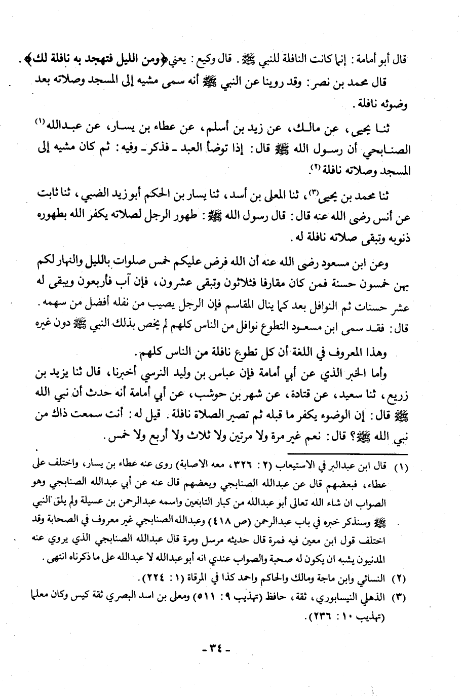 ثنا مُحَمَّدُ بْنُ يَحْيَى، ثنا الْمُعَلَّى بْنُ أَسَدٍ، ثنا بَشَّارُ بْنُ الْحَكَمِ أَبُو زَيْدٍ الضَّبِّيُّ، ثنا ثَابِتٌ، عَنْ أَنَسٍ، رَضِيَ اللَّهُ عَنْهُ قَالَ: قَالَ رَسُولُ اللَّهِ صَلَّى اللَّهُ عَلَيْهِ وَسَلَّمَ: «§طَهُورُ الرَّجُلِ لِصَلَاتِهِ يُكَفِّرُ اللَّهُ بِطَهُورِهِ ذُنُوبَهُ وَتَبْقَى صَلَاتُهُ نَافِلَةً لَهُ» وَعَنِ ابْنِ مَسْعُودٍ رَضِيَ اللَّهُ عَنْهُ إِنَّ اللَّهَ فَرَضَ عَلَيْكُمْ خَمْسَ صَلَوَاتٍ بِاللَّيْلِ وَالنَّهَارِ، لَكُمْ بِهِنَّ خَمْسُونَ حَسَنَةً، فَمَنْ كَانَ مُقَارِفًا فَثَلَاثُونَ، وَتَبْقَى عِشْرُونَ، فَإِنْ آبَ فَأَرْبَعُونَ وَيَبْقَى لَهُ عَشْرُ حَسَنَاتٍ ثُمَّ النَّوَافِلُ بَعْدُ، كَمَا يَنَالُ الْمَقَاسِمَ فَإِنَّ الرَّجُلَ يُصِيبُ مِنْ نَفْلِهِ أَفْضَلَ مِنْ سَهْمِهِ قَالَ: فَقَدْ سَمَّى ابْنُ مَسْعُودٍ التَّطَوُّعَ نَوَافِلَ مِنَ النَّاسِ كُلِّهِمْ لَمْ يَخُصَّ بِذَلِكَ النَّبِيَّ صَلَّى اللَّهُ عَلَيْهِ وَسَلَّمَ دُونَ غَيْرِهِ، وَهَذَا الْمَعْرُوفُ فِي اللُّغَةِ؛ أَنَّ كُلَّ تَطَوُّعٍ نَافِلَةٌ مِنَ النَّاسِ كُلِّهِمْ
