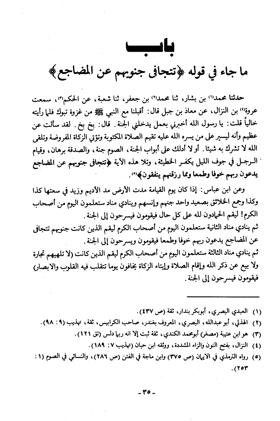 حَدَّثَنَا مُحَمَّدُ بْنُ بَشَّارٍ، ثنا مُحَمَّدُ بْنُ جَعْفَرٍ، ثنا شُعْبَةُ، عَنِ الْحَكَمِ، سَمِعْتُ عُرْوَةَ بْنَ النَّزَّالِ، عَنْ مُعَاذِ بْنِ جَبَلٍ، قَالَ: أَقْبَلْنَا مَعَ النَّبِيِّ صَلَّى اللَّهُ عَلَيْهِ وَسَلَّمَ مِنْ غَزْوَةِ تَبُوكَ فَلَمَّا رَأَيْتُهُ خَالِيًا قُلْتُ: يَا رَسُولَ اللَّهِ أَخْبِرْنِي بِعَمَلٍ يُدْخِلُنِي الْجَنَّةَ. قَالَ: «بَخٍ بَخٍ، لَقَدْ §سَأَلْتَ عَنْ عَظِيمٍ، وَأَنَّهُ لَيَسِيرٌ عَلَى مَنْ يَسَّرَهُ اللَّهُ عَلَيْهِ، تُقِيمُ الصَّلَاةَ الْمَكْتُوبَةَ، وَتُؤْتِي الزَّكَاةَ الْمَفْرُوضَةَ، وَتَلْقَى اللَّهَ لَا تُشْرِكُ بِهِ شَيْئًا، أَوَلَا أَدُلُّكَ عَلَى أَبْوَابِ الْجَنَّةِ، الصَّوْمُ جُنَّةٌ، وَالصَّدَقَةُ بُرْهَانٌ، وَقِيَامُ الرَّجُلِ فِي جَوْفِ اللَّيْلِ يُكَفِّرُ الْخَطِيئَةَ»، وَتَلَا هَذِهِ الْآيَةَ {تَتَجَافَى جُنُوبُهُمْ عَنِ الْمَضَاجِعِ يَدْعُونَ رَبَّهُمْ خَوْفًا وَطَمَعًا وَمِمَّا رَزَقْنَاهُمْ يُنْفِقُونَ} [السجدة: 16] " وَعَنِ ابْنِ عَبَّاسٍ: إِذَا كَانَ يَوْمُ الْقِيَامَةِ مُدَّتِ الْأَرْضُ مَدَّ الْأَدِيمِ، وَزِيدَ فِي سَعَتِهَا كَذَا وَكَذَا، وَجُمِعَ الْخَلَائِقُ بِصَعِيدٍ وَاحِدٍ جِنُّهُمْ وَإِنْسُهُمْ وَيُنَادِي مُنَادٍ: سَتَعْلَمُونَ الْيَوْمَ مَنْ أَصْحَابُ الْكَرَمِ لِيَقُمِ الْحَمَّادُونَ لِلَّهِ عَلَى كُلِّ حَالٍ، فَيَقُومُونَ فَيُسَرَّحُونَ إِلَى الْجَنَّةِ، ثُمَّ يُنَادِي مُنَادٍ الثَّانِيَةَ سَتَعْلَمُونَ الْيَوْمَ مَنْ أَصْحَابُ الْكَرَمِ: لِيَقُمِ الَّذِينَ كَانَتْ جُنُوبُهُمْ تَتَجَافَى عَنِ الْمَضَاجِعِ يَدْعُونَ رَبَّهُمْ خَوْفًا وَطَمَعًا فَيَقُومُونَ وَيُسَرَّحُونَ إِلَى الْجَنَّةِ. ثُمَّ يُنَادِي مُنَادٍ الثَّالِثَةَ: سَتَعْلَمُونَ الْيَوْمَ مَنْ أَصْحَابُ الْكَرَمِ لِيَقُمِ الَّذِينَ كَانَتْ {لَا تُلْهِيهِمْ تِجَارَةٌ وَلَا بَيْعٌ عَنْ ذِكْرِ اللَّهِ وَإِقَامِ الصَّلَاةِ وَإِيتَاءِ الزَّكَاةِ يَخَافُونَ يَوْمًا تَتَقَلَّبُ فِيهِ الْقُلُوبُ وَالْأَبْصَارُ} [النور: 37] فَيَقُومُونَ فَيُسَرَّحُونَ إِلَى الْجَنَّةِ. -[36]- فَإِذَا أَخَذَ هَؤُلَاءِ الثَّلَاثَةَ خَرَجَ عُنُقٌ مِنَ النَّارِ لَهُ عَيْنَانِ بَصِيرَتَانِ وَلِسَانٌ فَصِيحٌ فَيَقُولُ: إِنِّي وُكِّلْتُ بِثَلَاثَةٍ؛ بِكُلِّ جَبَّارٍ عَنِيدٍ فَيَلْقُطُهُمْ مِنَ الصُّفُوفِ لَقْطَ الطَّيْرِ حَبَّ السِّمْسِمِ، فَيَحْشُرُ بِهِمْ فِي جَهَنَّمَ. ثُمَّ يَخْرُجُ الثَّانِيَةَ فَيَقُولُ: إِنِّي وُكِّلْتُ بِمَنْ آذَى اللَّهَ فَيَلْقُطُهُمْ مِنَ الصُّفُوفِ لَقْطَ الطَّيْرِ حَبَّ السِّمْسِمِ فَيُحْبَسُ بِهِمْ فِي جَهَنَّمَ. ثُمَّ يَخْرُجُ الثَّالِثَةَ فَيَقُولُ: إِنِّي وُكِّلْتُ بِأَصْحَابِ التَّصَاوِيرِ فَيَلْقُطُهُمْ مِنَ الصُّفُوفِ لَقْطَ الطَّيْرِ حَبَّ السِّمْسِمِ، فَيُحْشَرُ بِهِمْ فِي جَهَنَّمَ. فَإِذَا أَخَذَ مِنْ هَؤُلَاءِ ثَلَاثَةً وَمِنْ هَؤُلَاءِ ثَلَاثَةً، نُشِرَتِ الصُّحُفُ وَوُضِعَتِ الْمَوَازِينُ وَدُعِيَ الْخَلَائِقُ لِلْحِسَابِ وَعَنْ عُقْبَةَ بْنِ عَامِرٍ وَرَبِيعَةَ الْجُرَشِيِّ بِمَعْنَاهُ