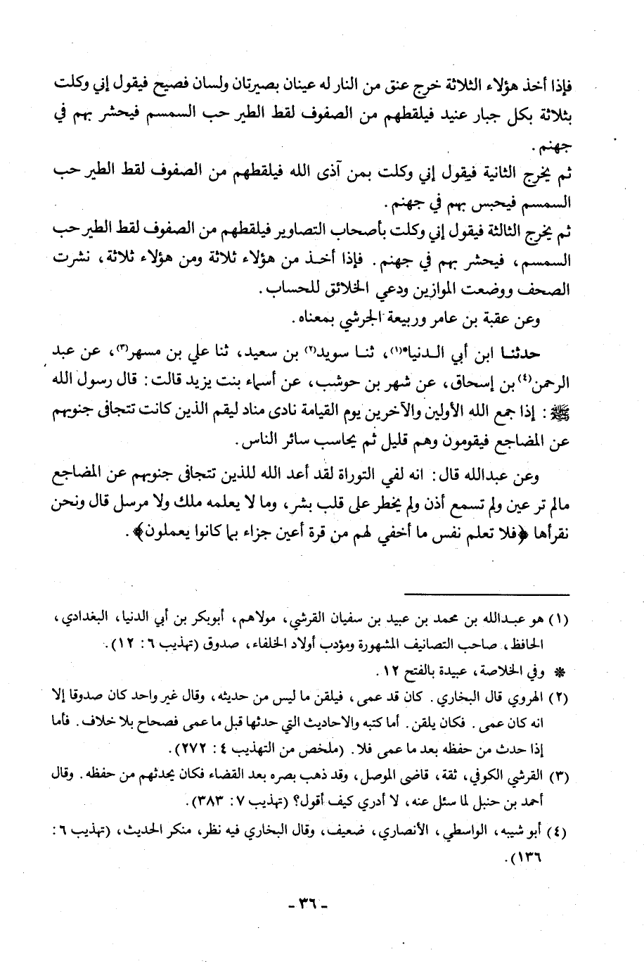 حَدَّثَنَا ابْنُ أَبِي الدُّنْيَا، ثنا سُوَيْدُ بْنُ سَعِيدٍ، ثنا عَلِيُّ بْنُ مُسْهِرٍ، عَنْ عَبْدِ الرَّحْمَنِ بْنِ إِسْحَاقَ، عَنْ شَهْرِ بْنِ حَوْشَبٍ، عَنْ أَسْمَاءَ بِنْتِ يَزِيدَ، قَالَتْ: قَالَ رَسُولُ اللَّهِ صَلَّى اللَّهُ عَلَيْهِ وَسَلَّمَ: «§إِذَا جَمَعَ اللَّهُ الْأَوَّلِينَ وَالْآخِرِينَ يَوْمَ الْقِيَامَةِ نَادَى مُنَادٍ لِيَقُمِ الَّذِينَ كَانَتْ تَتَجَافَى جُنُوبُهُمْ عَنِ الْمَضَاجِعِ فَيَقُومُونَ وَهُمْ قَلِيلٌ، ثُمَّ يُحَاسَبُ سَائِرُ النَّاسِ» وَعَنْ عَبْدِ اللَّهِ قَالَ: أَنَّهُ لَفِي التَّوْرَاةِ لَقَدْ أَعَدَّ اللَّهُ لِلَّذِينَ تَتَجَافَى جُنُوبُهُمْ عَنِ الْمَضَاجِعِ مَا لَمْ تَرَ عَيْنٌ وَلَمْ تَسْمَعْ أُذُنٌ وَلَمْ يَخْطُرْ عَلَى قَلْبِ بَشَرٍ، وَمَا لَا يَعْلَمْهُ مَلَكٌ وَلَا مُرْسَلٌ قَالَ: وَنَحْنُ نَقْرَأُ {فَلَا تَعْلَمُ نَفْسٌ مَا أُخْفِيَ لَهُمْ مِنْ قُرَّةِ أَعْيُنٍ جَزَاءً بِمَا كَانُوا يَعْمَلُونَ} [السجدة: 17]-[37]- وَعَنِ ابْنِ عَبَّاسٍ: كَانَ عَرْشُ اللَّهِ عَلَى الْمَاءِ، فَاتَّخَذَ لِنَفْسِهِ جَنَّةً، ثُمَّ اتَّخَذَ أُخْرَى فَأَطْبَقَهَا بِلُؤْلُؤَةٍ وَاحِدَةٍ. ثُمَّ قَالَ: وَمِنْ دُونِهِمَا جَنَّتَانِ لَا يَعْلَمُ الْخَلْقُ مَا فِيهِمَا. ثُمَّ قَرَأَ: {فَلَا تَعْلَمُ نَفْسٌ مَا أُخْفِيَ لَهُمْ مِنْ قُرَّةِ أَعْيُنٍ} [السجدة: 17] تَأْتِيهِمْ فِيهَا كُلَّ يَوْمٍ تُحْفَةٌ