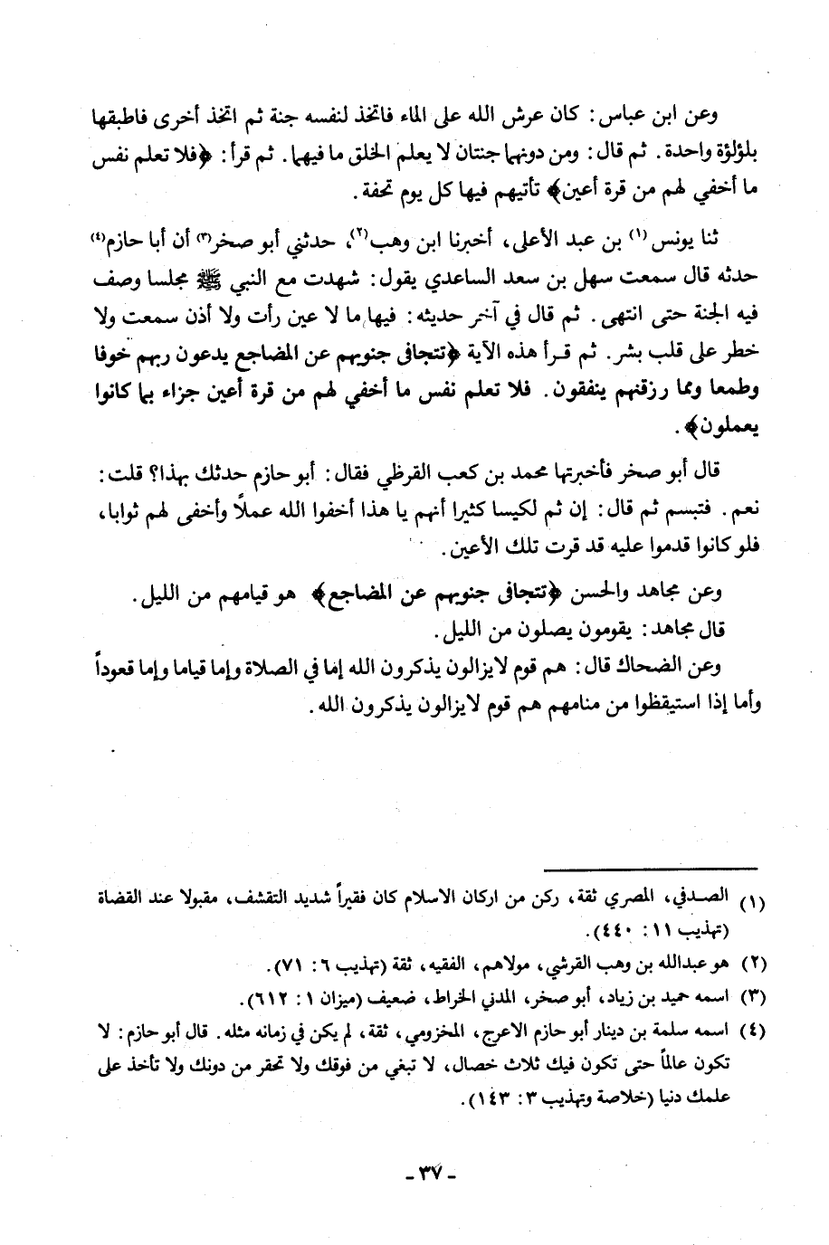 ثنا يُونُسُ بْنُ عَبْدِ الْأَعْلَى، أَخْبَرَنَا ابْنُ وَهْبٍ، حَدَّثَنِي أَبُو صَخْرٍ، أَنَّ أَبَا حَازِمٍ، حَدَّثَهُ، قَالَ: سَمِعْتُ سَهْلَ بْنَ سَعْدٍ السَّاعِدِيَّ، يَقُولُ: شَهِدْتُ مَعَ النَّبِيِّ صَلَّى اللَّهُ عَلَيْهِ وَسَلَّمَ مَجْلِسًا وَصَفَ فِيهِ الْجَنَّةَ حَتَّى انْتَهَى. ثُمَّ قَالَ فِي آخِرِ حَدِيثِهِ: «§فِيهَا مَا لَا عَيْنٌ رَأَتْ وَلَا أُذُنٌ سَمِعَتْ وَلَا خَطَرَ عَلَى قَلْبِ بَشَرٍ» ثُمَّ قَرَأَ هَذِهِ الْآيَةَ {تَتَجَافَى جُنُوبُهُمْ عَنِ الْمَضَاجِعِ يَدْعُونَ رَبَّهُمْ خَوْفًا وَطَمَعًا وَمِمَّا رَزَقْنَاهُمْ يُنْفِقُونَ فَلَا تَعْلَمُ نَفْسٌ مَا أُخْفِيَ لَهُمْ مِنْ قُرَّةِ أَعْيُنٍ جَزَاءً بِمَا كَانُوا يَعْمَلُونَ} [السجدة: 17] " قَالَ أَبُو صَخْرٍ فَأَخْبَرْتُهَا مُحَمَّدَ بْنَ كَعْبٍ الْقُرَظِيَّ فَقَالَ: أَبُو حَازِمٍ حَدَّثَكَ بِهَذَا؟ قُلْتُ: نَعَمْ. فَتَبَسَّمَ ثُمَّ قَالَ: إِنْ ثَمَّ لَكَيِّسًا كَثِيرًا، أَنَّهُمْ يَا هَذَا أَخْفَوُا اللَّهَ عَمَلًا وَأَخْفَى لَهُمْ ثَوَابًا، فَلَوْ كَانُوا قَدِمُوا عَلَيْهِ قَدْ قَرَّتْ تِلْكَ الْأَعْيُنُ وَعَنْ مُجَاهِدٍ وَالْحَسَنِ {تَتَجَافَى جُنُوبُهُمْ عَنِ الْمَضَاجِعِ} [السجدة: 16] هُوَ قِيَامُهُمْ مِنَ اللَّيْلِ قَالَ مُجَاهِدٌ: يَقُومُونَ يُصَلُّونَ مِنَ اللَّيْلِ وَعَنِ الضَّحَّاكِ قَالَ: هُمْ قَوْمٌ لَا يَزَالُونَ يَذْكُرُونَ اللَّهَ إِمَّا فِي الصَّلَاةِ وَإِمَّا قِيَامًا وَإِمَّا قُعُودًا، وَأَمَّا إِذَا اسْتَيْقَظُوا مِنْ مَنَامِهِمْ هُمْ قَوْمُ لَا يَزَالُونَ يَذْكُرُونَ اللَّهَ