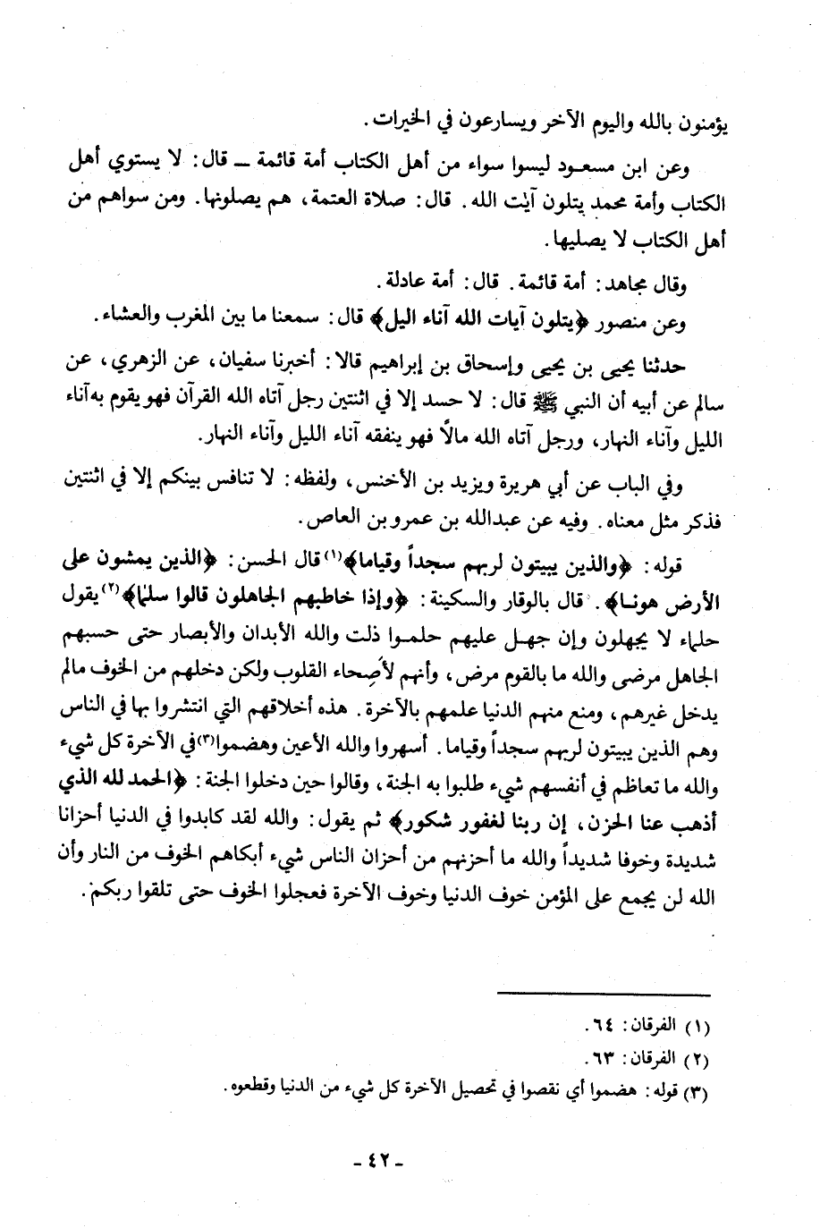حَدَّثَنَا يَحْيَى بْنُ يَحْيَى، وَإِسْحَاقُ بْنُ إِبْرَاهِيمَ، قَالَا: أَخْبَرَنَا سُفْيَانُ، عَنِ الزُّهْرِيِّ، عَنْ سَالِمٍ، عَنْ أَبِيهِ، أَنَّ النَّبِيَّ صَلَّى اللَّهُ عَلَيْهِ وَسَلَّمَ قَالَ: " §لَا حَسَدَ إِلَّا فِي اثْنَتَيْنِ: رَجُلٌ آتَاهُ اللَّهُ الْقُرْآنَ فَهُوَ يَقُومُ بِهِ آنَاءَ اللَّيْلِ وَآنَاءَ النَّهَارِ، وَرَجُلٌ آتَاهُ اللَّهُ مَالًا فَهُوَ يُنْفِقُهُ آنَاءَ اللَّيْلِ وَآنَاءَ النَّهَارِ " وَفِي الْبَابِ عَنْ أَبِي هُرَيْرَةَ، وَيَزِيدِ بْنِ الْأَخْنَسِ، وَلَفْظُهُ: «لَا تَنَافُسَ بَيْنَكُمْ إِلَّا فِي اثْنَتَيْنِ»، فَذَكَرَ مِثْلَ مَعْنَاهُ، وَفِيهِ عَنْ عَبْدِ اللَّهِ بْنِ عَمْرِو بْنِ الْعَاصِ قَوْلُهُ: {وَالَّذِينَ يَبِيتُونَ لِرَبِّهِمْ سُجَّدًا وَقِيَامًا} [الفرقان: 64] قَالَ الْحَسَنُ: {الَّذِينَ يَمْشُونَ عَلَى الْأَرْضِ هَوْنًا} [الفرقان: 63]. قَالَ: بِالْوَقَارِ وَالسَّكِينَةِ: {وَإِذَا خَاطَبَهُمُ الْجَاهِلُونَ قَالُوا سَلَامًا} [الفرقان: 63] يَقُولُ: حُلَمَاءُ لَا يَجْهَلُونُ وَإِنْ جُهِلَ عَلَيْهِمْ حَلُمُوا، ذَلَّتْ وَاللَّهِ الْأَبْدَانُ وَالْأَبْصَارُ حَتَّى حَسِبَهُمُ الْجَاهِلُ مَرْضَى، وَاللَّهِ مَا بِالْقَوْمِ مَرَضٌ، وَأَنَّهُمْ لَأَصِحَّاءُ الْقُلُوبِ وَلَكِنْ دَخَلَهُمْ مِنَ الْخَوْفِ مَا لَمْ يَدْخُلْ غَيْرَهُمْ، وَمَنَعَ مِنْهُمُ الدُّنْيَا عِلْمُهُمْ بِالْآخِرَةِ. هَذِهِ أَخْلَاقُهُمُ الَّتِي انْتَشَرُوا بِهَا فِي النَّاسِ وَهُمُ الَّذِينَ يَبِتُونَ لِرَبِّهِمْ سُجَّدًا وَقِيَامًا. أَسْهَرُوا وَاللَّهِ الْأَعْيُنَ وَهَضَمُوا فِي الْآخِرَةِ كُلَّ شَيْءٍ، وَاللَّهِ مَا تَعَاظَمَ فِي أَنْفُسِهِمْ شَيْءٌ طَلَبُوا بِهِ الْجَنَّةَ، وَقَالُوا حِينَ دَخَلُوا الْجَنَّةَ: {الْحَمْدُ لِلَّهِ الَّذِي أَذْهَبَ عَنَّا الْحَزَنَ إِنَّ رَبَّنَا لَغَفُورٌ شَكُورٌ} [فاطر: 34]، ثُمَّ يَقُولُ: وَاللَّهِ لَقَدْ كَابَدُوا فِي الدُّنْيَا أَحْزَانًا شَدِيدَةً وَخَوْفًا شَدِيدًا، وَاللَّهِ مَا أَحْزَنَهُمْ مِنْ أَحْزَانِ النَّاسِ شَيْءٌ، أَبْكَاهُمُ الْخَوْفُ مِنَ النَّارِ، وَأَنَّ اللَّهَ لَنْ يَجْمَعَ عَلَى الْمُؤْمِنِ خَوْفَ الدُّنْيَا وَخَوْفَ الْآخِرَةِ، فَعَجِّلُوا الْخَوْفَ حَتَّى تَلْقَوْا رَبَّكُمْ. -[43]- وَكَانَ يَقُولُ: يَا ابْنَ آدَمَ عِفَّ عَنْ مَحَارِمِ اللَّهِ تَكُنْ عَابِدًا، وَارْضَ بِمَا قَسَمَ اللَّهُ لَكَ تَكُنْ غَنِيًّا، وَأَحْسِنْ جِوَارَ مَنْ جَاوَرَكَ مِنَ النَّاسِ تَكُنْ مُسْلِمًا، وَصَاحِبِ النَّاسَ بِالَّذِي تُحِبُّ أَنْ يُصَاحِبُوكَ بِهِ تَكُنْ عَدْلًا. وَإِيَّاكَ وَالضَّحِكَ فَإِنَّ كَثْرَةَ الضَّحِكِ تُمِيتُ الْقَلْبَ. إِنَّهُ قَدْ كَانَ بَيْنَ أَيْدِيكُمْ أَقْوَامٌ يَجْمَعُونَ كَثِيرًا وَيَبْنُونَ شَدِيدًا وَيَأْمَلُونَ بَعِيدًا، فَأَيْنَ هُمْ؟ أَصْبَحَ جَمْعُهُمْ بُورًا، وَأَصْبَحَ أَمَلُهُمْ غُرُورًا، وَأَصْبَحَتْ مَسَاكِنُهُمْ قُبُورًا. يَا ابْنَ آدَمَ، إِنَّكَ مُرْتَهَنٌ بِعِلْمِكَ وَآتٍ عَلَى أَجَلِكَ وَمَعْرُوضٌ عَلَى رَبِّكَ، فَخُذْ مِمَّا فِي يَدَيْكَ لِمَا بَيْنَ يَدَيْكَ عِنْدَ الْمَوْتِ يَأْتِيكَ الْخَيْرُ. يَا ابْنَ آدَمَ، طَإِ الْأَرْضَ بِقَدَمَيْكَ فَإِنَّهَا عَنْ قَلِيلٍ قَبْرُكَ. يَا ابْنَ آدَمَ، إِنَّكَ لَمْ تَزَلْ فِي هَدْمِ عُمْرِكَ مُنْذُ سَقَطْتَ مِنْ بَطْنِ أُمِّكَ. يَا ابْنَ آدَمَ، خَالِطِ النَّاسَ وَزَائِلْهُمْ خَالِطْهُمْ بِبَدَنِكَ وَزَائِلْهُمْ بِقَلْبِكَ وَعِلْمِكَ. يَا ابْنَ آدَمَ، تُحِبُّ أَنْ تُذْكَرَ بِحَسَنَاتِكَ وَتَكْرَهُ أَنْ تُذْكَرَ بِسَيِّئَاتِكَ وَتُبْغِضُ عَلَى الظَّنِّ وَتَغْتَمُّ عَلَى الْيَقِينِ. وَكَانَ يَقُولُ: إِنَّ الْمُؤْمِنِينَ لَمَّا جَاءَتْهُمْ هَذِه