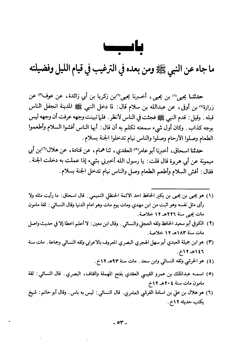 حَدَّثَنَا يَحْيَى بْنُ يَحْيَى، أَخْبَرَنَا يَحْيَى بْنُ زَكَرِيَّا بْنِ أَبِي زَائِدَةَ، عَنْ عَوْفٍ، عَنْ زُرَارَةَ بْنِ أَوْفَى، عَنْ عَبْدِ اللَّهِ بْنِ سَلَّامٍ، قَالَ: لَمَّا دَخَلَ النَّبِيُّ صَلَّى اللَّهُ عَلَيْهِ وَسَلَّمَ الْمَدِينَةَ انْجَفَلَ النَّاسُ قِبَلَهُ، وَقِيلَ: قَدِمَ النَّبِيُّ صَلَّى اللَّهُ عَلَيْهِ وَسَلَّمَ فَجِئْتُ فِي النَّاسِ لَأَنْظُرَ. فَلَمَّا تَبَيَّنْتُ وَجْهَهُ عَرَفْتُ أَنَّ وَجْهَهُ لَيْسَ بِوَجْهِ كَاذِبٍ. وَكَانَ أَوَّلُ شَيْءٍ سَمِعْتُهُ تَكَلَّمَ بِهِ أَنْ قَالَ: «أَيُّهَا النَّاسُ، §أَفْشُوا السَّلَامَ، وَأَطْعِمُوا الطَّعَامَ، وَصِلُوا الْأَرْحَامَ، وَصَلُّوا وَالنَّاسُ نِيَامٌ؛ تَدْخُلُوا الْجَنَّةَ بِسَلَامٍ»