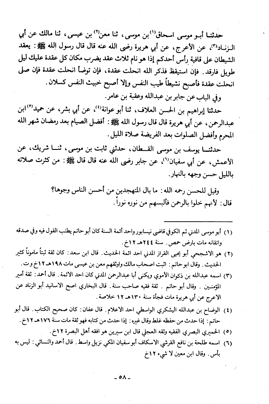 حَدَّثَنَا أَبُو مُوسَى إِسْحَاقُ بْنُ مُوسَى، ثنا مَعْنُ بْنُ عِيسَى، ثنا مَالِكٌ، عَنْ أَبِي الزِّنَادِ، عَنِ الْأَعْرَجِ، عَنْ أَبِي هُرَيْرَةَ، رَضِيَ اللَّهُ عَنْهُ قَالَ: قَالَ رَسُولُ اللَّهِ صَلَّى اللَّهُ عَلَيْهِ وَسَلَّمَ: «§يَعْقِدُ الشَّيْطَانُ عَلَى قَافِيَةِ رَأْسِ أَحَدِكُمْ إِذَا هُوَ نَامَ ثَلَاثَ عُقَدٍ، يَضْرِبُ مَكَانَ كُلِّ عُقْدَةٍ عَلَيْكَ لَيْلٌ طَوِيلٌ فَارْقُدْ. فَإِنِ اسْتَيْقَظَ فَذَكَرَ اللَّهَ انْحَلَّتْ عُقْدَةٌ، فَإِنْ تَوَضَّأَ انْحَلَّتْ عُقْدَةٌ، فَإِنْ صَلَّى انْحَلَّتْ عُقْدَةٌ، فَأَصْبَحَ نَشِيطًا طَيِّبَ النَّفْسِ وَإِلَّا أَصْبَحَ خَبِيثَ النَّفْسِ كَسْلَانَ» وَفِي الْبَابِ عَنْ جَابِرِ بْنِ عَبْدِ اللَّهِ، وَعُقْبَةِ بْنِ عَامِرٍ