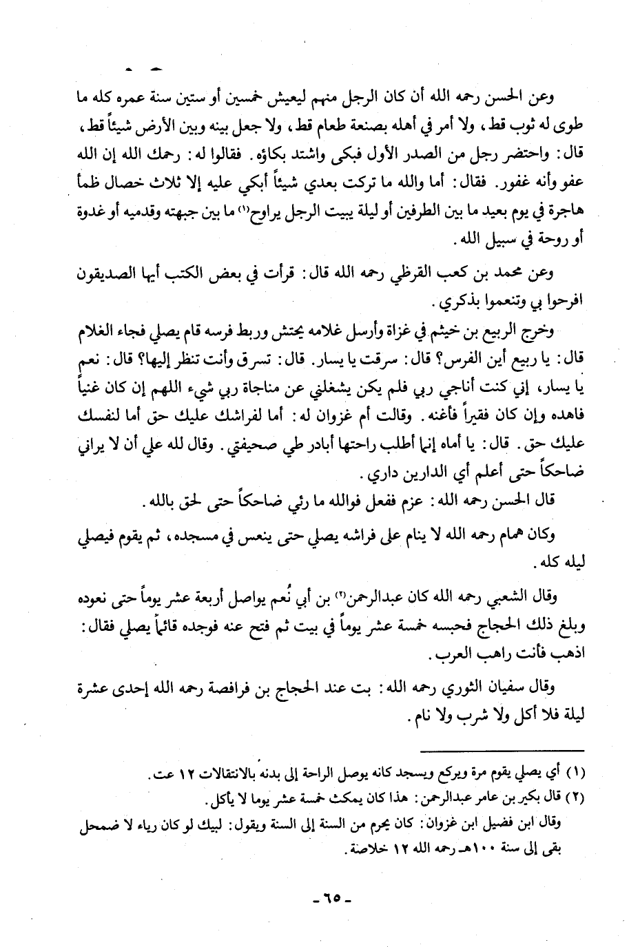 وَعَنِ الْحَسَنِ رَحِمَهُ اللَّهُ أَنْ كَانَ الرَّجُلُ مِنْهُمْ لِيَعِيشَ خَمْسِينَ أَوْ سِتِّينَ سَنَةً عُمْرَهُ كُلَّهُ مَا طُوِيَ لَهُ ثَوْبٌ قَطُّ، وَلَا أَمَرَ فِي أَهْلِهِ بِصَنْعَةِ طَعَامٍ قَطُّ، وَلَا جَعَلَ بَيْنَهُ وَبَيْنَ الْأَرْضِ شَيْئًا قَطُّ، قَالَ: وَاحْتُضِرَ رَجُلٌ مِنَ الصَّدْرِ الْأَوَّلِ فَبَكَى وَاشْتَدَّ بُكَاؤُهُ. فَقَالُوا لَهُ: رَحِمَكَ اللَّهُ إِنَّ اللَّهَ عَفُوٌّ وَإِنَّهُ غَفُورٌ. فَقَالَ: أَمَا وَاللَّهِ مَا تَرَكْتُ بَعْدِي شَيْئًا أَبْكِي عَلَيْهِ إِلَّا ثَلَاثَ خِصَالٍ: ظَمَأَ هَاجِرَةٍ فِي يَوْمٍ بَعِيدٍ مَا بَيْنَ الطَّرَفَيْنِ، أَوْ لَيْلَةً يَبِيتُ الرَّجُلُ يُرَاوِحُ مَا بَيْنَ جَبْهَتِهِ وَقَدَمَيْهِ، أَوْ غَدْوَةً أَوْ رَوْحَةً فِي سَبِيلِ اللَّهِ " وَعَنْ مُحَمَّدِ بْنِ كَعْبٍ الْقُرَظِيِّ رَحِمَهُ اللَّهُ قَالَ: قَرَأْتُ فِي بَعْضِ الْكُتُبِ: أَيُّهَا الصِّدِّيقُونَ، افْرَحُوا بِي وَتَنَعَّمُوا بِذِكْرِي " وَخَرَجَ الرَّبِيعُ بْنُ خَيْثَمَ فِي غَزَاةٍ وَأَرْسَلَ غُلَامَهُ يَحْتَشُّ وَرَبَطَ فَرَسَهُ، قَامَ يُصَلِّي، فَجَاءَ الْغُلَامُ، قَالَ: يَا رَبِيعُ أَيْنَ الْفَرَسُ؟ قَالَ: سُرِقَتْ يَا يَسَارُ. قَالَ: تُسْرَقُ وَأَنْتَ تَنْظُرُ إِلَيْهَا؟ قَالَ: نَعَمْ يَا يَسَارُ، إِنِّي كُنْتُ أُنَاجِي رَبِّي فَلَمْ يَكُنْ يَشْغَلُنِي عَنْ مُنَاجَاةِ رَبِّي شَيْءٌ اللَّهُمَّ إِنْ كَانَ غَنِيًّا فَاهْدِهِ وَإِنْ كَانَ فَقِيرًا فَأَغْنِهِ. وَقَالَتْ أُمُّ غَزْوَانَ لَهُ: أَمَا لِفِرَاشِكَ عَلَيْكَ حَقٌّ أَمَا لِنَفْسِكَ عَلَيْكَ حَقٌّ؟ قَالَ: يَا أُمَّاهُ إِنَّمَا أَطْلُبُ رَاحَتَهَا أُبَادِرُ طَيَّ صَحِيفَتِي. وَقَالَ: لِلَّهِ عَلَيَّ أَنْ لَا يَرَانِي ضَاحِكًا حَتَّى أَعْلَمَ أَيَّ الدَّارَيْنِ دَارِي " قَالَ الْحَسَنُ رَحِمَهُ اللَّهُ: عَزَمَ فَفَعَلَ فَوَاللَّهِ مَا رُئِيَ ضَاحِكًا حَتَّى لَحِقَ بِاللَّهِ وَكَانَ هَمَّامٌ رَحِمَهُ اللَّهُ لَا يَنَامُ عَلَى فِرَاشِهِ يُصَلِّي حَتَّى يَنْعَسَ فِي مَسْجِدِهِ، ثُمَّ يَقُومُ فَيُصَلِّي لَيْلَهُ كُلَّهُ. وَقَالَ الشَّعْبِيُّ: رَحِمَهُ اللَّهُ، كَانَ عَبْدُ الرَّحْمَنِ بْنُ أَبِي نُعْمٍ يُوَاصِلُ أَرْبَعَةَ عَشَرَ يَوْمًا حَتَّى نَعُودَهُ وَبَلَغَ ذَلِكَ الْحَجَّاجَ فَحَبَسَهُ خَمْسَةَ عَشَرَ يَوْمًا فِي بَيْتٍ ثُمَّ فَتَحَ عَنْهُ فَوَجَدَهُ قَائِمًا يُصَلِّي، فَقَالَ: اذْهَبْ فَأَنْتَ رَاهِبُ الْعَرَبِ وَقَالَ سُفْيَانُ الثَّوْرِيُّ رَحِمَهُ اللَّهُ: بِتُّ عِنْدَ الْحَجَّاجِ بْنِ فَرَافِصَةَ رَحِمَهُ اللَّهُ إِحْدَى عَشْرَةَ لَيْلَةً، فَلَا أَكَلَ وَلَا شَرِبَ وَلَا نَامَ.