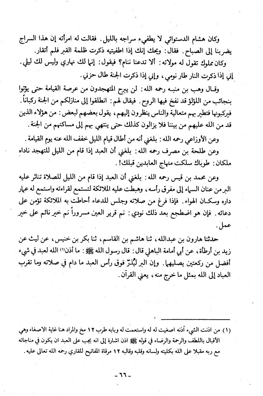 وَكَانَ هِشَامٌ الدَّسْتُوَائِيُّ لَا يُطْفِئُ سِرَاجَهُ بِاللَّيْلِ. فَقَالَتْ لَهُ امْرَأَتُهُ: إِنَّ هَذَا السِّرَاجَ يَضْرِبُنَا إِلَى الصَّبَاحِ. فَقَالَ: وَيْحَكِ إِنَّكِ إِذَا أَطْفَيْتِيهِ ذَكَرْتُ ظُلْمَةَ الْقَبْرِ فَلَمْ أَتَقَارَّ وَكَانَ مَمْلُوكٌ تَقُولُ لَهُ مَوْلَاتُهُ: أَلَا تَدَعُنَا نَنَامُ؟ فَيَقُولُ: إِنَّمَا لَكِ نَهَارِي وَلَيْسَ لَكِ لَيْلِي، إِنِّي إِذَا ذَكَرْتُ النَّارَ طَارَ نَوْمِي، وَإِنِّي إِذَا ذَكَرْتُ الْجَنَّةَ طَالَ حُزْنِي. وَقَالَ وَهْبُ بْنُ مُنَبِّهٍ رَحِمَهُ اللَّهُ: " لَنْ يَبْرَحَ الْمُتَهَجِّدُونَ مِنْ عَرْصَةِ الْقِيَامَةِ حَتَّى يُؤْتُوا بِنَجَائِبَ مِنَ اللُّؤْلُؤِ قَدْ نُفِخَ فِيهَا الرُّوحُ. فَيُقَالُ لَهُمُ: انْطَلِقُوا إِلَى مَنَازِلِكُمْ مِنَ الْجَنَّةِ رُكْبَانًا، فَيَرْكَبُونَهَا فَتَطِيرُ بِهِمْ مُتَعَالِيَةً وَالنَّاسُ يَنْظُرُونَ إِلَيْهِمْ، يَقُولُ بَعْضُهُمْ لِبَعْضٍ: مَنْ هَؤُلَاءِ الَّذِينَ قَدْ مَنَّ اللَّهُ عَلَيْهِمْ مِنْ بَيْنِنَا فَلَا يَزَالُونَ كَذَلِكَ حَتَّى يَنْتَهِيَ بِهِمْ إِلَى مَسَاكِنِهِمْ مِنَ الْجَنَّةِ " وَعَنِ الْأَوْزَاعِيِّ رَحِمَهُ اللَّهُ: بَلَغَنِي أَنَّهُ «مَنْ أَطَالَ قِيَامَ اللَّيْلِ خَفَّفَ اللَّهُ عَنْهُ يَوْمَ الْقِيَامَةِ» وَعَنْ طَلْحَةَ بْنِ مُصَرِّفٍ رَحِمَهُ اللَّهُ: بَلَغَنِي أَنَّ الْعَبْدَ إِذَا قَامَ مِنَ اللَّيْلِ لِلتَّهَجُّدِ نَادَاهُ مَلَكَانِ: طُوبَاكَ سَلَكْتَ مِنْهَاجَ الْعَابِدِينَ قَبْلَكَ " وَعَنْ مُحَمَّدِ بْنِ قَيْسٍ رَحِمَهُ اللَّهُ: بَلَغَنِي أَنَّ الْعَبْدَ إِذَا قَامَ اللَّيْلَ لِلصَّلَاةِ تَنَاثَرَ عَلَيْهِ الْبِرُّ مِنْ عَنَانِ السَّمَاءِ إِلَى مَفْرِقِ رَأْسِهِ، وَهَبَطَتْ عَلَيْهِ الْمَلَائِكَةُ لِتَسْتَمْتِعَ لِقِرَاءَتِهِ، وَاسْتَمَعَ لَهُ عُمَّارُ دَارِهِ وَسُكَّانُ الْهَوَاءِ، فَإِذَا فَرَغَ مِنْ صَلَاتِهِ وَجَلَسَ لِلدُّعَاءِ أَحَاطَتْ بِهِ الْمَلَائِكَةُ تُؤَمِّنُ عَلَى دُعَائِهِ، فَإِنْ هُوَ اضْطَجَعَ بَعْدَ ذَلِكَ نُودِيَ: نَمْ قَرِيرَ الْعَيْنِ مَسْرُورًا نَمْ خَيْرَ نَائِمٍ عَلَى خَيْرِ عَمَلٍ "