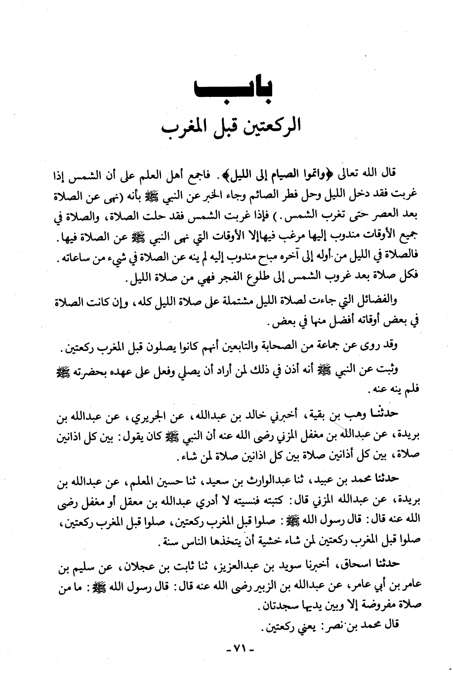 §بَابُ الرَّكْعَتَيْنِ قَبْلَ الْمَغْرِبِ قَالَ اللَّهُ تَعَالَى: {وَأَتِمُّوا الصِّيَامَ إِلَى اللَّيْلِ} فَأَجْمَعَ أَهْلُ الْعِلْمِ عَلَى أَنَّ الشَّمْسَ إِذَا غَرَبَتْ فَقَدْ دَخَلَ اللَّيْلُ وَحَلَّ فِطْرُ الصَّائِمِ وَجَاءَ الْخَبَرُ عَنِ النَّبِيِّ صَلَّى اللَّهُ عَلَيْهِ وَسَلَّمَ بِأَنَّهُ نَهَى عَنِ الصَّلَاةِ بَعْدَ الْعَصْرِ حَتَّى تَغْرُبَ الشَّمْسُ. فَإِذَا غَرَبَتِ الشَّمْسُ فَقَدْ حَلَّتِ الصَّلَاةُ، وَالصَّلَاةُ فِي جَمِيعِ الْأَوْقَاتِ مَنْدُوبٌ إِلَيْهَا مُرَغَّبٌ فِيهَا إِلَّا الْأَوْقَاتِ الَّتِي نَهَى النَّبِيُّ صَلَّى اللَّهُ عَلَيْهِ وَسَلَّمَ عَنِ الصَّلَاةِ فِيهَا. فَالصَّلَاةُ فِي اللَّيْلِ مِنْ أَوَّلِهِ إِلَى آخِرِهِ مُبَاحٌ مَنْدُوبٌ إِلَيْهِ لَمْ يَنْهَ عَنِ الصَّلَاةِ فِي شَيْءٍ مِنْ سَاعَاتِهِ، فَكُلُّ صَلَاةٍ بَعْدَ غُرُوبِ الشَّمْسِ إِلَى طُلُوعِ الْفَجْرِ فَهِيَ مِنْ صَلَاةِ اللَّيْلِ. وَالْفَضَائِلُ الَّتِي جَاءَتْ لِصَلَاةِ اللَّيْلِ مُشْتَمِلَةٌ عَلَى صَلَاةِ اللَّيْلِ كُلِّهِ، وَإِنْ كَانَتِ الصَّلَاةُ فِي بَعْضِ أَوْقَاتِهِ أَفْضَلُ مِنْهَا فِي بَعْضٍ. وَقَدْ رُوِيَ عَنْ جَمَاعَةٍ مِنَ الصَّحَابَةِ وَالتَّابِعِينَ أَنَّهُمْ كَانُوا يُصَلُّونَ قَبْلَ الْمَغْرِبِ رَكْعَتَيْنِ. وَثَبَتَ عَنِ النَّبِيِّ صَلَّى اللَّهُ عَلَيْهِ وَسَلَّمَ أَنَّهُ أَذِنَ فِي ذَلِكَ لِمَنْ أَرَادَ أَنْ يُصَلِّيَ وَفَعَلَ عَلَى عَهْدِهِ بِحَضْرَتِهِ صَلَّى اللَّهُ عَلَيْهِ وَسَلَّمَ فَلَمْ يَنْهَ عَنْهُ