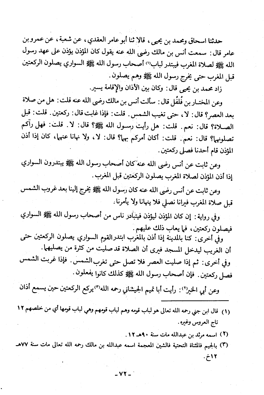 حَدَّثَنَا إِسْحَاقُ، وَمُحَمَّدُ بْنُ يَحْيَى، قَالَا ثنا أَبُو عَامِرٍ الْعَقَدِيٌّ، عَنْ شُعْبَةَ، عَنْ عَمْرِو بْنِ عَامِرٍ، قَالَ: سَمِعْتُ أَنَسَ بْنَ مَالِكٍ، رَضِيَ اللَّهُ عَنْهُ يَقُولُ: «§كَانَ الْمُؤَذِّنَ يُؤَذِّنُ عَلَى عَهْدِ رَسُولِ اللَّهِ صَلَّى اللَّهُ عَلَيْهِ وَسَلَّمَ لِصَلَاةِ الْمَغْرِبِ فَيَبْتَدِرُ لُبَابُ أَصْحَابِ رَسُولِ اللَّهِ صَلَّى اللَّهُ عَلَيْهِ وَسَلَّمَ السَّوَارِي يُصَلُّونَ الرَّكْعَتَيْنِ قَبْلَ الْمَغْرِبِ حَتَّى يَخْرُجَ رَسُولُ اللَّهِ صَلَّى اللَّهُ عَلَيْهِ وَسَلَّمَ وَهُمْ يُصَلُّونَ» زَادَ مُحَمَّدُ بْنُ يَحْيَى قَالَ: وَكَانَ بَيْنَ الْأَذَانِ وَالْإِقَامَةِ يَسِيرٌ وَعَنِ الْمُخْتَارِ بْنِ فُلْفُلٍ، قَالَ: سَأَلْتُ أَنَسَ بْنَ مَالِكٍ رَضِيَ اللَّهُ عَنْهُ قُلْتُ: هَلْ مِنْ صَلَاةٍ بَعْدَ الْعَصْرِ؟ قَالَ: " لَا، حَتَّى تَغِيبَ الشَّمْسُ. قُلْتُ: فَإِذَا غَابَتْ؟ قَالَ: رَكْعَتَيْنِ. قُلْتُ: قَبْلَ الصَّلَاةِ؟ قَالَ: نَعَمْ. قُلْتُ: هَلْ رَأَيْتَ رَسُولَ اللَّهِ صَلَّى اللَّهُ عَلَيْهِ وَسَلَّمَ؟ قَالَ: لَا. قُلْتُ: فَهَلْ رَآكُمْ تُصَلُّونَهَا؟ قَالَ: نَعَمْ. قُلْتُ: أَكَانَ أَمَرَكُمْ بِهِمَا؟ قَالَ: لَا، وَلَا نَهَانَا عَنْهُمَا، كَانَ إِذَا أَذَّنَ الْمُؤَذِّنُ قَامَ أَحَدُنَا فَصَلَّى رَكْعَتَيْنِ " وَعَنْ ثَابِتٍ، عَنْ أَنَسٍ رَضِيَ اللَّهُ عَنْهُ: كَانَ أَصْحَابُ رَسُولِ اللَّهِ صَلَّى اللَّهُ عَلَيْهِ وَسَلَّمَ يَبْتَدِرُونَ السَّوَارِي إِذَا أَذَّنَ الْمُؤَذِّنُ لِصَلَاةِ الْمَغْرِبِ يُصَلُّونَ الرَّكْعَتَيْنِ قَبْلَ الْمَغْرِبِ وَعَنْ ثَابِتٍ، عَنْ أَنَسٍ رَضِيَ اللَّهُ عَنْهُ: «كَانَ رَسُولُ اللَّهِ صَلَّى اللَّهُ عَلَيْهِ وَسَلَّمَ يَخْرُجُ إِلَيْنَا بَعْدَ غُرُوبِ الشَّمْسِ قَبْلَ صَلَاةِ الْمَغْرِبِ فَيَرَانَا نُصَلِّي فَلَا يَنْهَانَا وَلَا يَأْمُرُنَا» وَفِي رِوَايَةٍ: إِنْ كَانَ الْمُؤَذِّنُ لِيُؤَذِّنَ فَيَتَبَادَرُ نَاسٌ مِنْ أَصْحَابِ رَسُولِ اللَّهِ صَلَّى اللَّهُ عَلَيْهِ وَسَلَّمَ السَّوَارِي، فَيُصَلُّونَ رَكْعَتَيْنِ، فَمَا يُعَابُ ذَلِكَ عَلَيْهِمْ وَفِي أُخْرَى: «كُنَّا بِالْمَدِينَةِ إِذَا أُذِّنَ بِالْمَغْرِبِ ابْتَدَرَ الْقَوْمُ السَّوَارِيَ يُصَلُّونَ رَكْعَتَيْنِ حَتَّى أَنَّ الْغَرِيبَ لِيَدْخُلُ الْمَسْجِدَ فَيَرى أَنَّ الصَّلَاةَ قَدْ صُلِّيَتْ مِنْ كَثْرَةِ مَنْ يُصَلِّيهَا» وَفِي أُخْرَى: «ثُمَّ إِذَا صَلَّيْتَ الْعَصْرَ فَلَا تُصَلِّ حَتَّى تَغْرُبَ الشَّمْسُ. فَإِذَا غَرَبَتِ الشَّمْسُ فَصَلِّ رَكْعَتَيْنِ. فَإِنَّ أَصْحَابَ رَسُولِ اللَّهِ صَلَّى اللَّهُ عَلَيْهِ وَسَلَّمَ كَذَلِكَ كَانُوا يَفْعَلُونَ» وَعَنْ أَبِي الْخَيْرِ: رَأَيْتُ أَبَا تَمِيمٍ الْجَيْشَانِيَّ رَحِمَهُ اللَّهُ يَرْكَعُ الرَّكْعَتَيْنِ حِينَ يَسْمَعُ أَذَانَ -[73]- الْمَغْرِبِ. فَأَتَيْتُ عُقْبَةَ بْنَ عَامِرٍ الْجُهَنِيَّ رَضِيَ اللَّهُ عَنْهُ فَقُلْتُ لَهُ: لَا أَعْجَبَكَ مِنْ أَبِي تَمِيمٍ الْجَيْشَانِيِّ عَبْدِ اللَّهِ بْنِ مَالِكٍ رَحِمَهُ اللَّهُ يَرْكَعُ رَكْعَتَيْنِ قَبْلَ الْمَغْرِبِ وَأَنَا أُرِيدُ أَنْ أَغْمِصُهُ. فَقَالَ عُقْبَةُ رَضِيَ اللَّهُ عَنْهُ: إِنَّمَا كُنَّا نَفْعَلُهُ عَلَى عَهْدِ رَسُولِ اللَّهِ صَلَّى اللَّهُ عَلَيْهِ وَسَلَّمَ فَمَا يَمْنَعُكَ الْآنَ؟ قَالَ: الشُّغْلُ " وَعَنْ عَبْدِ الرَّحْمَنِ بْنِ عَوْفٍ رَضِيَ اللَّهُ عَنْهُ قَالَ: «كُنَّا نَرْكَعُهُمَا إِذَا زَاحَمْنَا بَيْنَ الْآذَانِ وَالْإِقَامَةِ فِي الْمَغْرِبِ» وَعَنْ زِرٍّ رَحِمَهُ اللَّهُ: قَدِمْتُ الْمَدِينَةَ فَلَزِمْتُ عَبْدَ الرَّحْمَنِ بْنَ عَوْفٍ رَضِيَ اللَّهُ عَنْهُ وَأُبَيَّ بْنَ كَعْبٍ رَضِيَ الل