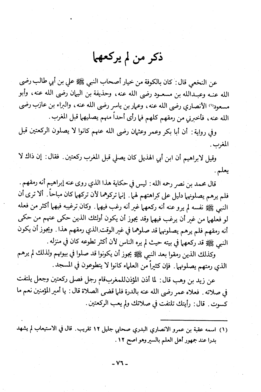 §ذِكْرُ مَنْ لَمْ يَرْكَعْهُمَا عَنِ النَّخَعِيِّ قَالَ: «كَانَ بِالْكُوفَةِ مِنْ خِيَارِ أَصْحَابِ النَّبِيِّ صَلَّى اللَّهُ عَلَيْهِ وَسَلَّمَ عَلِيُّ بْنُ أَبِي طَالِبٍ رَضِيَ اللَّهُ عَنْهُ، وَعَبْدُ اللَّهِ بْنُ مَسْعُودٍ رَضِيَ اللَّهُ عَنْهُ، وَحُذَيْفَةُ بْنُ الْيَمَانِ رَضِيَ اللَّهُ عَنْهُ، وَأَبُو مَسْعُودٍ الْأَنْصَارِيُّ رَضِيَ اللَّهُ عَنْهُ، وَعَمَّارُ بْنُ يَاسِرٍ رَضِيَ اللَّهُ عَنْهُ، وَالْبَرَاءُ بْنُ عَازِبٍ رَضِيَ اللَّهُ عَنْهُ، فَأَخْبَرَنِي مَنْ رَمَقَهُمْ كُلَّهُمْ فَمَا رَأَى أَحَدًا مِنْهُمْ يُصَلِّيهِمَا قَبْلَ الْمَغْرِبِ» وَفِي رِوَايَةٍ: أَنَّ أَبَا بَكْرٍ وَعُمَرَ وَعُثْمَانَ رَضِيَ اللَّهُ عَنْهُمْ كَانُوا لَا يُصَلُّونَ الرَّكْعَتَيْنِ قَبْلَ الْمَغْرِبِ. وَقِيلَ لِإِبْرَاهِيمَ: إِنَّ ابْنَ أَبِي الْهُذَيْلِ كَانَ يُصَلِّي قَبْلَ الْمَغْرِبِ رَكْعَتَيْنِ. فَقَالَ: إِنَّ ذَاكَ لَا يُعْلَمُ " قَالَ مُحَمَّدُ بْنُ نَصْرٍ رَحِمَهُ اللَّهُ: لَيْسَ فِي حِكَايَةِ هَذَا الَّذِي رَوَى عَنْهُ إِبْرَاهِيمُ أَنَّهُ رَمَقَهُمْ فَلَمْ يَرَهُمْ يُصَلُّونَهُمَا دَلِيلٌ عَلَى كَرَاهَتِهِمْ لَهُمَا. إِنَّمَا تَرَكُوهُمَا لَأَنَّ تَرْكَهُمَا كَانَ مُبَاحًا. أَلَا تَرَى أَنَّ النَّبِيَّ صَلَّى اللَّهُ عَلَيْهِ وَسَلَّمَ نَفْسَهُ لَمْ يُرْوَ عَنْهُ أَنَّهُ رَكَعَهُمَا غَيْرَ أَنَّهُ رَغَّبَ فِيهِمَا. وَكَانَ تَرْغِيبُهُ فِيهِمَا أَكْثَرَ مِنْ فِعْلِهِ لَوْ فَعَلَهُمَا مِنْ غَيْرِ أَنْ يُرَغِّبَ فِيهِمَا وَقَدْ يَجُوزُ أَنْ يَكُونَ أُولَئِكَ الَّذِينَ حَكَى عَنْهُمْ مَنْ حَكَى أَنَّهُ رَمَقَهُمَ فَلَمْ يَرَهُمْ يُصَلُّونَهَا قَدْ صَلُّوهُمَا فِي غَيْرِ الْوَقْتِ الَّذِي رَمَقَهُمْ هَذَا. وَيَجُوزُ أَنْ يَكُونَ النَّبِيُّ صَلَّى اللَّهُ عَلَيْهِ وَسَلَّمَ قَدْ رَكَعَهُمَا فِي بَيْتِهِ حَيْثُ لَمْ يَرَهِ النَّاسُ لَأَنَّ أَكْثَرَ تَطَوُّعِهِ كَانَ فِي مَنْزِلِهِ. وَكَذَلِكَ الَّذِينَ رَمَقُوا بَعْدُ النَّبِيَّ صَلَّى اللَّهُ عَلَيْهِ وَسَلَّمَ يَجُوزُ أَنْ يَكُونُوا قَدْ صَلُّوا فِي بُيُوتَهُمْ وَلِذَلِكَ لَمْ يَرَهُمُ الَّذِي رَمَقَهُمْ يُصَلُّونَهَا. فَإِنَّ كَثِيرًا مِنَ الْعُلَمَاءِ كَانُوا لَا يَتَطَوَّعُونَ فِي الْمَسْجِدِ. عَنْ زَيْدِ بْنِ وَهْبٍ قَالَ: " لَمَّا أَذَّنَ الْمُؤَذِّنُ لِلْمَغْرِبِ قَامَ رَجُلٌ فَصَلَّى رَكْعَتَيْنِ وَجَعَلَ يَلْتَفِتُ فِي صَلَاتِهِ. فَعَلَاهُ عُمَرُ رَضِيَ اللَّهُ عَنْهُ بِالدِّرَّةِ فَلَمَّا قَضَى الصَّلَاةَ قَالَ: يَا أَمِيرَ الْمُؤْمِنِينَ نِعْمَ مَا كَسَوْتَ. قَالَ: رَأَيْتُكَ تَلْتَفِتُ فِي صَلَاتِكَ، وَلَمْ يَعِبِ الرَّكْعَتَيْنِ "