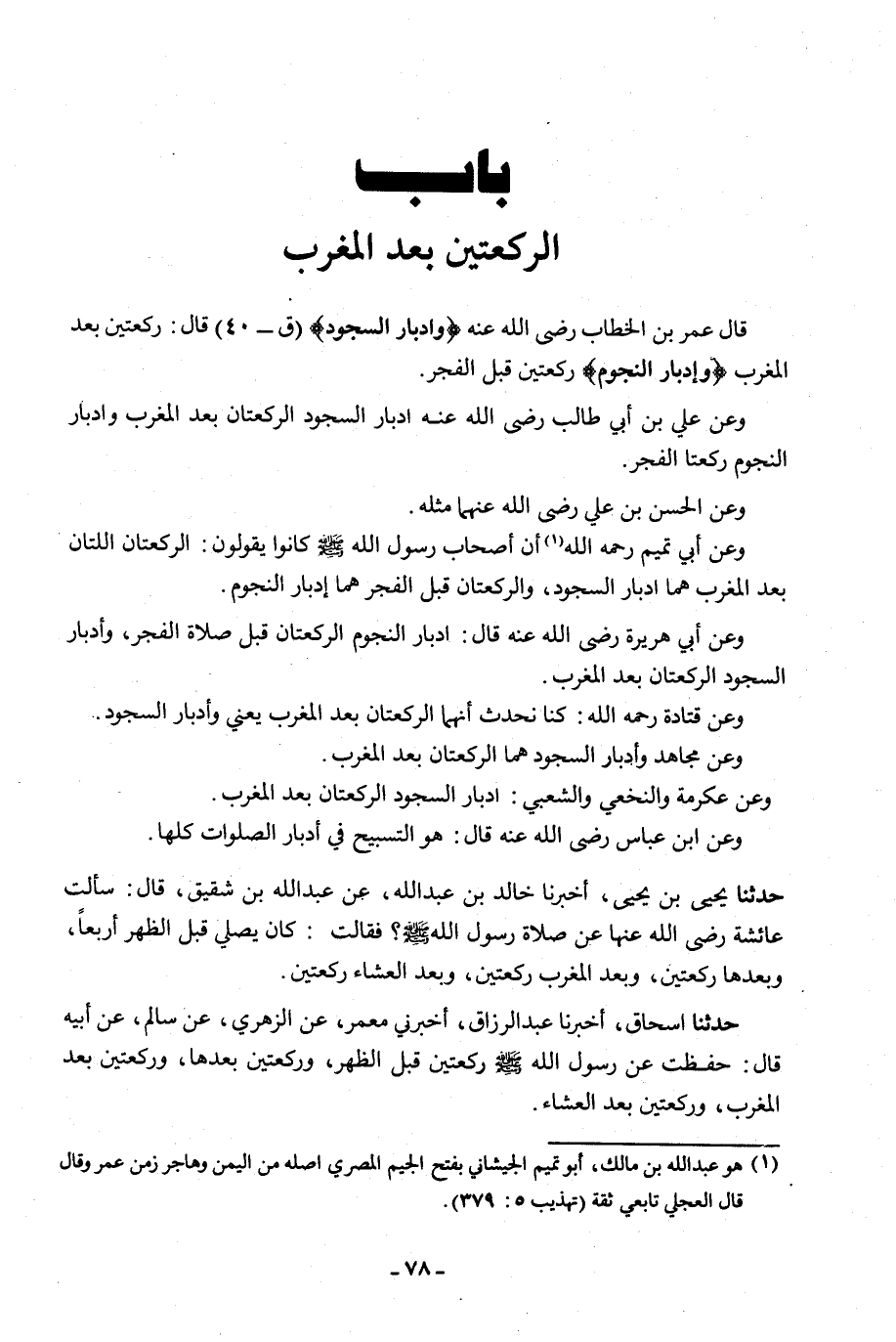 §بَابُ الرَّكْعَتَيْنِ بَعْدَ الْمَغْرِبِ قَالَ عُمَرُ بْنُ الْخَطَّابِ رَضِيَ اللَّهُ عَنْهُ {وَأَدْبَارَ السُّجُودِ} [ق: 40] قَالَ: " رَكْعَتَيْنِ بَعْدَ الْمَغْرِبِ، {وَإِدْبَارَ النُّجُومِ} [الطور: 49] رَكْعَتَيْنِ قَبْلَ الْفَجْرِ «وَعَنْ عَلِيِّ بْنِ أَبِي طَالِبٍ رَضِيَ اللَّهُ عَنْهُ» أَدْبَارُ السُّجُودِ الرَّكْعَتَانِ بَعْدَ الْمَغْرِبِ، وَأَدْبَارُ النُّجُومِ رَكْعَتَا الْفَجْرِ " وَعَنِ الْحَسَنِ بْنِ عَلِيٍّ رَضِيَ اللَّهُ عَنْهُمَا مِثْلَهُ. وَعَنْ أَبِي تَمِيمٍ رَحِمَهُ اللَّهُ أَنَّ أَصْحَابَ رَسُولِ اللَّهِ صَلَّى اللَّهُ عَلَيْهِ وَسَلَّمَ كَانُوا يَقُولُونَ: «الرَّكْعَتَانِ اللَّتَانِ بَعْدَ الْمَغْرِبِ هُمَا أَدْبَارُ السُّجُودِ، وَالرَّكْعَتَانِ قَبْلَ الْفَجْرِ هُمَا إِدْبَارُ النُّجُومِ» وَعَنْ أَبِي هُرَيْرَةَ رَضِيَ اللَّهُ عَنْهُ قَالَ: " {إِدْبَارُ النُّجُومِ} [الطور: 49] الرَّكْعَتَانِ قَبْلَ صَلَاةِ الْفَجْرِ، {وَأَدْبَارُ السُّجُودُ} [ق: 40] الرَّكْعَتَانِ بَعْدَ الْمَغْرِبِ " وَعَنْ قَتَادَةَ رَحِمَهُ اللَّهُ: " كُنَّا نُحَدِّثُ أَنَّهُمَا الرَّكْعَتَانِ بَعْدَ الْمَغْرِبِ يَعْنِي {وَأَدْبَارَ السُّجُودِ} [ق: 40] «وَعَنْ مُجَاهِدٍ» {وَأَدْبَارَ السُّجُودِ} [ق: 40] هُمَا الرَّكْعَتَانِ بَعْدَ الْمَغْرِبِ " وَعَنْ عِكْرِمَةَ وَالنَّخَعِيِّ وَالشَّعْبِيِّ: " {أَدْبَارَ السُّجُودِ} [ق: 40] الرَّكْعَتَانِ بَعْدَ الْمَغْرِبِ " وَعَنِ ابْنِ عَبَّاسٍ رَضِيَ اللَّهُ عَنْهُ قَالَ: «هُوَ التَّسْبِيحُ فِي أَدْبَارِ الصَّلَوَاتِ كُلِّهَا»